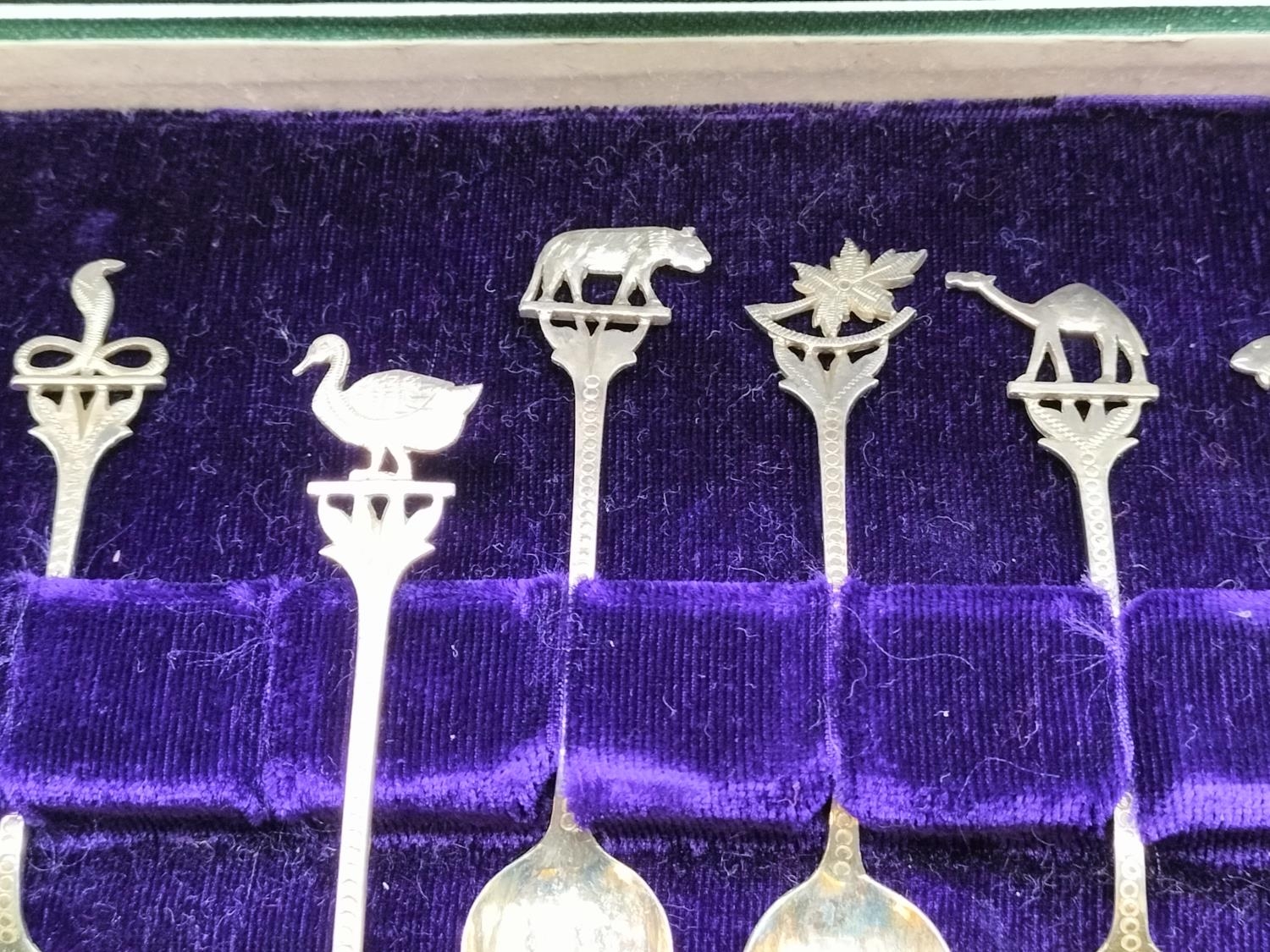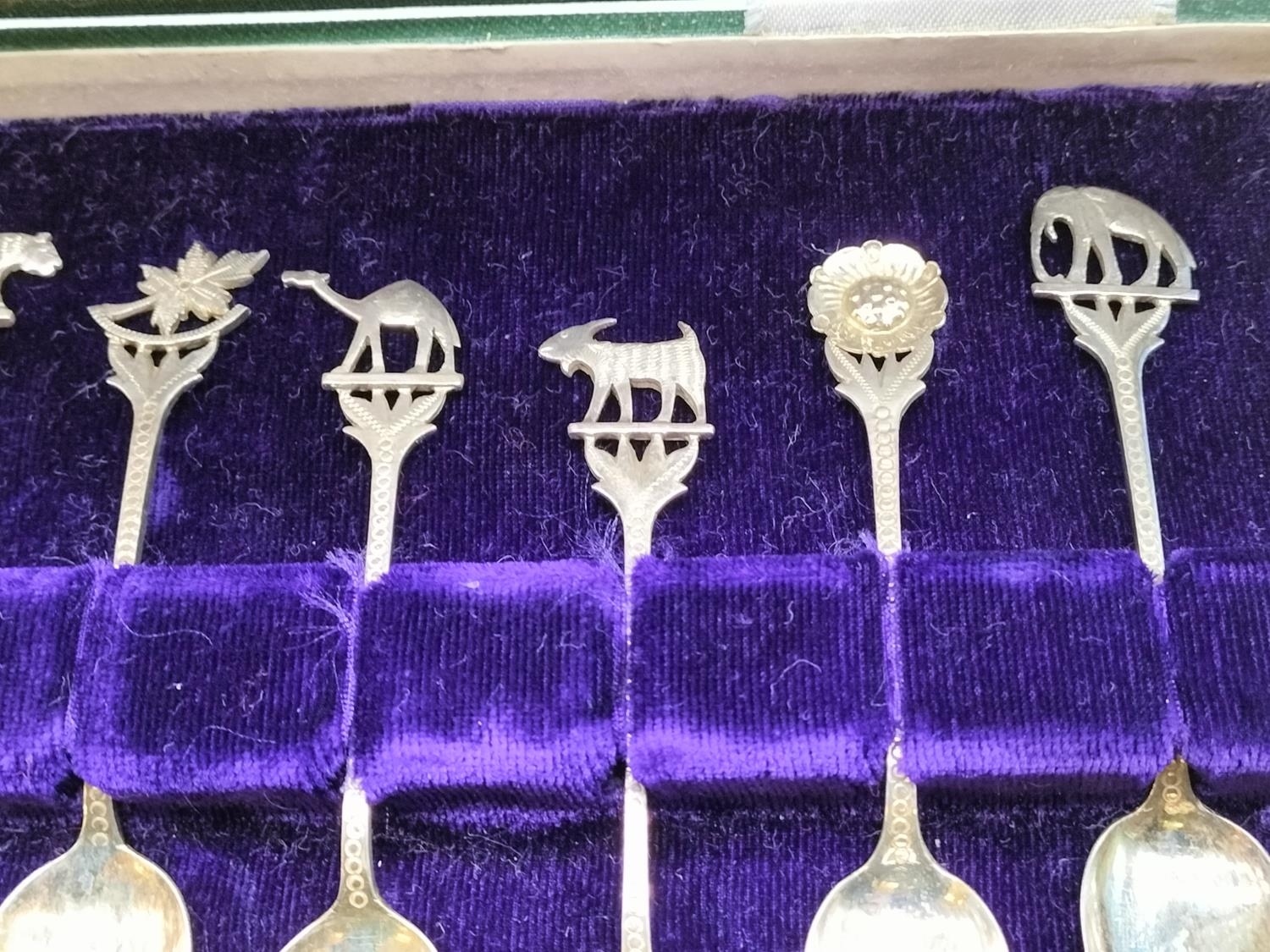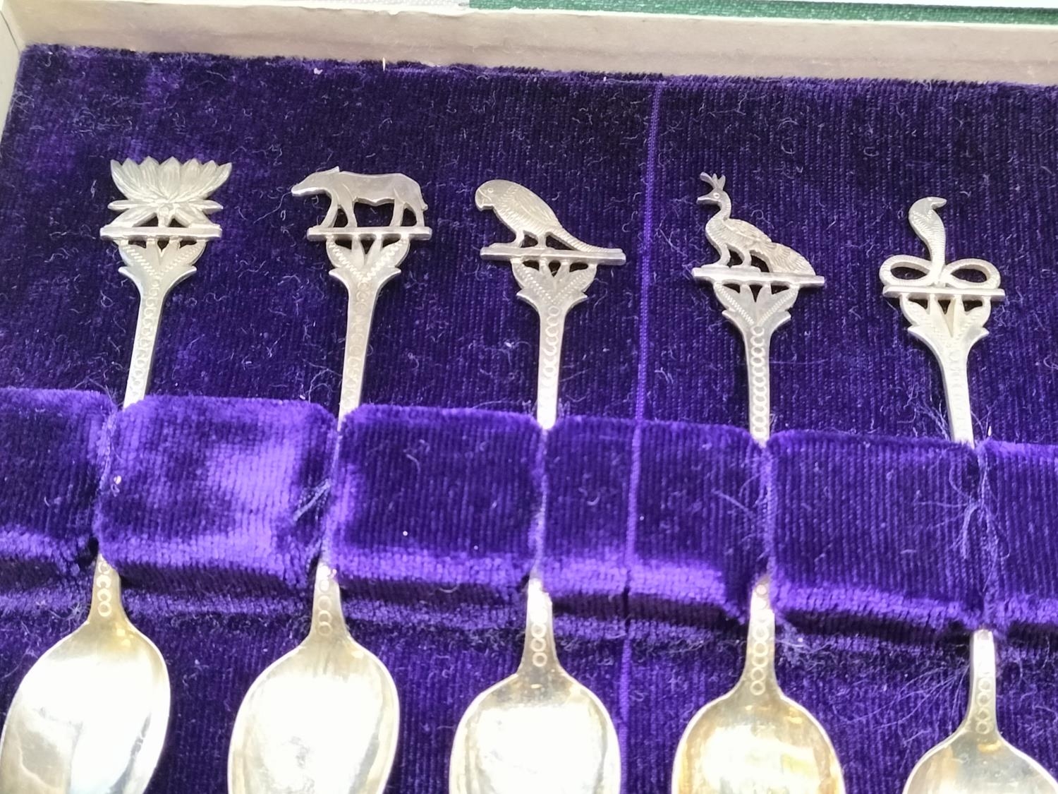 Cased Set of 12 Teaspoons with Middle Eastern/Indian Animal and Flower Handle. Unmarked. Tested As Silver Approximately 98Grams