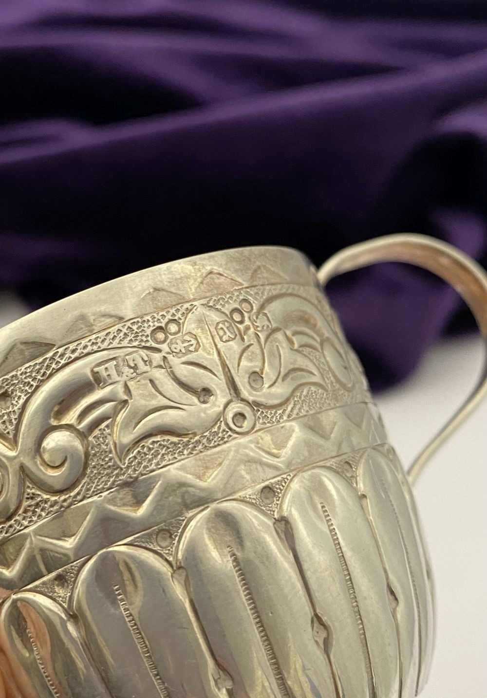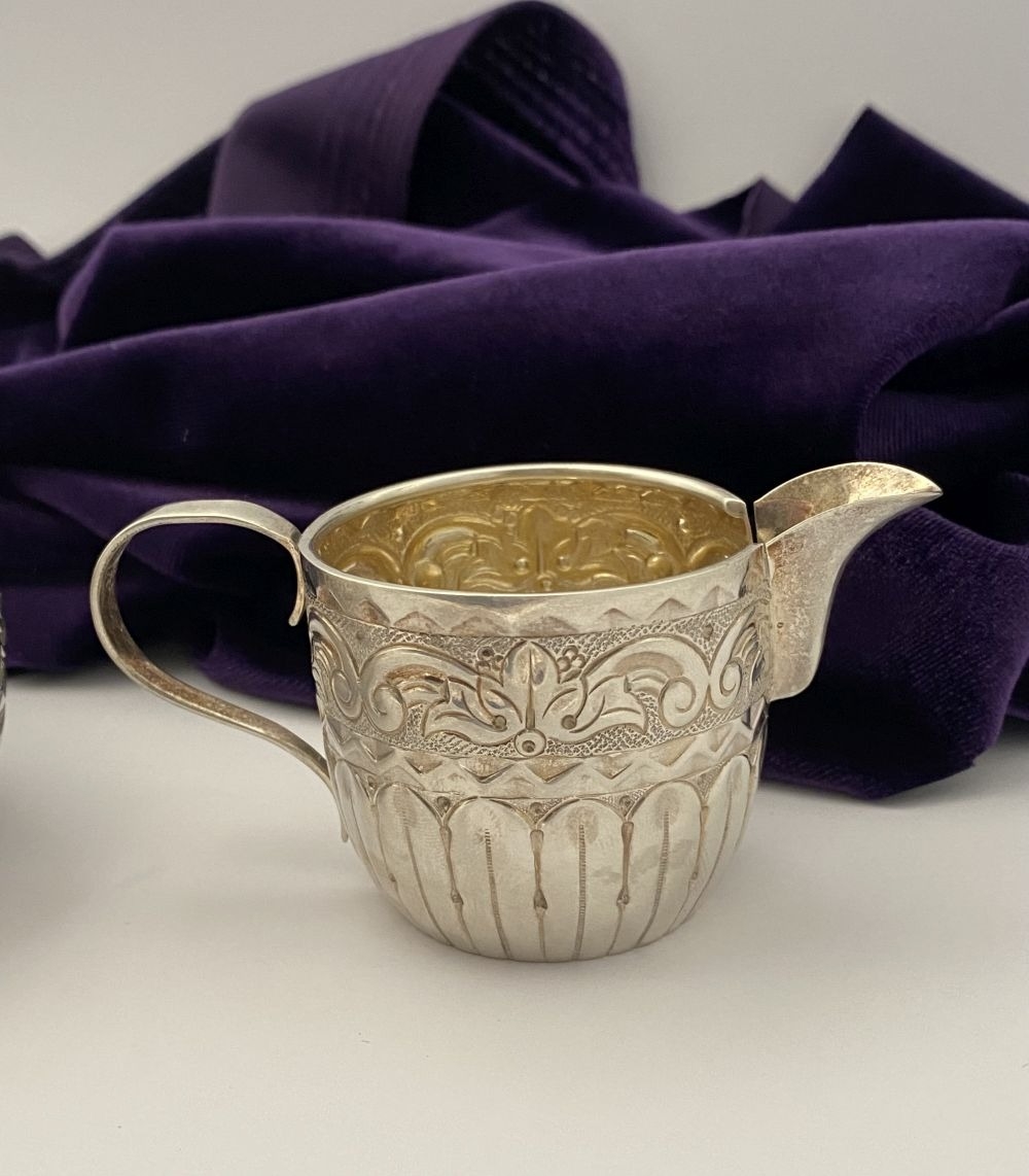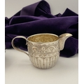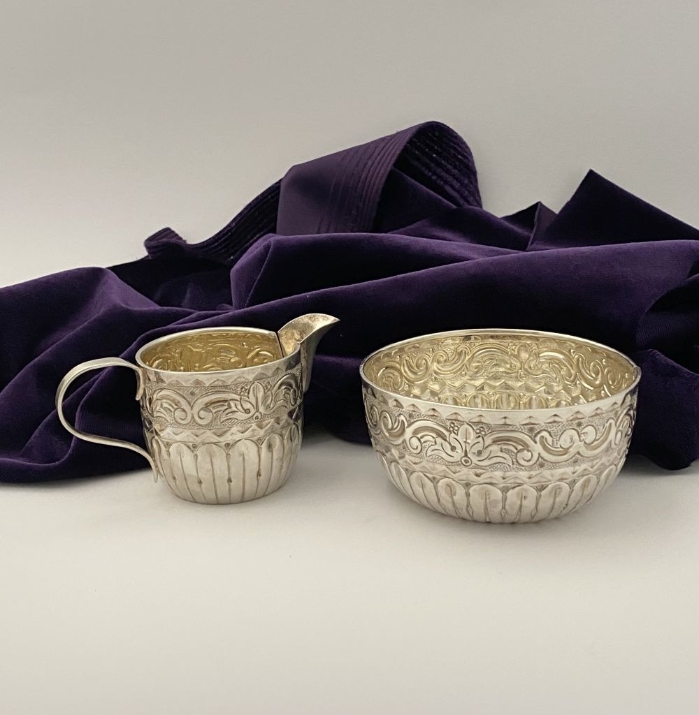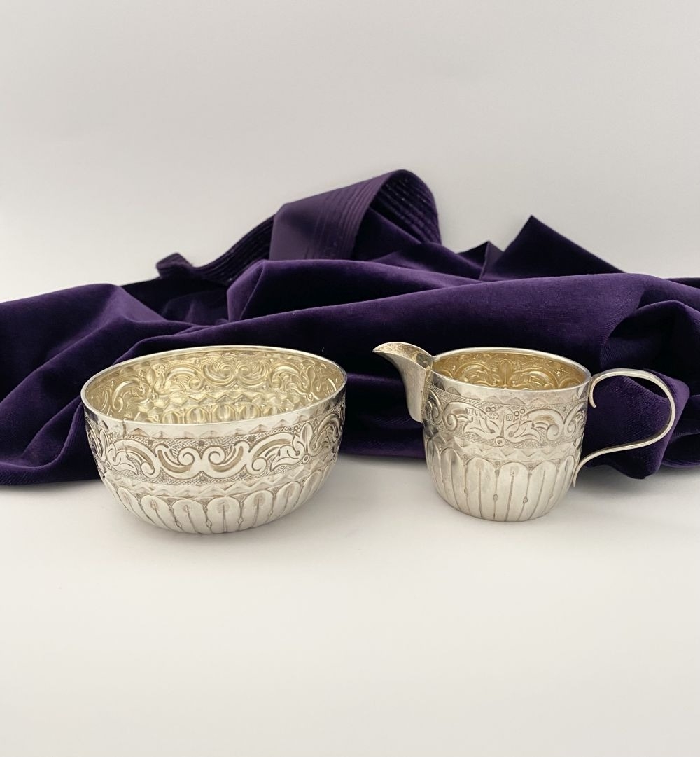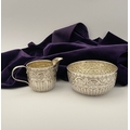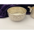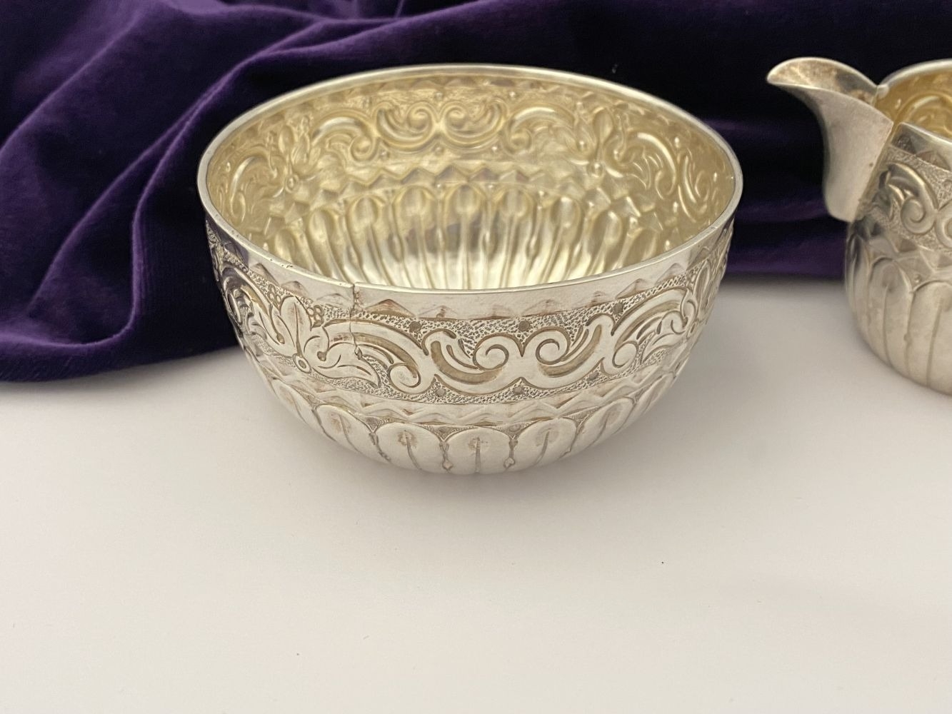 A VICTORIAN SILVER MILK JUG & SUGAR BOWL, by Hilliard & Thomason (John Hilliard & John Thomason trading as Hilliard & Thomason), Spencer Street, Birmingham, with date letters 'w' for 1896 & 'x' for 1897. Both pieces are highly decorated with embossed and chased scrolling foliate panels to centre, with flutes below. Dimensions: milk jug: 5cm high x 9.5cm wide; bowl: 8.5cm diameter x 4cm high. Gross weight: 94g / 3.02 troy oz approx. Condition as photographed with small crack to rim of bowl.