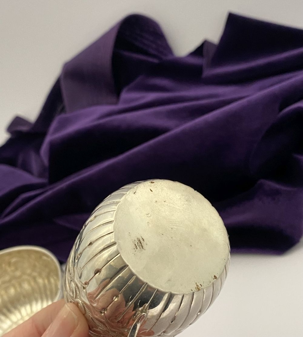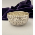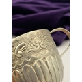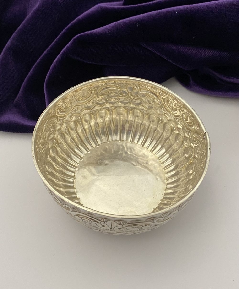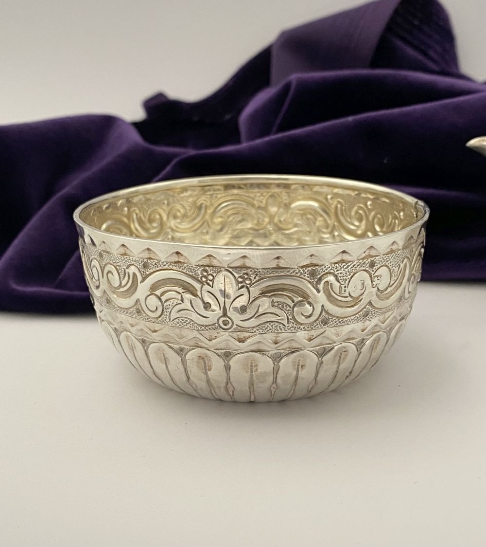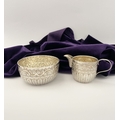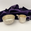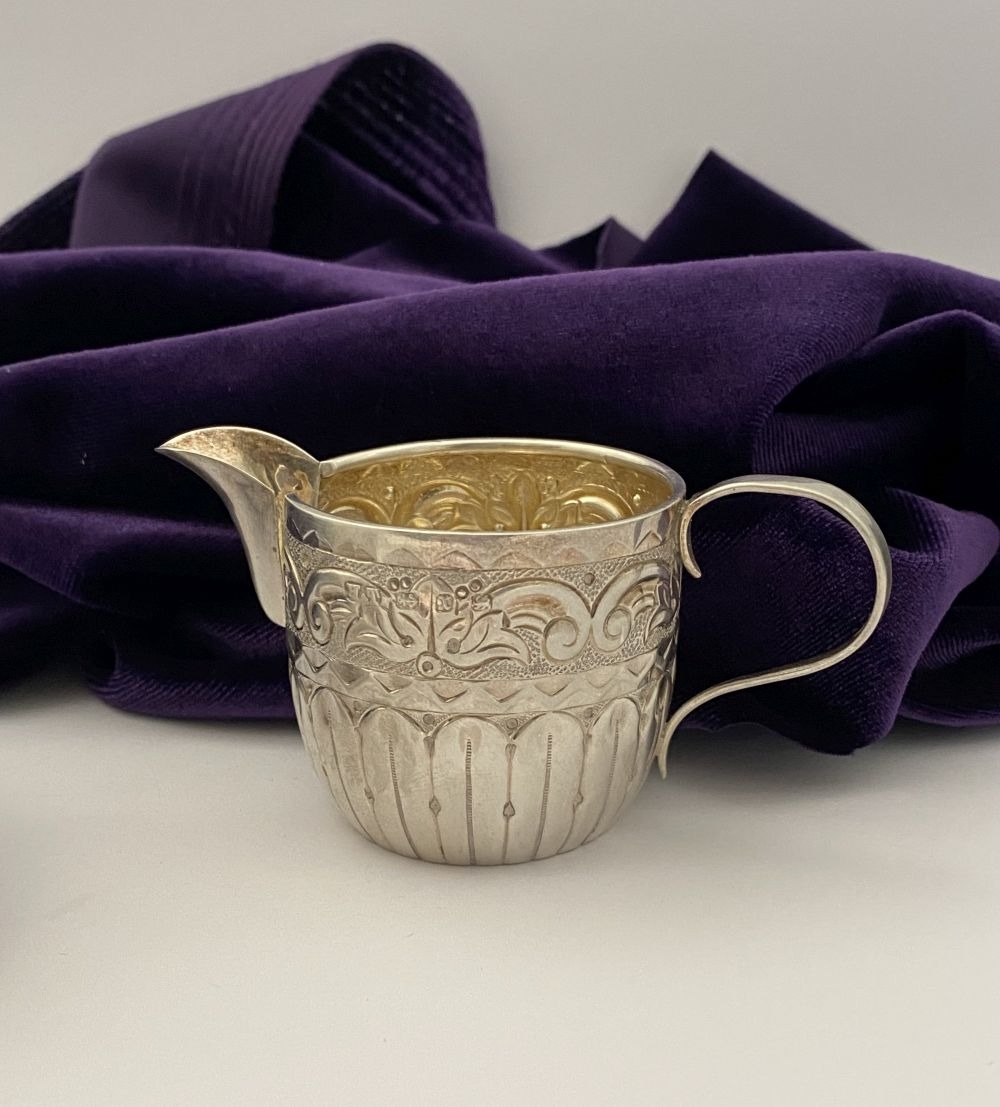 A VICTORIAN SILVER MILK JUG & SUGAR BOWL, by Hilliard & Thomason (John Hilliard & John Thomason trading as Hilliard & Thomason), Spencer Street, Birmingham, with date letters 'w' for 1896 & 'x' for 1897. Both pieces are highly decorated with embossed and chased scrolling foliate panels to centre, with flutes below. Dimensions: milk jug: 5cm high x 9.5cm wide; bowl: 8.5cm diameter x 4cm high. Gross weight: 94g / 3.02 troy oz approx. Condition as photographed with small crack to rim of bowl.