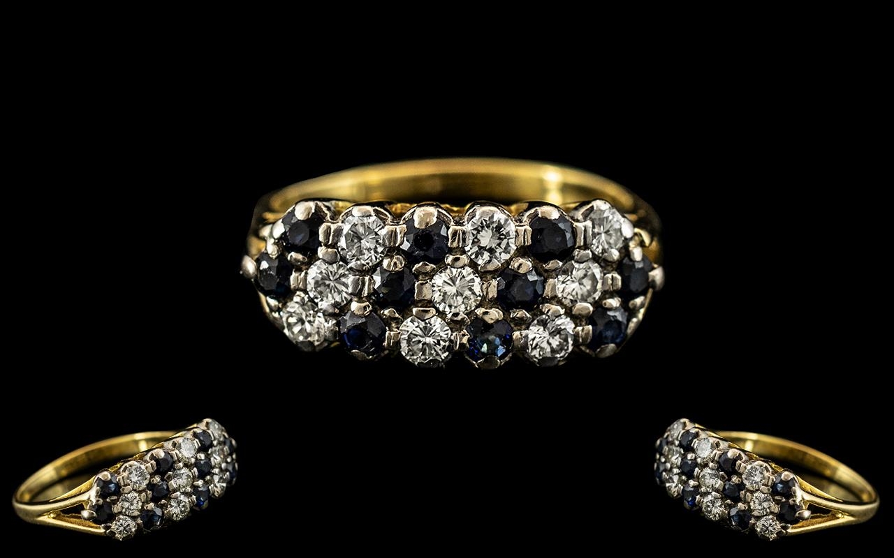 Ladies Attractive 18ct Gold - Diamond and Sapphire Set Dress Ring, Excellent Design. Marked to Interior of Shank for 18ct. Ring Size O. Set with 9 Brilliant Cut Diamonds and 10 Blue Sapphires, Diamonds of Excellent Colour / Clarity ( White ) Est Weight 0.45 pts. 4.7 grams. Shank / Setting In Excellent Condition.