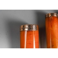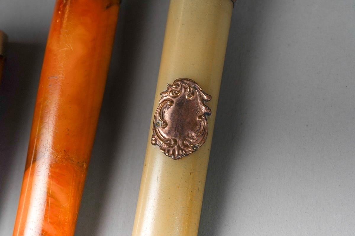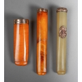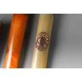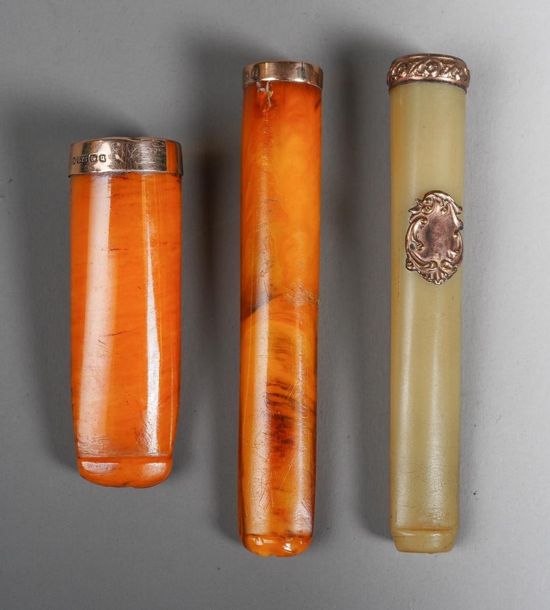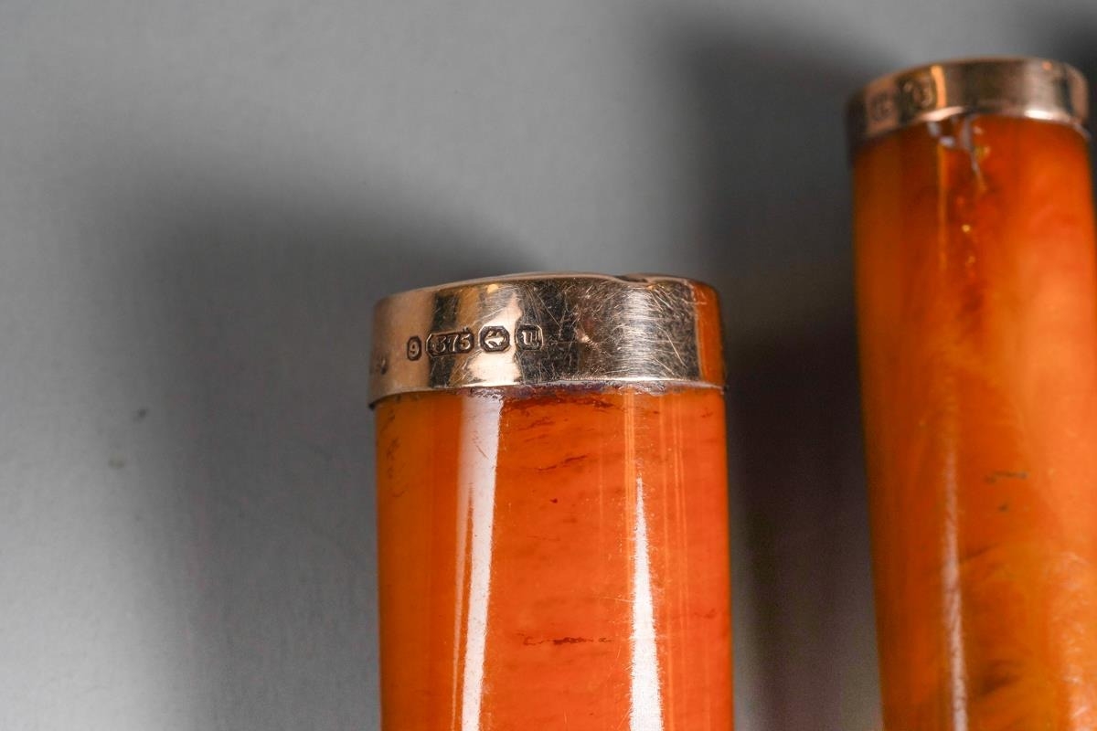A George V cased 9ct rose gold mounted butterscotch amber cigar holder, makers Villiers & Jackson, Birmingham 1919, together with a 9ct mounted butterscotch amber cheroot holder, cracked, makers Hilliard & Thomson, Birmingham 1902 and an amber style cheroot holder with gold plated mounts (3)