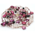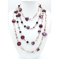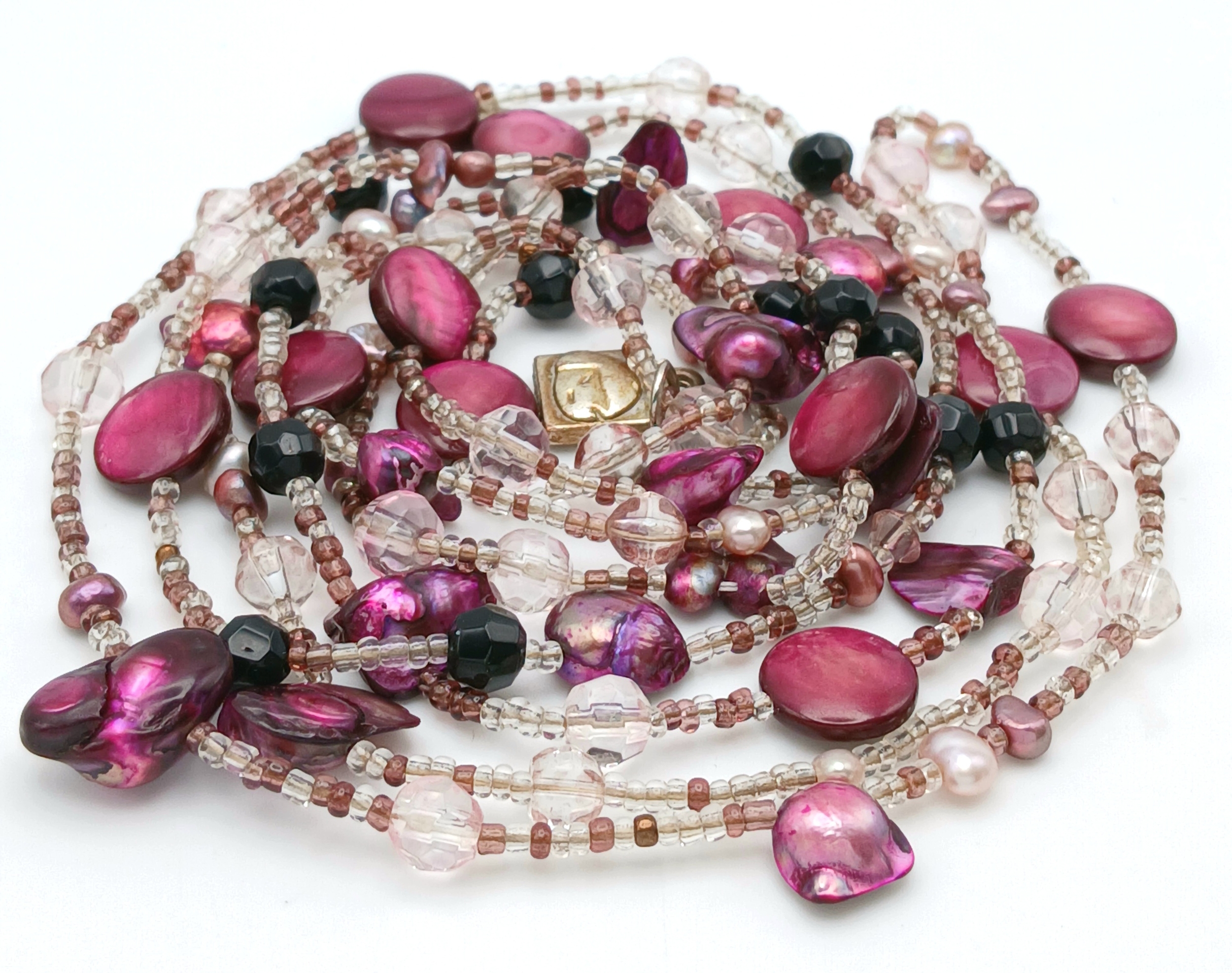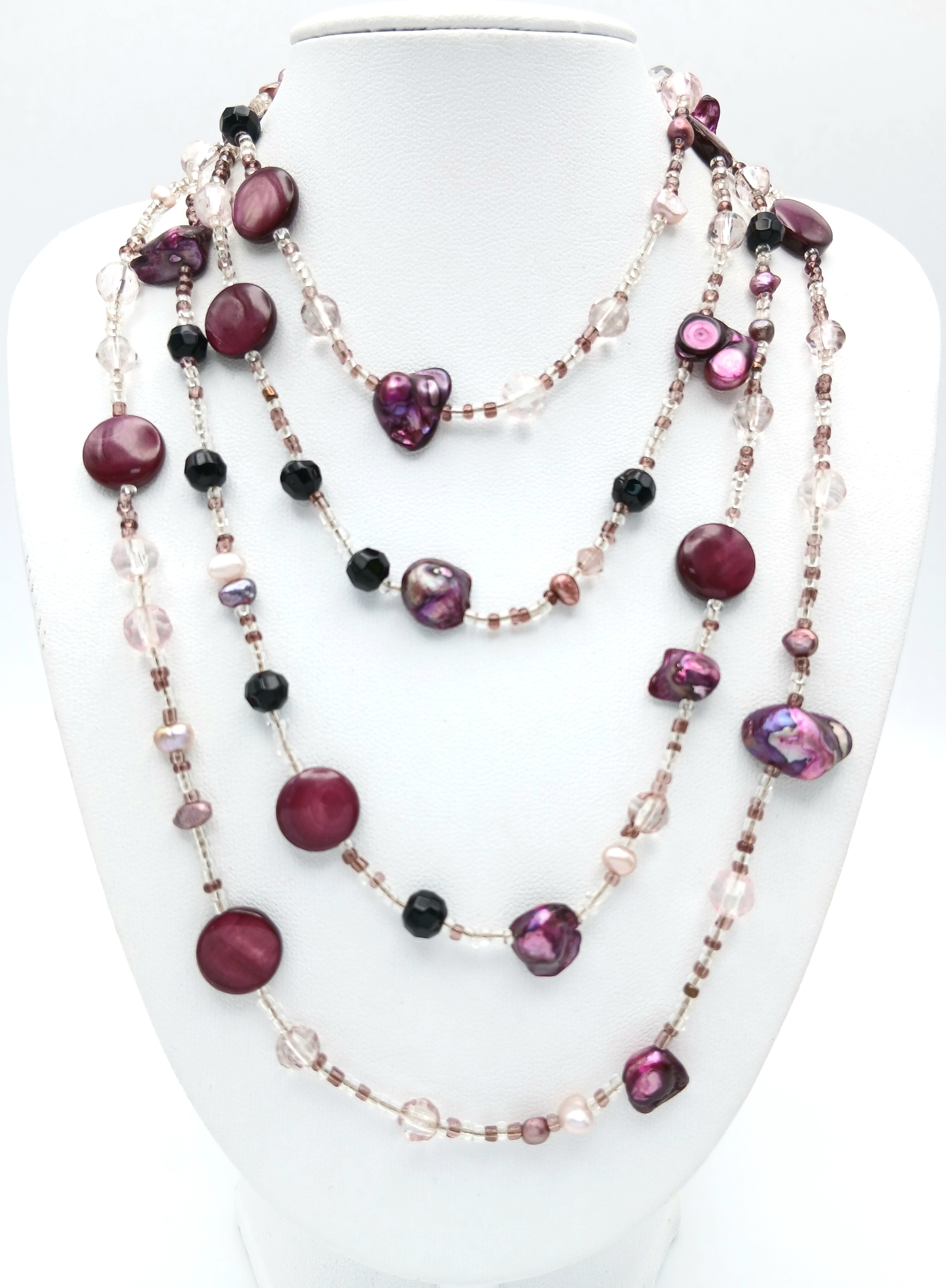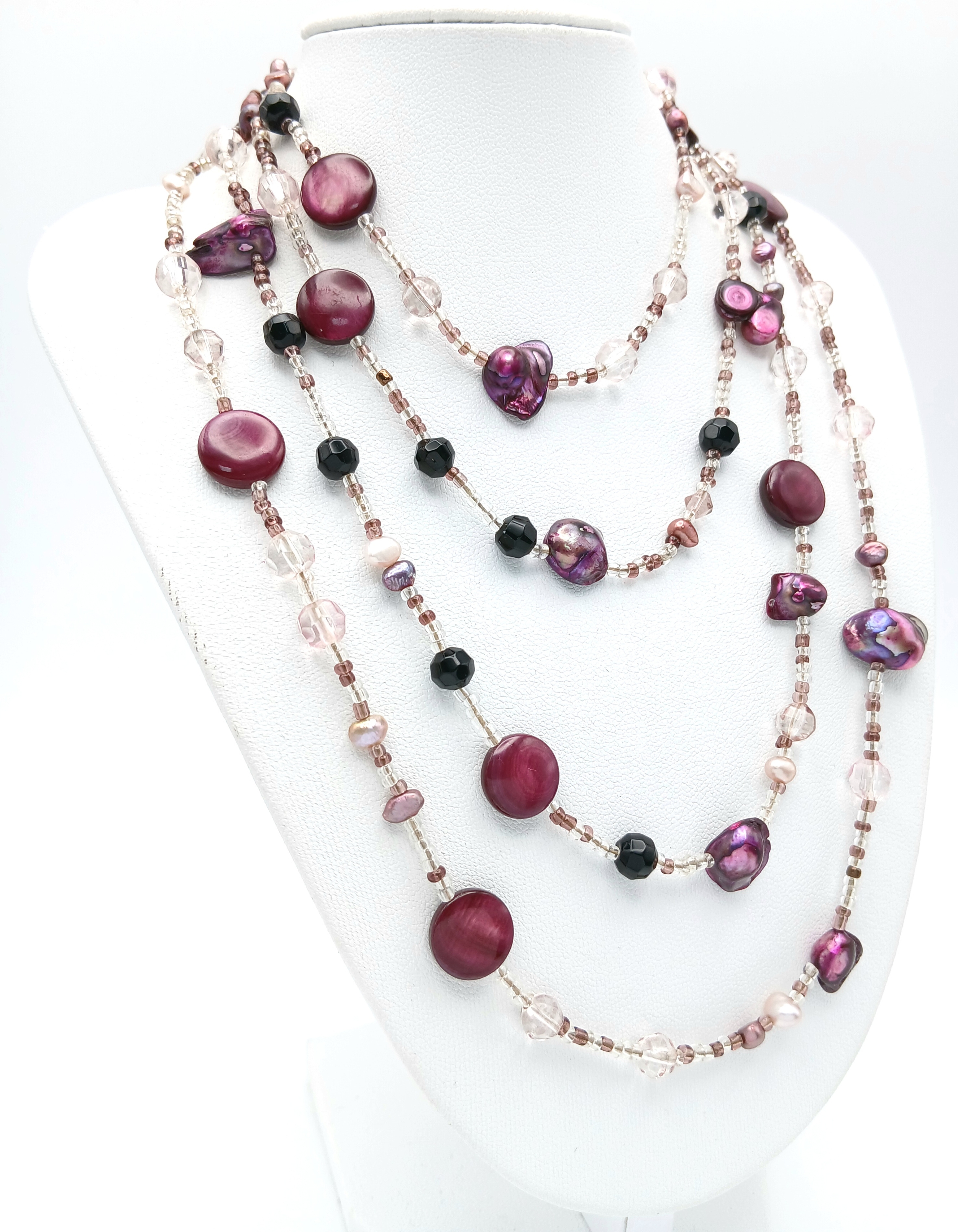 A Multi-Strand Freshwater Pearl with Bead Necklace. Comprising multiple strands of clear and coloured beads set with purple freshwater pearl accents and black spacer beads. Approx 146cm in length. Please see photos for details.