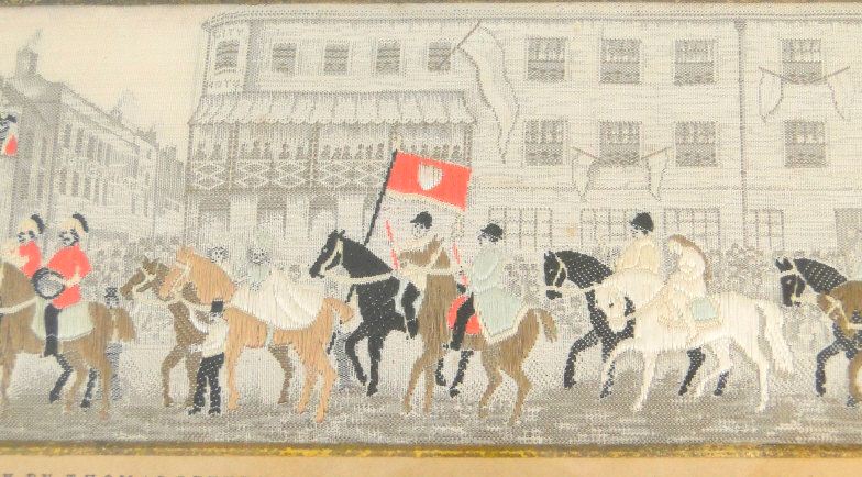 19th Century stevengraph depicting the Lady Godiva procession, mounted and framed
