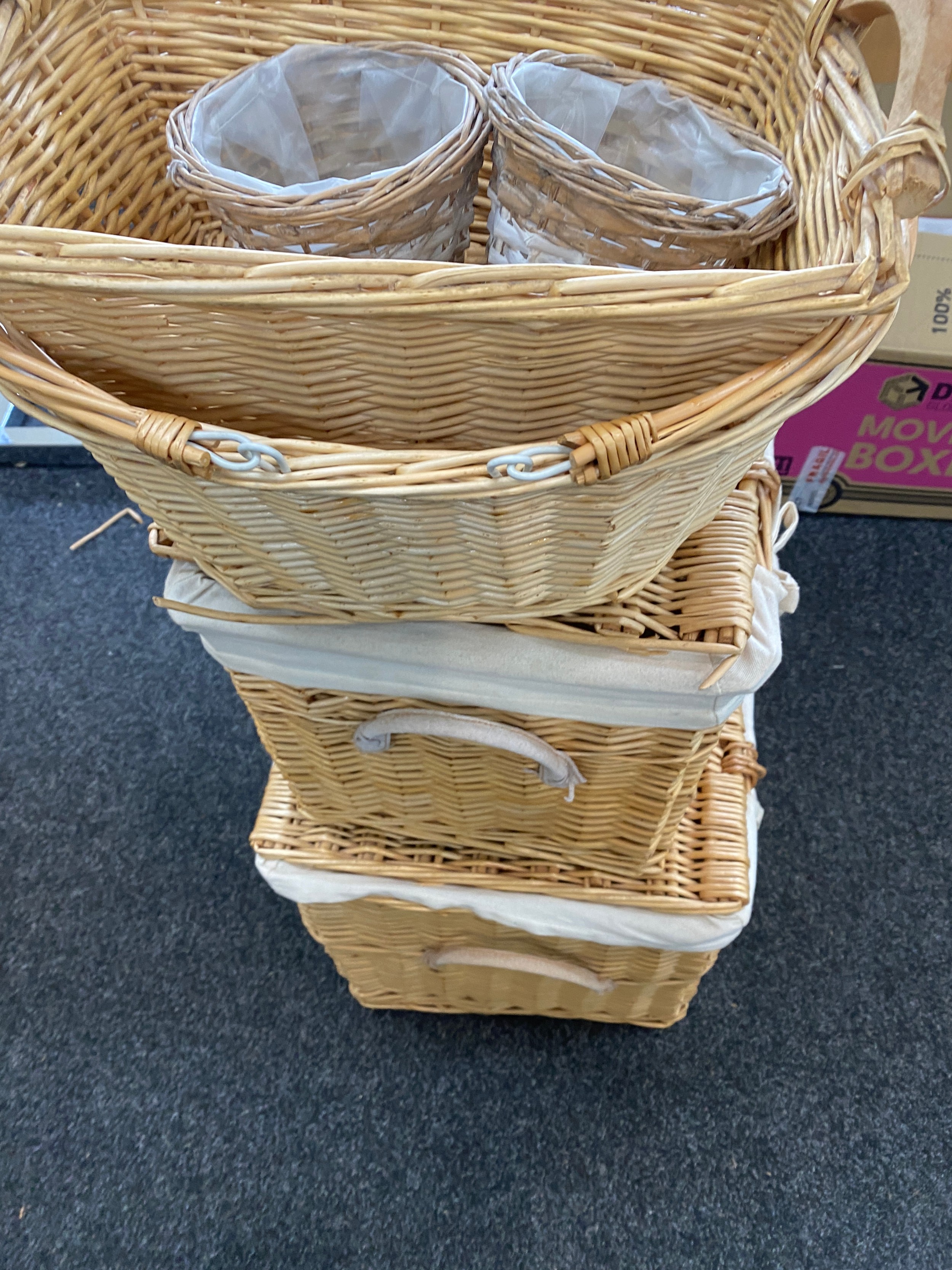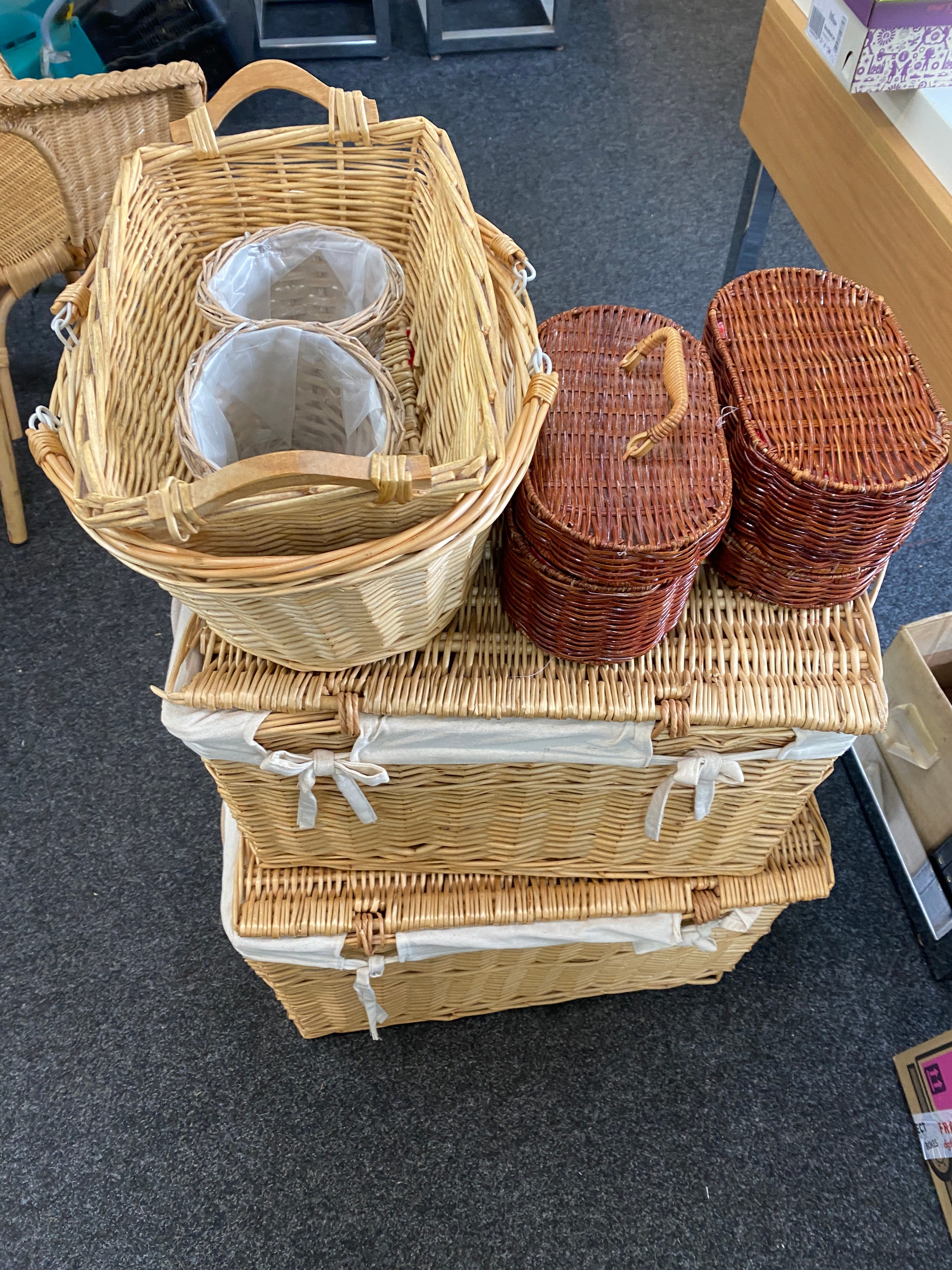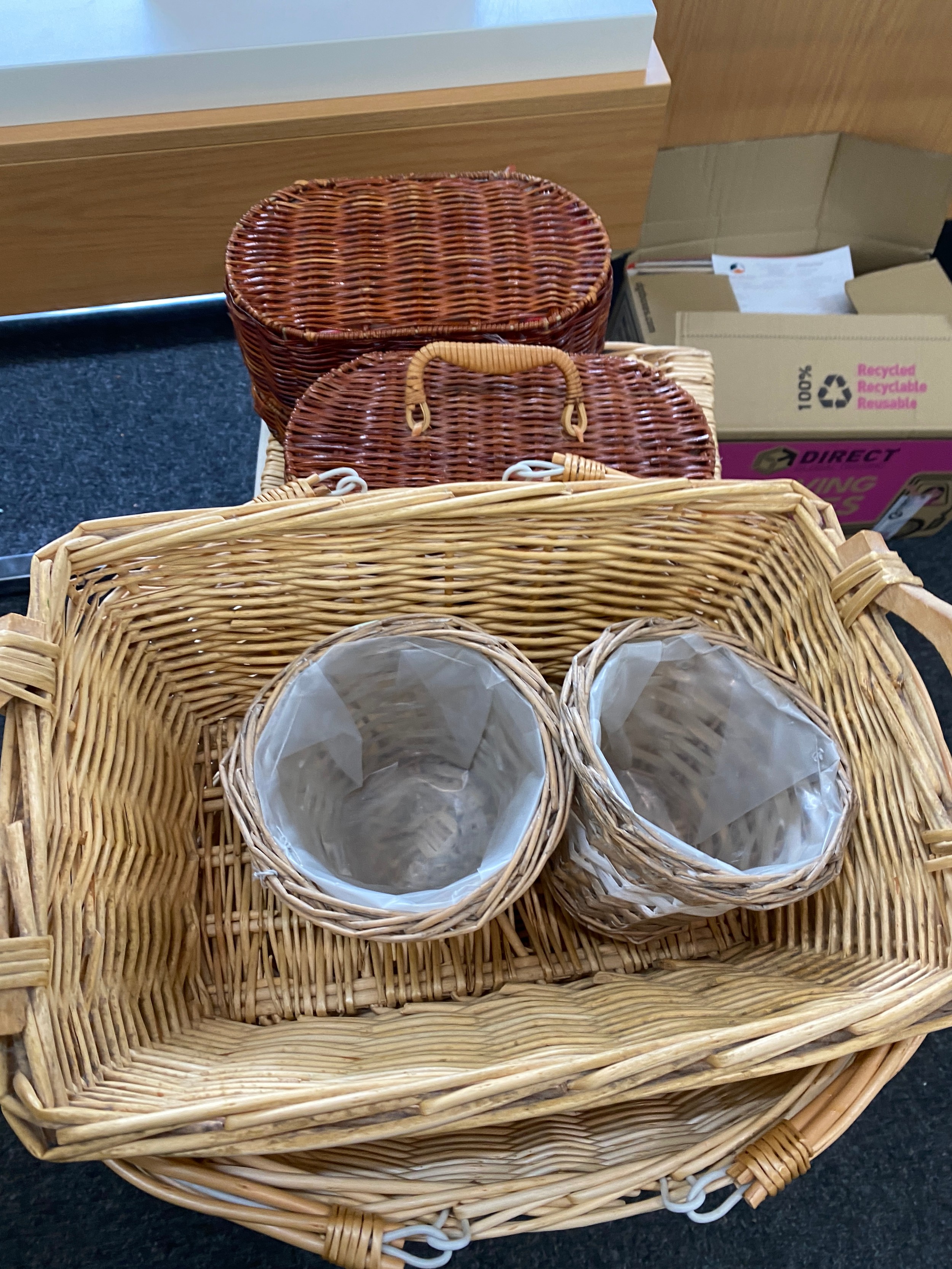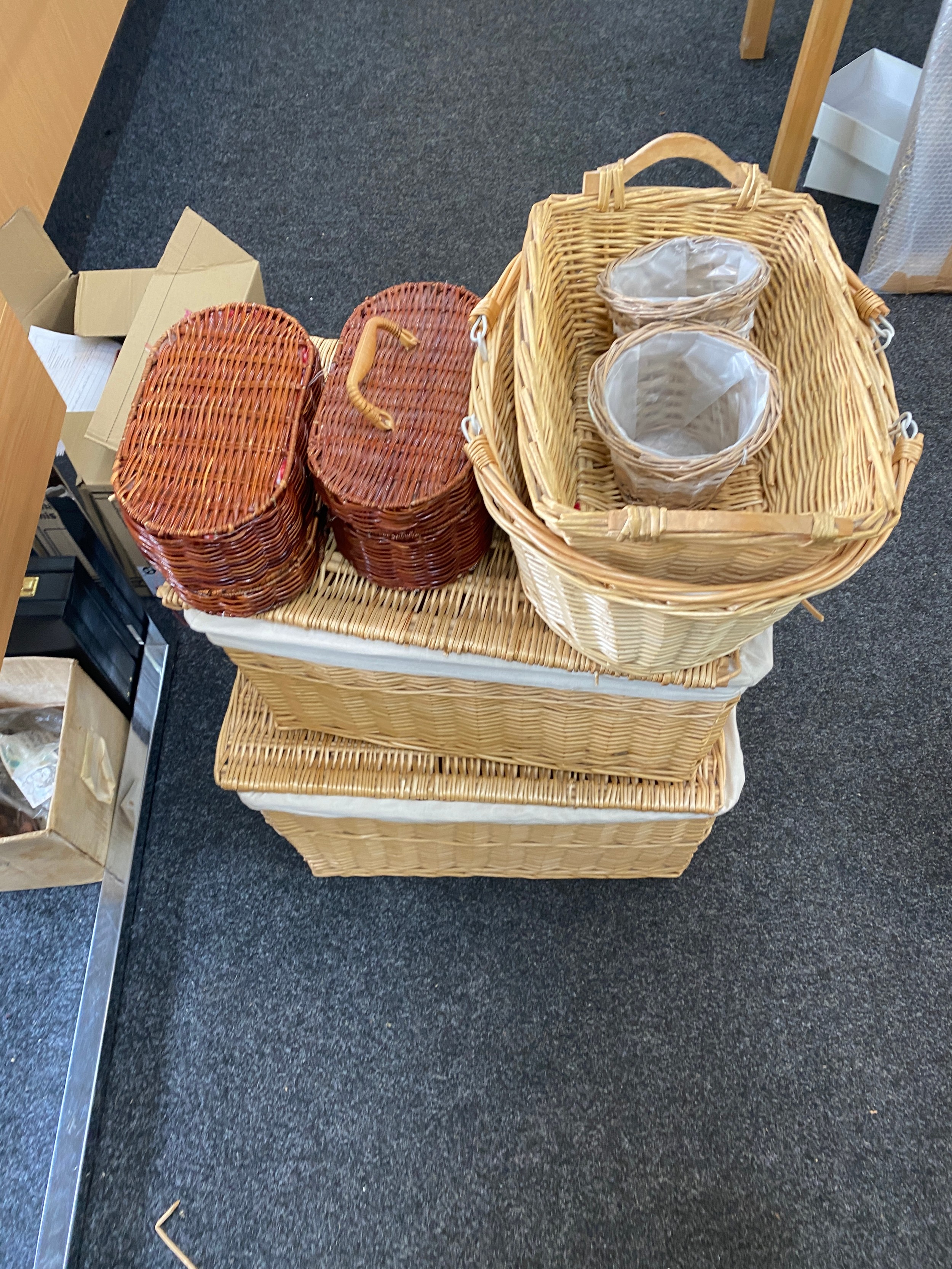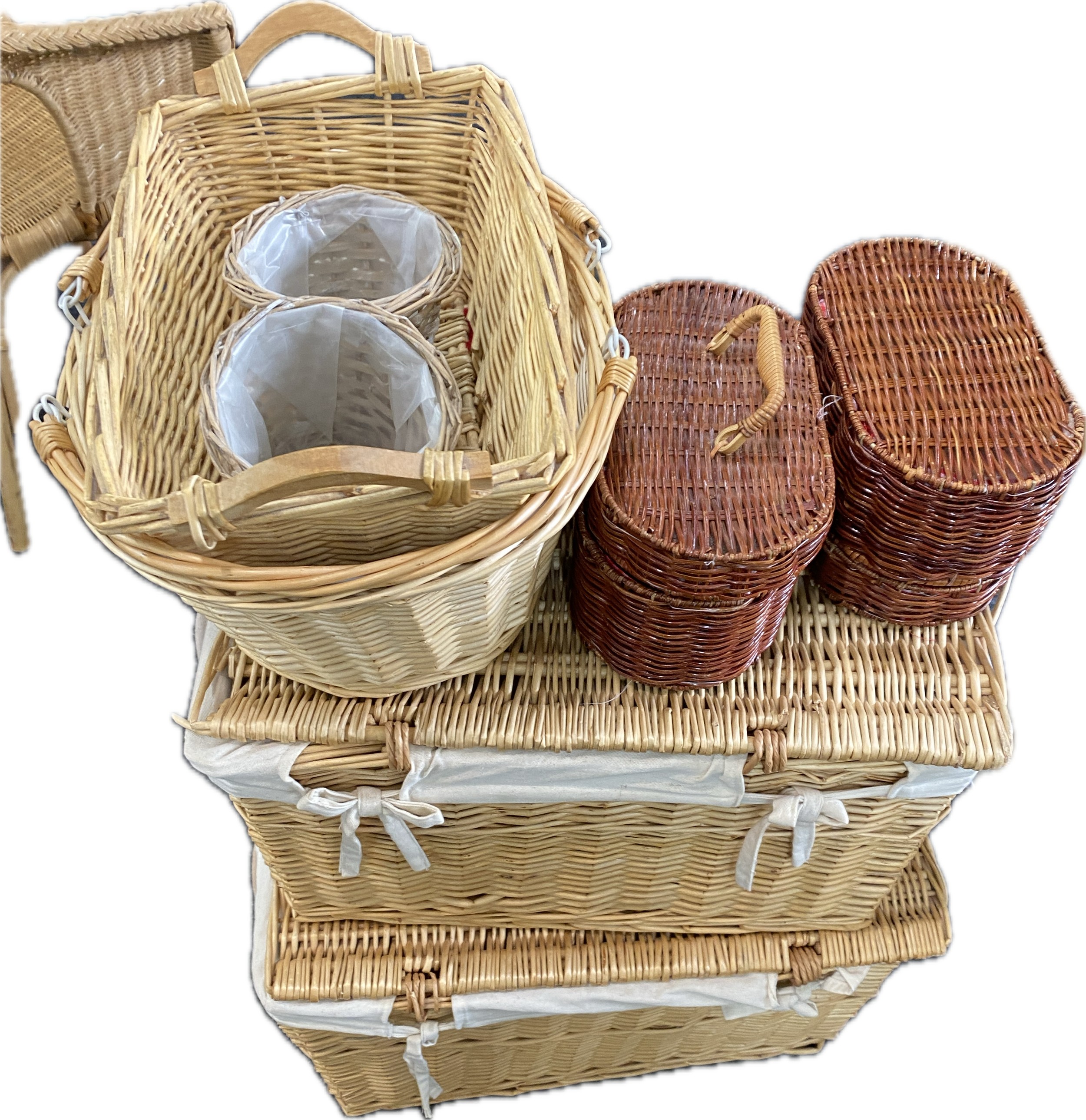 Large selection of assorted wicker items includes Storage baskets etc