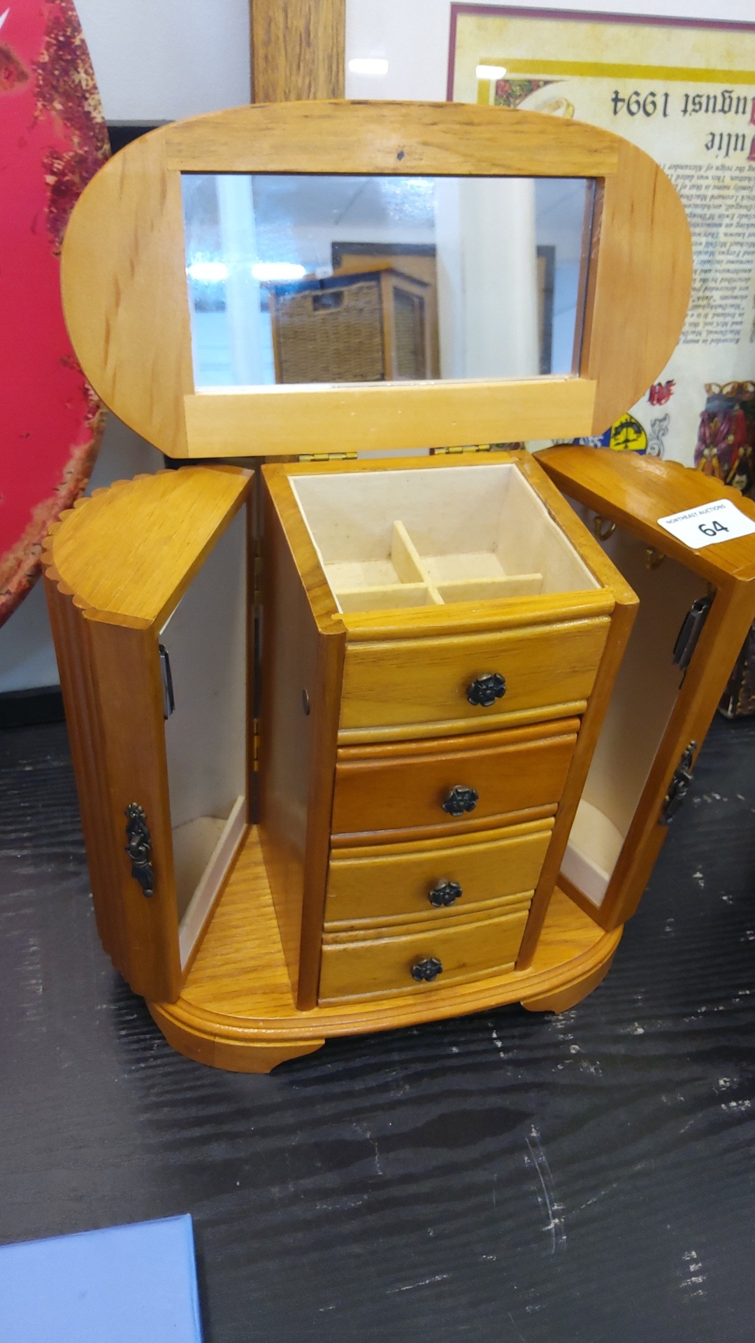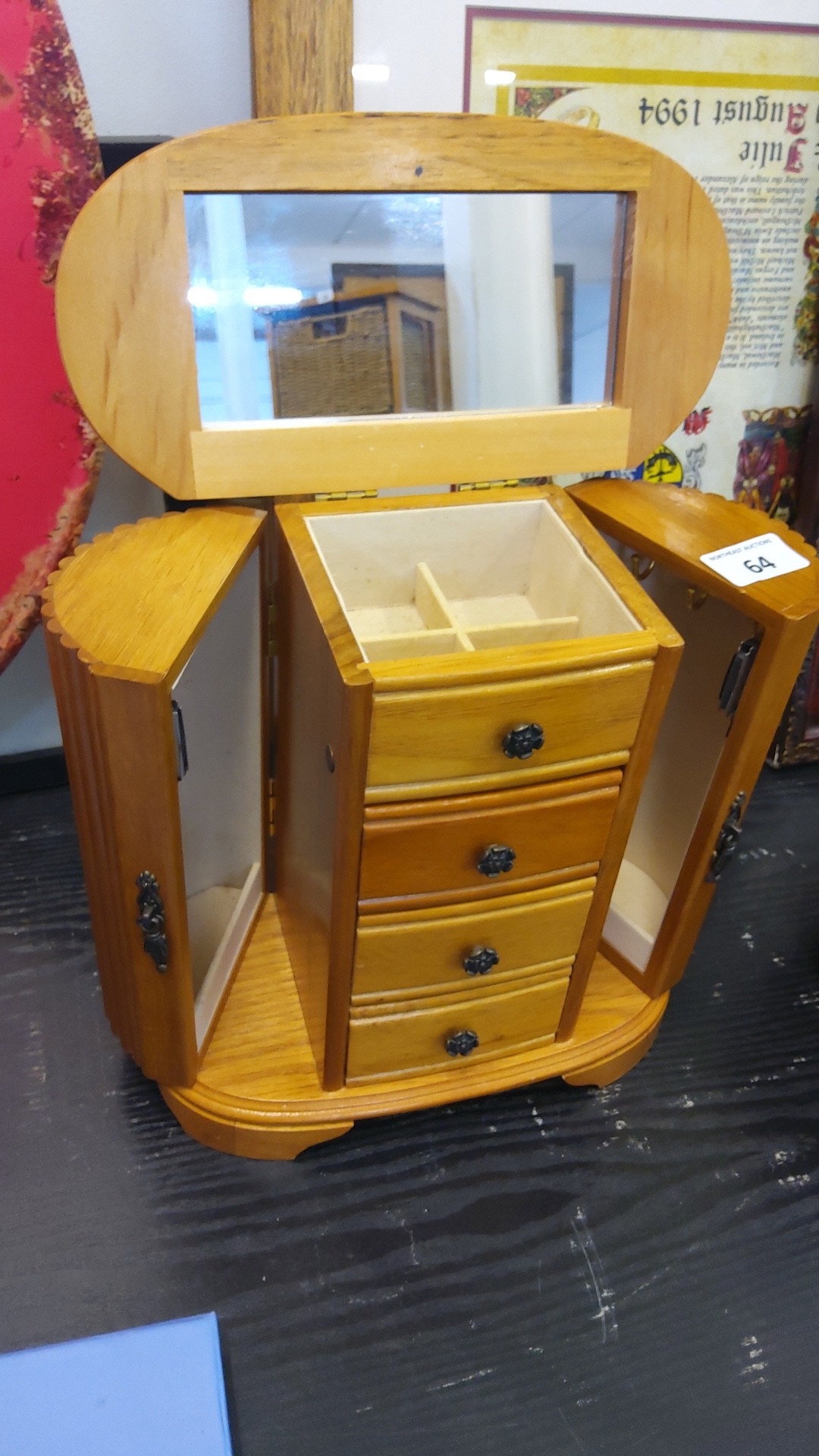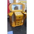 Modern jewellery cabinet, the hinged oval mirror enclosing a divided lift-out compartment, above four drawers, flanked by hinged cupboard doors with fitted hooks, on an oval plinth base.