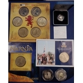 A group of coins and coin sets to include a Royal Mint 1995 silver proof one pound coin, New Zealand Narnia six coin frosted uncirculated set, Aslan one dollar frosted uncirculated coin, a Royal Mint Libra Solidus Denarius set, two Millenium five pound coins and a Falkland Island liberation Crown, Cond: EF-UNC