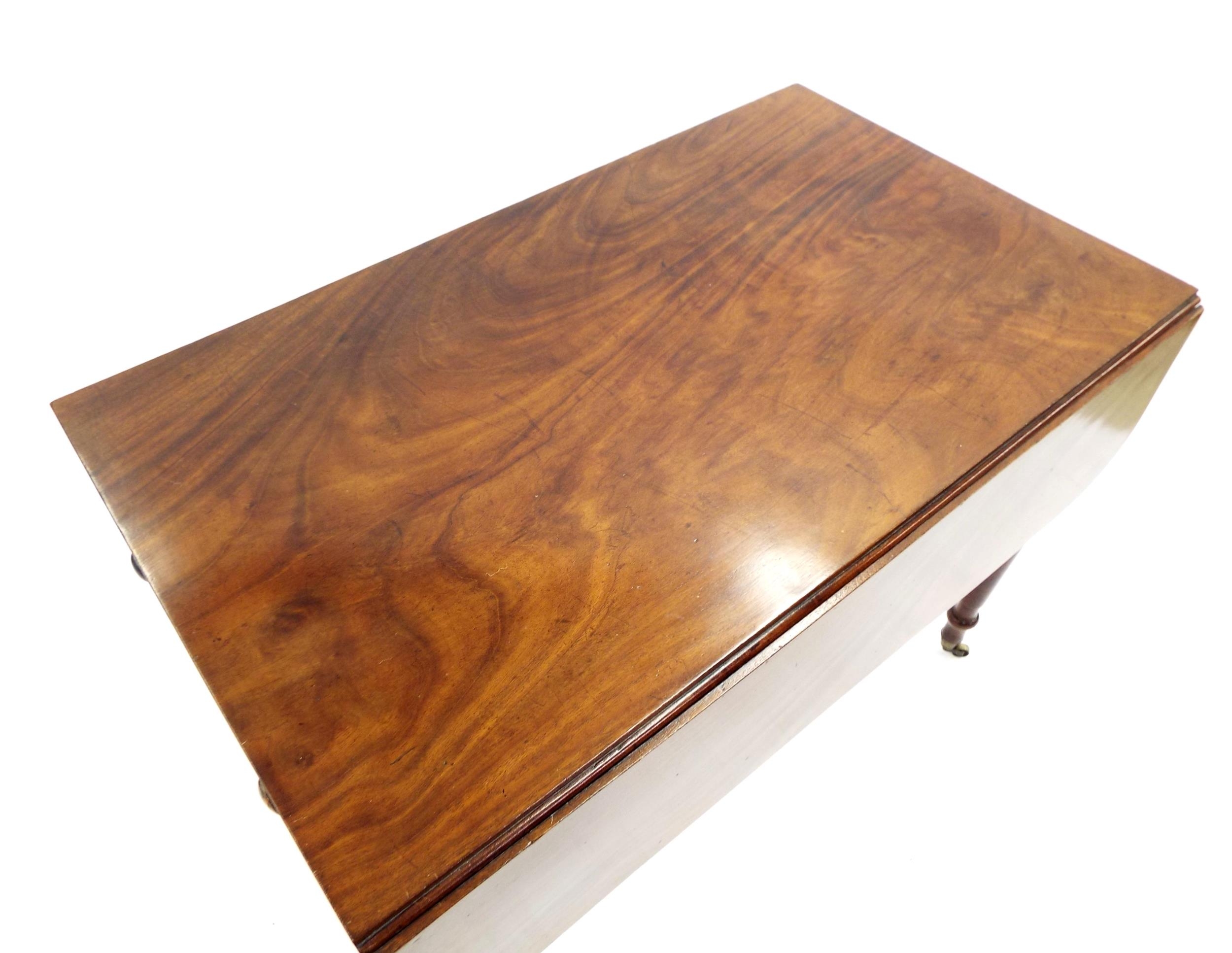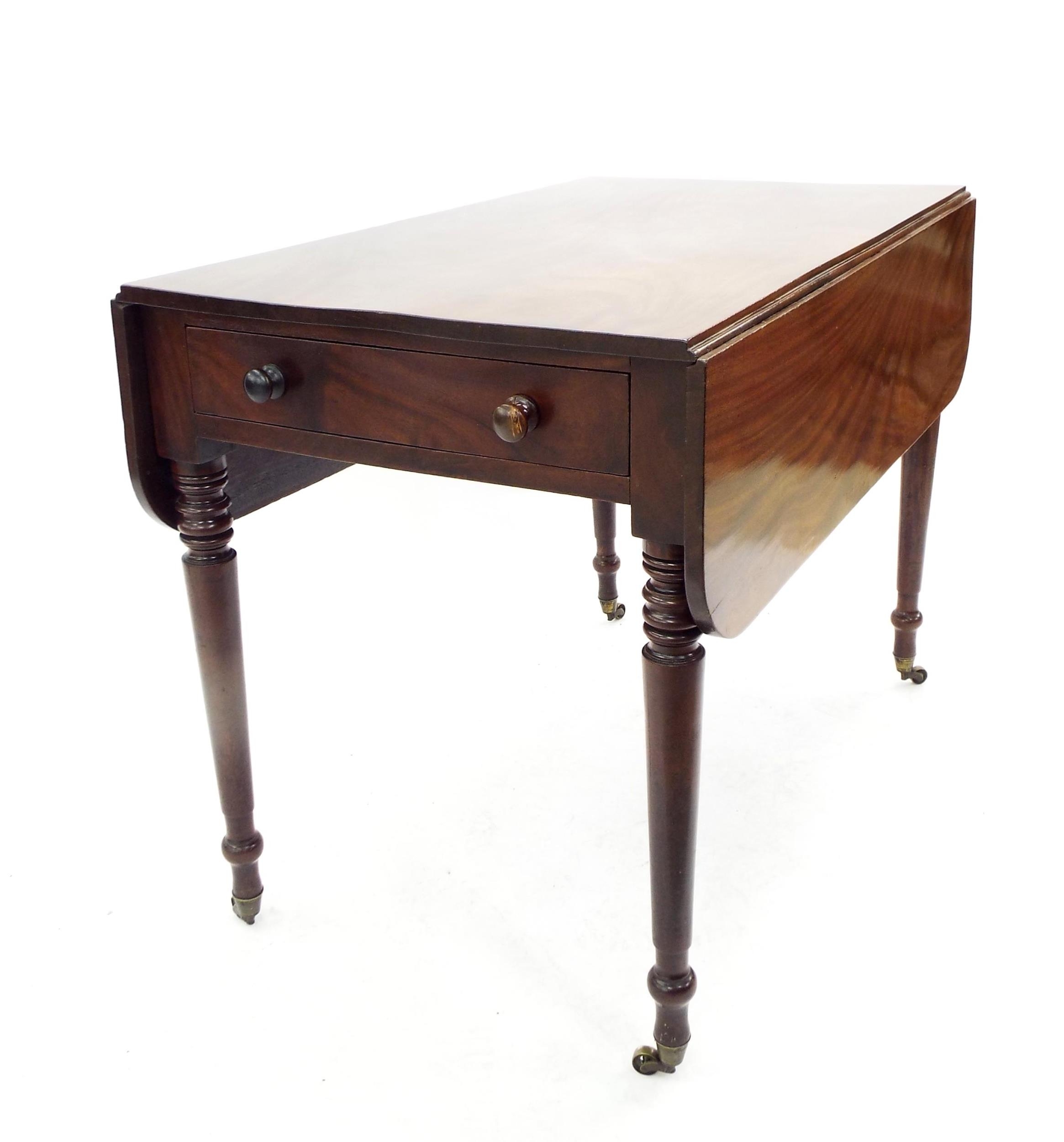 Victorian flame mahogany Pembroke table with a single frieze drawer and opposing dummy drawer upon turned tapered supports terminating with castors, 39" wide