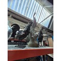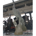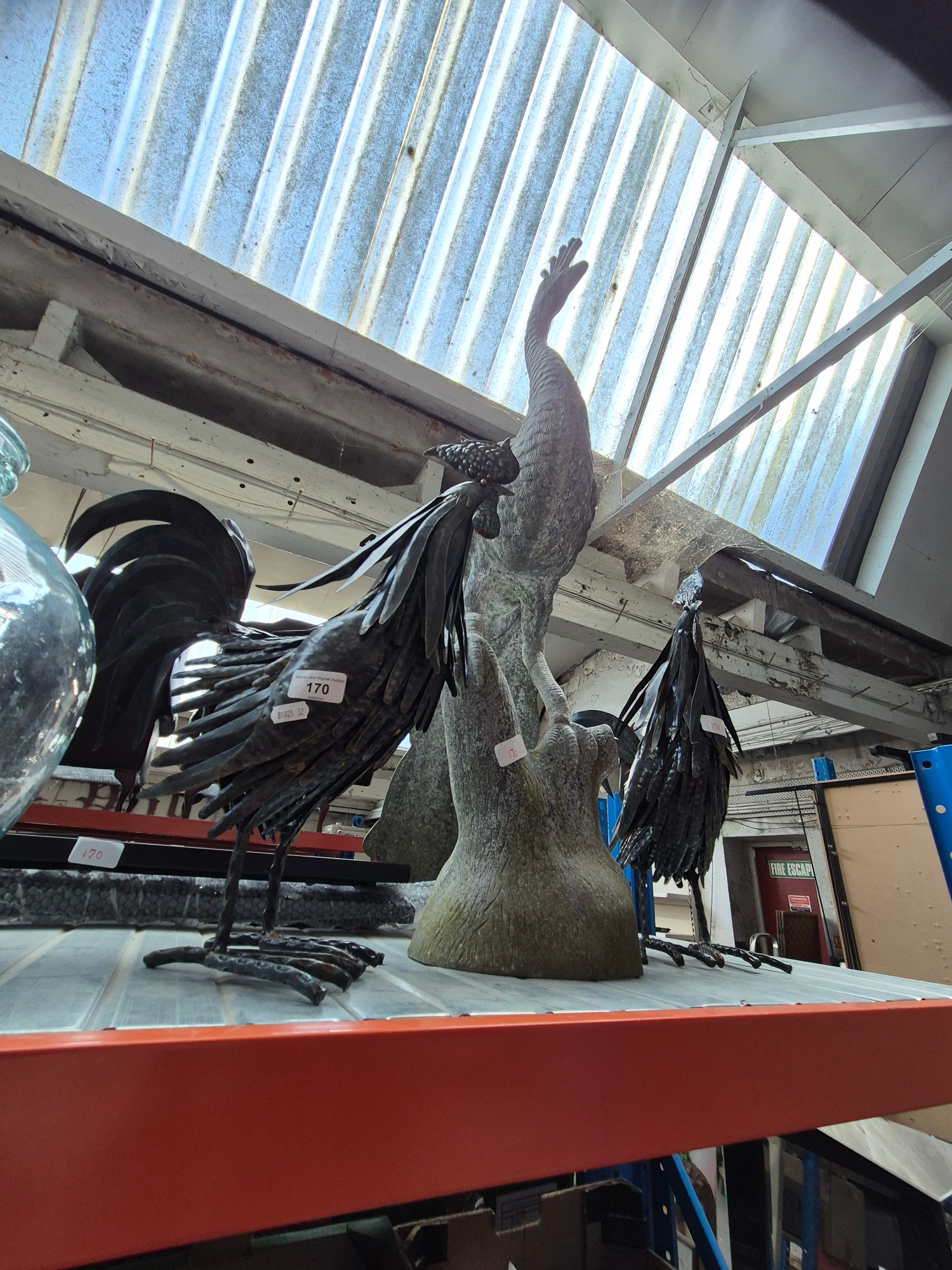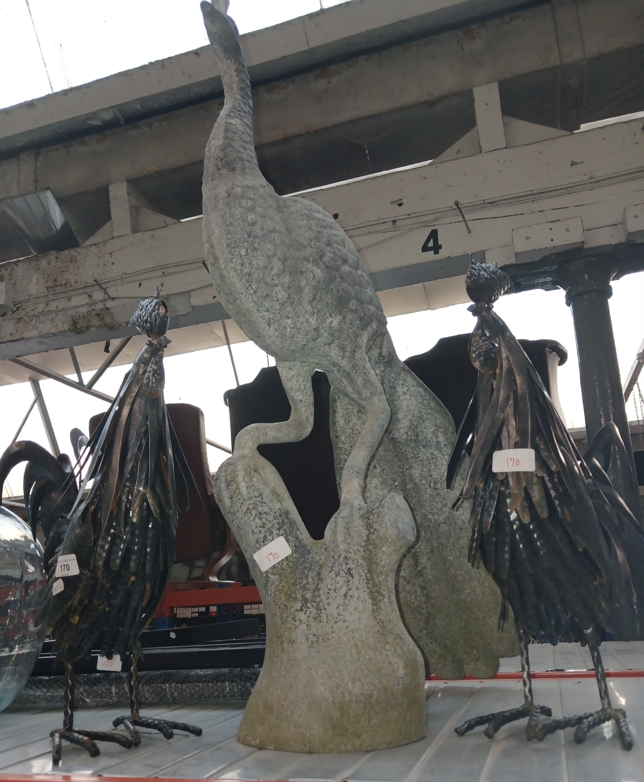 A metal garden bench (in pieces), 2 metal cockerel and a metal peacock ornaments