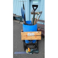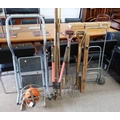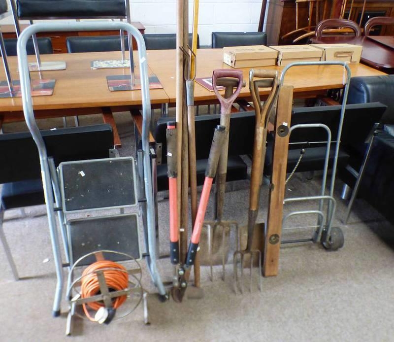 SELECTION OF GARDEN TOOLS TO INCLUDE SHOVEL, LOPPERS ETC AND STEP LADDER