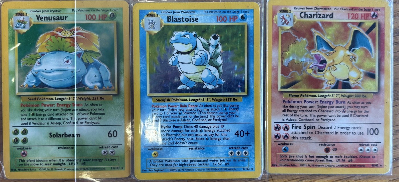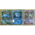Pokemon. Range with Base Set holographic rare Blastoise (2/102), Charizard (4/102) and Venusaur (15/102), generally light played with wear on corners of Charizard card. Qty 3. (Y)