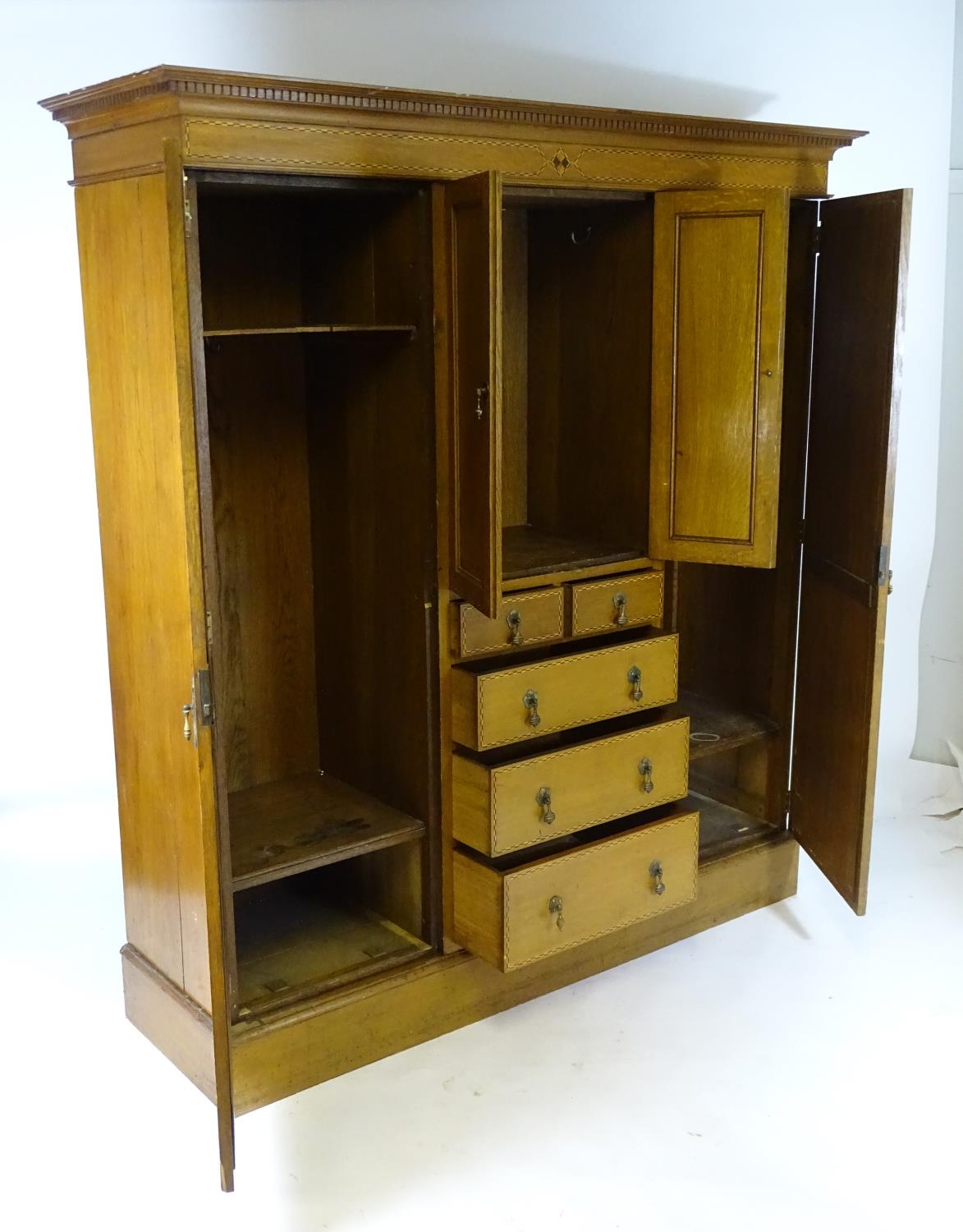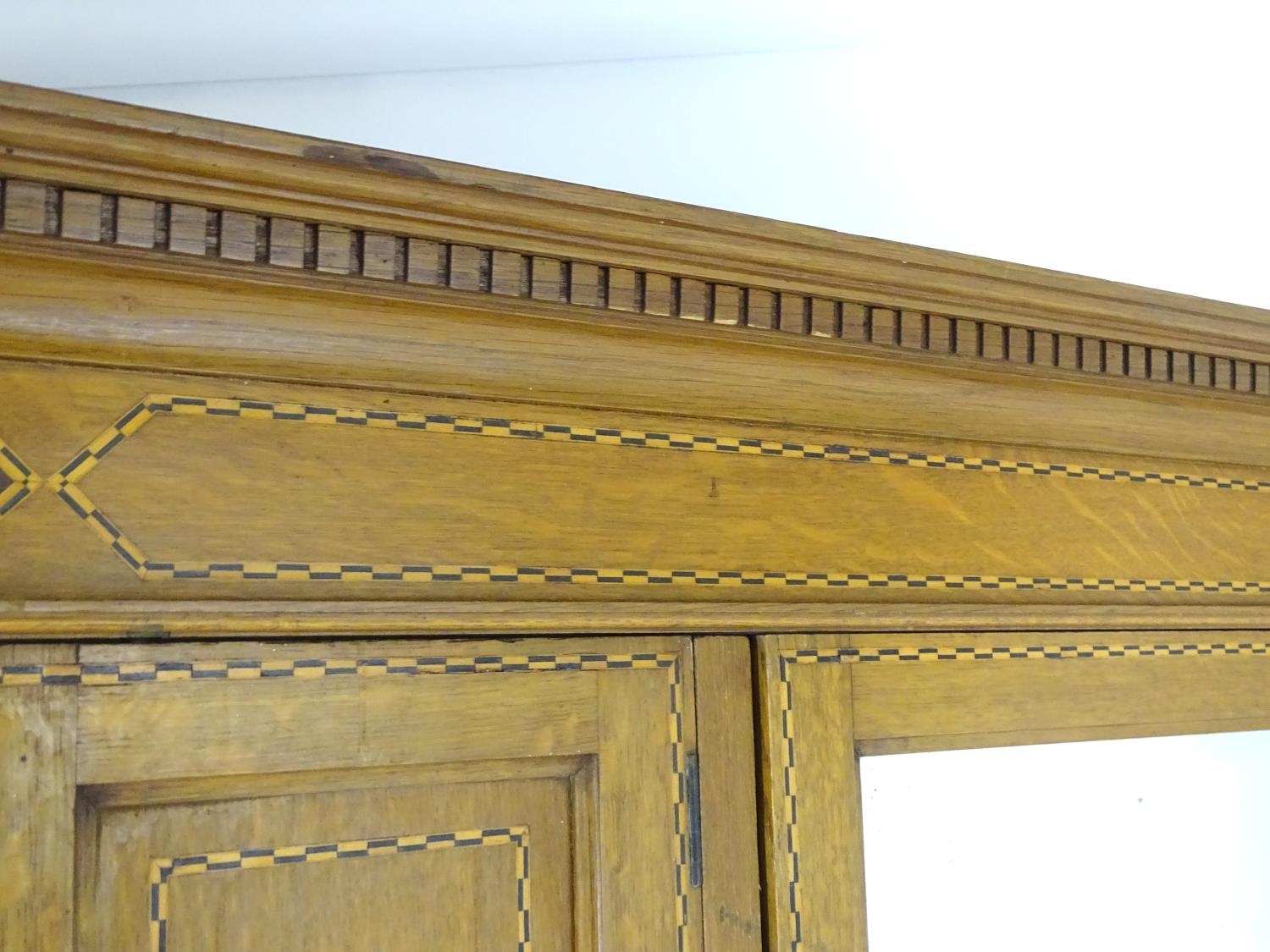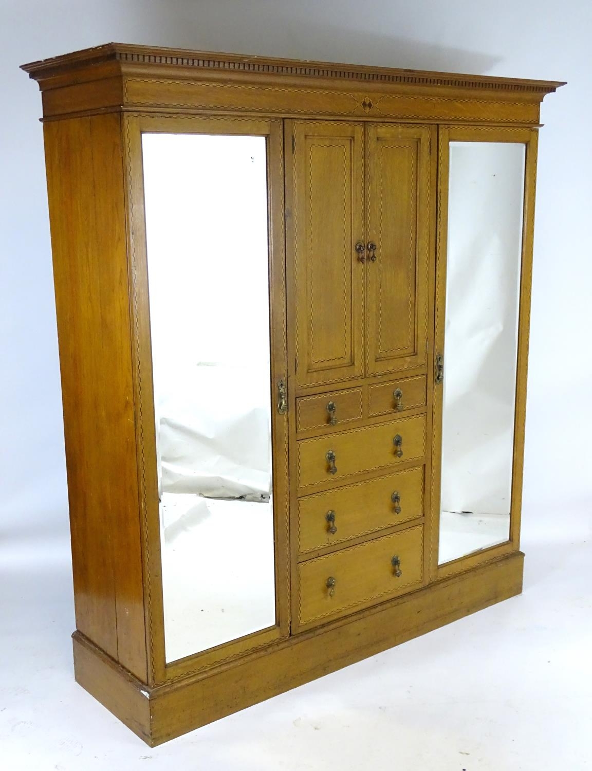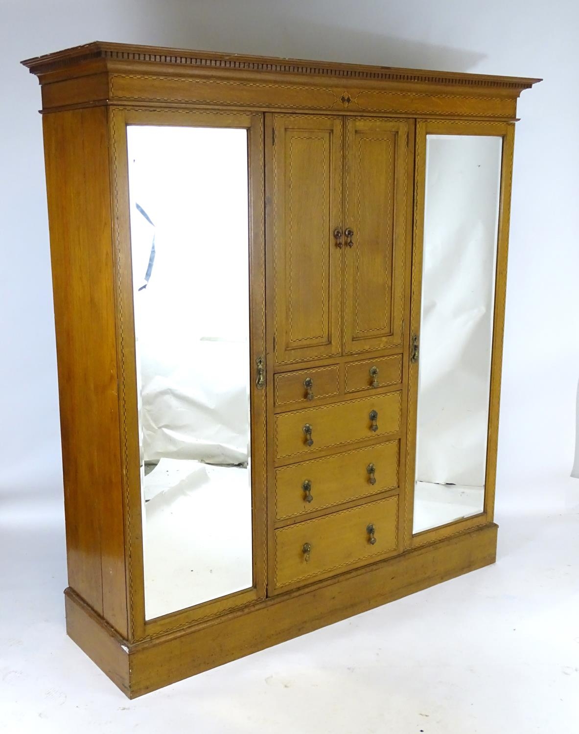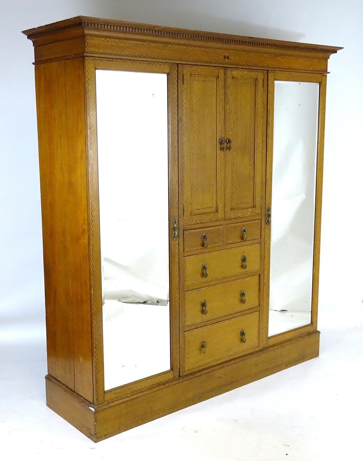 An early / mid 20thC oak triple wardrobe, having a moulded dentil carved cornice above a checkered inlaid frame, doors and drawers. Having two mirrored compartments flanking two cupboard doors above two short over three long drawers. 71" long x 22" wide x 77" high.