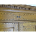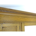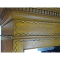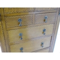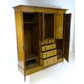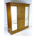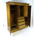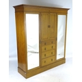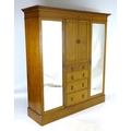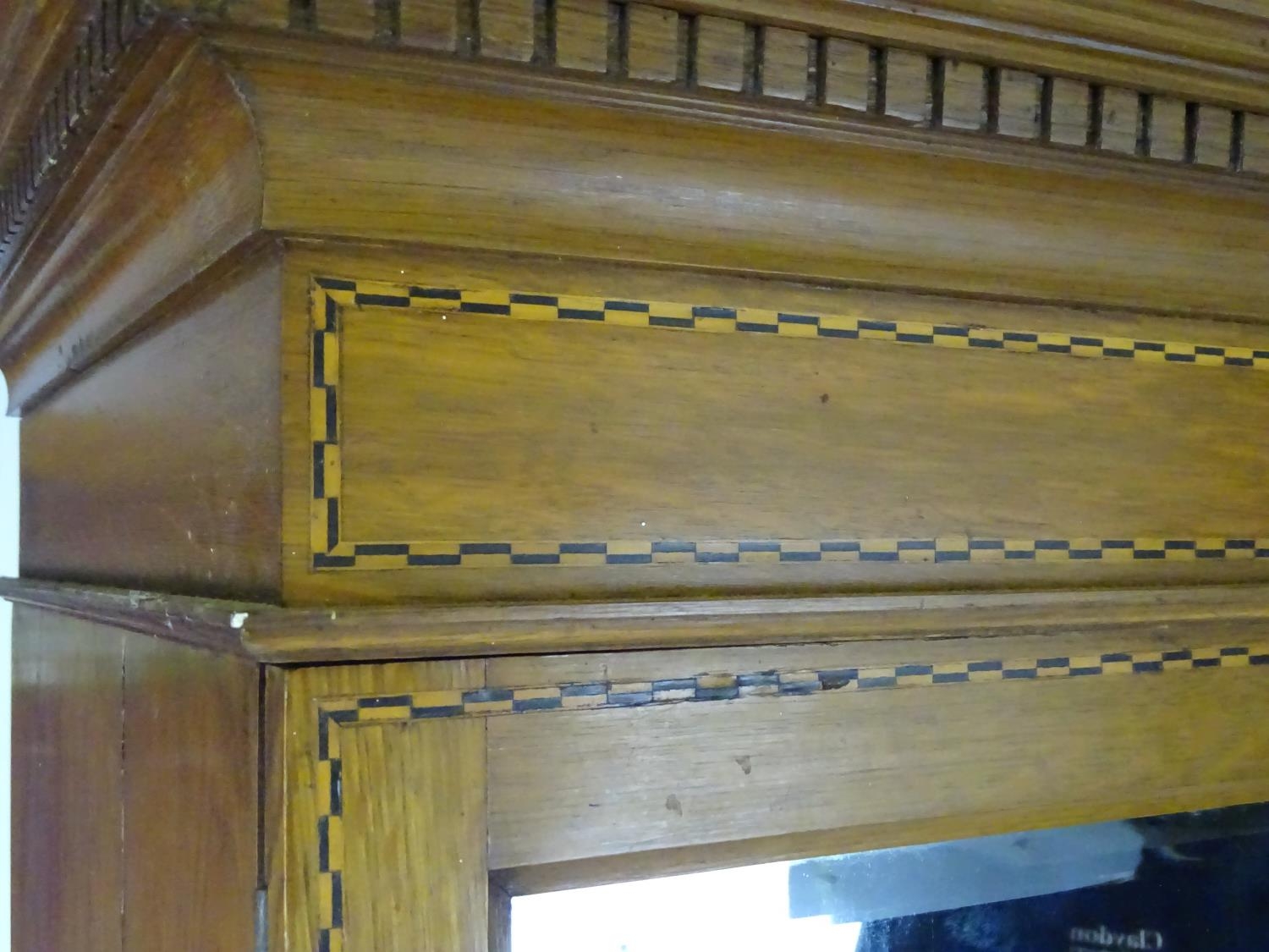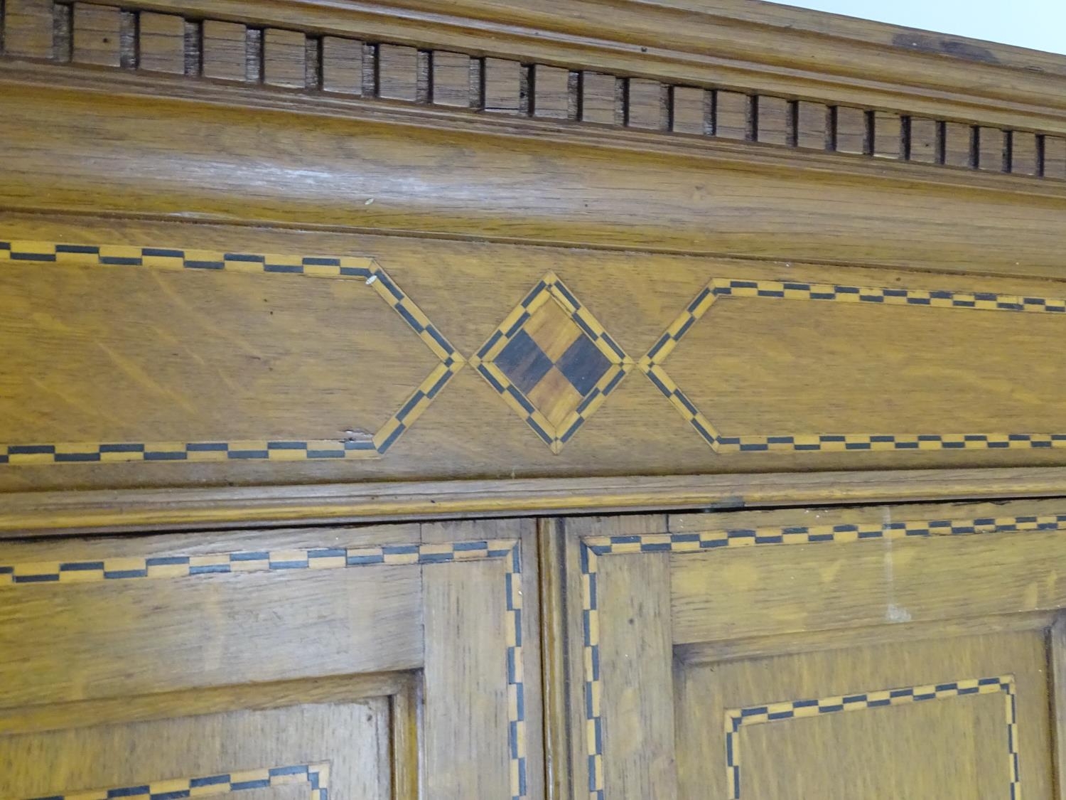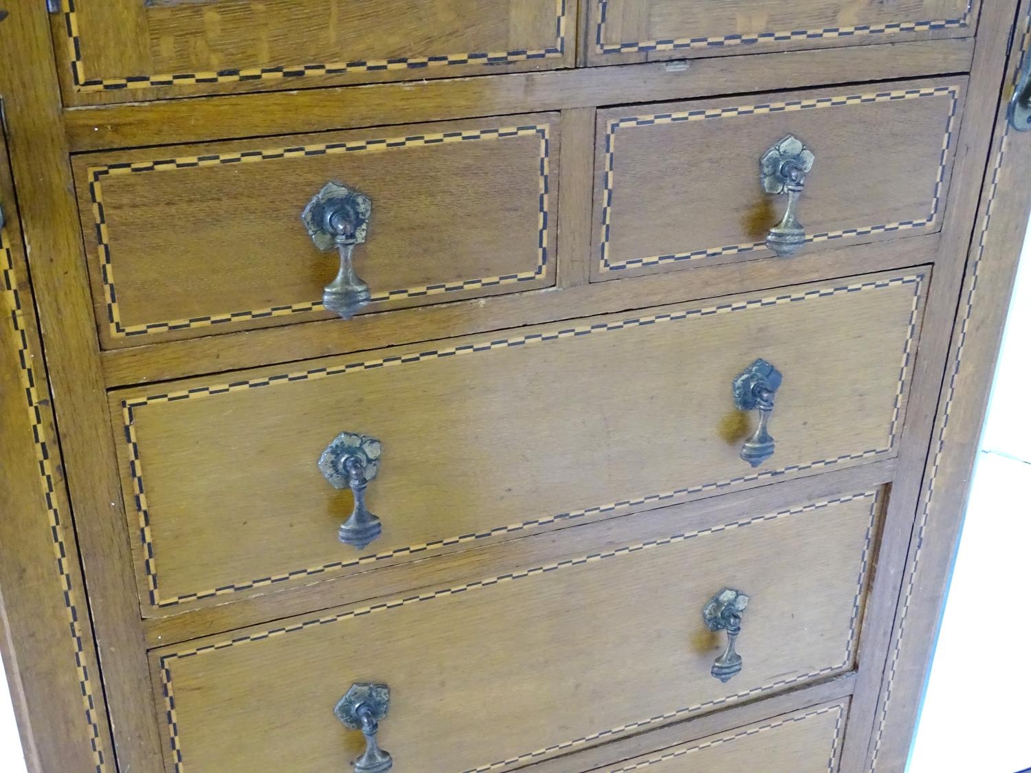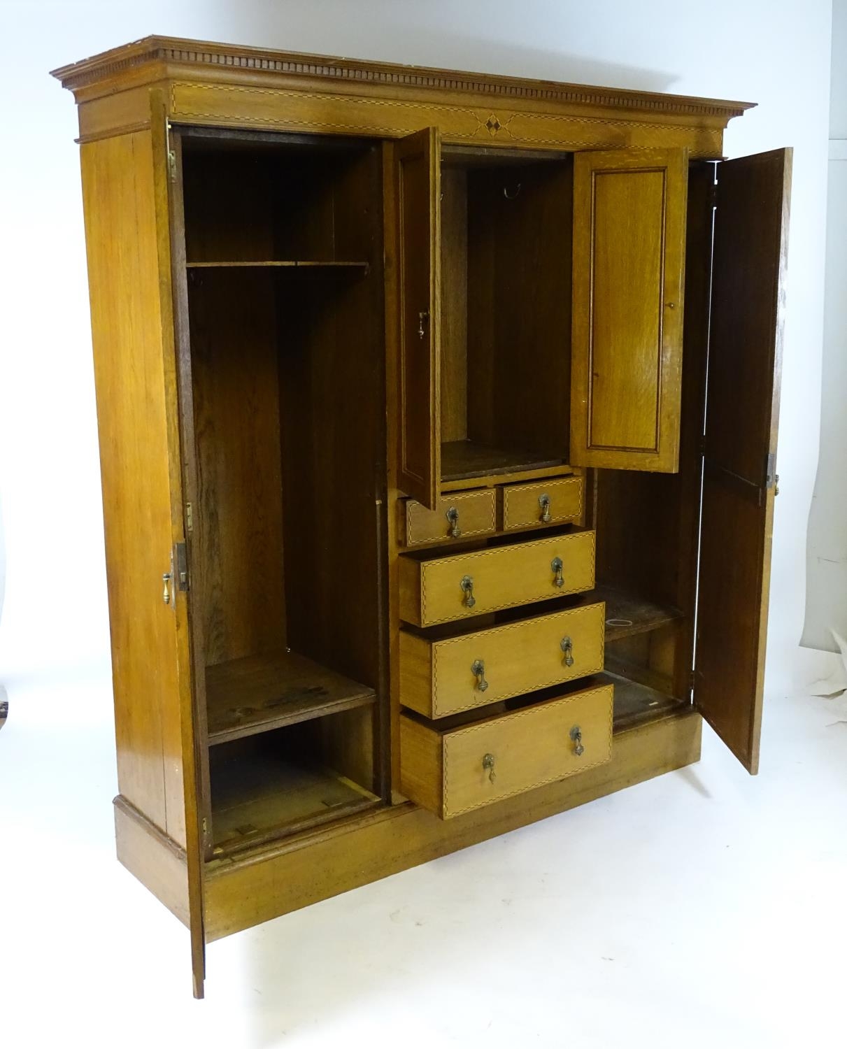 An early / mid 20thC oak triple wardrobe, having a moulded dentil carved cornice above a checkered inlaid frame, doors and drawers. Having two mirrored compartments flanking two cupboard doors above two short over three long drawers. 71" long x 22" wide x 77" high.
