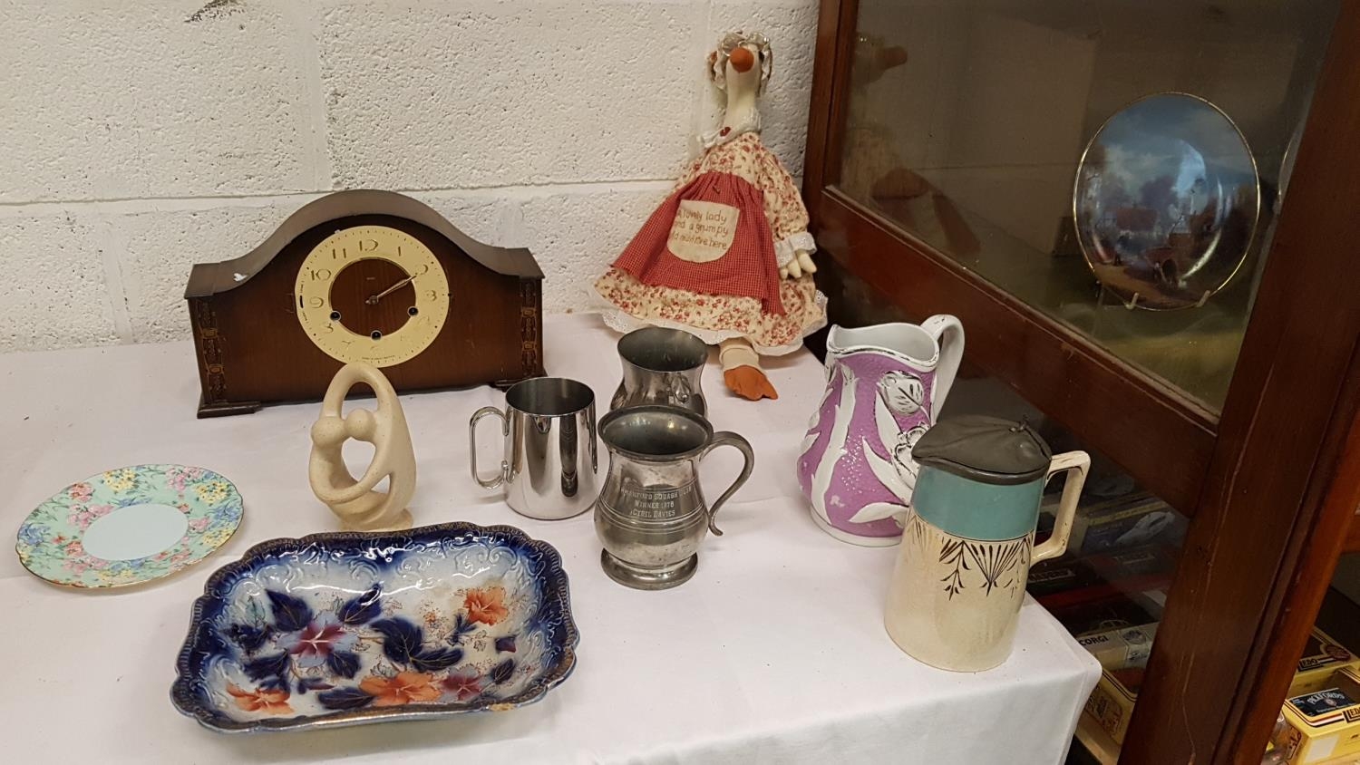 Box to Include Plated Tankards, Mahogany Cased Smith's Mantel Clock, Assorted China etc.
