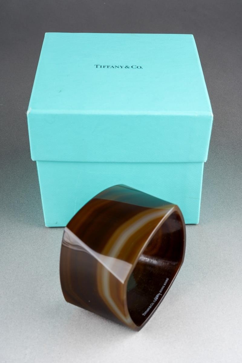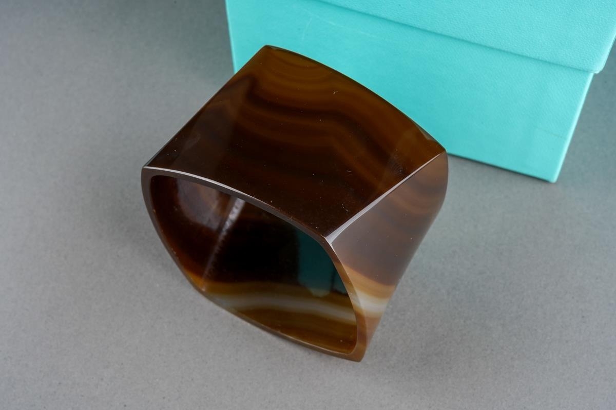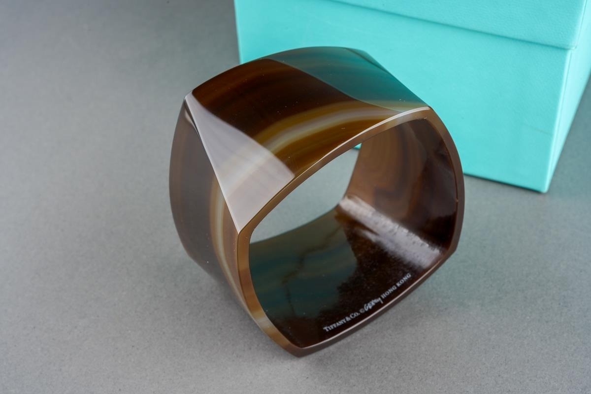 A boxed Tiffany & Co banded agate torque bangle designed by Frank Gehry, an interior edge marked "TIFFANY & CO. GEHRY HONG KONG", opening width approx. 6.2cm, comes in a Tiffany & Co gift box, white ribbon included (1)