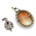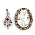 A cameo brooch/pendant in fancy openwork yellow metal mount, length 44mm, tests as approx 8ct gold, steel pin. Together with and a garnet and seed pearl art nouveau pendant, stamped 9ct. 38m length. Cameo 8.68g, pendant 1.62g
