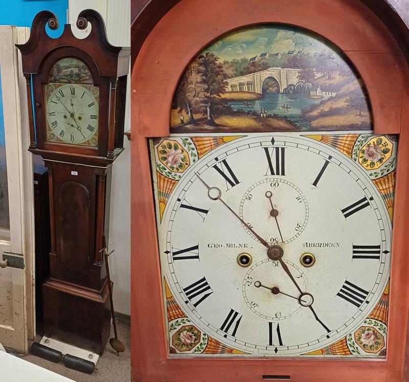 19TH CENTURY MAHOGANY LONGCASE CLOCK WITH PAINTED DIAL WITH BRIDGE OF DON SCENE, SIGNED GEORGE MILNE, ABERDEEN