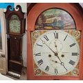 Typical age related wear and tear. Signs of restoration to case. Some warped sections of veneer. Signs of past woodworm to base and near dial. No key present. Hood has signs of past woodworm to sides and top. Signs of repair to finials. Dial is crazed with some bubbled and chipped paint. Weights and pendulum present. All clock works are sold as seen with no guarantee viewing in person is highly recommended.