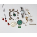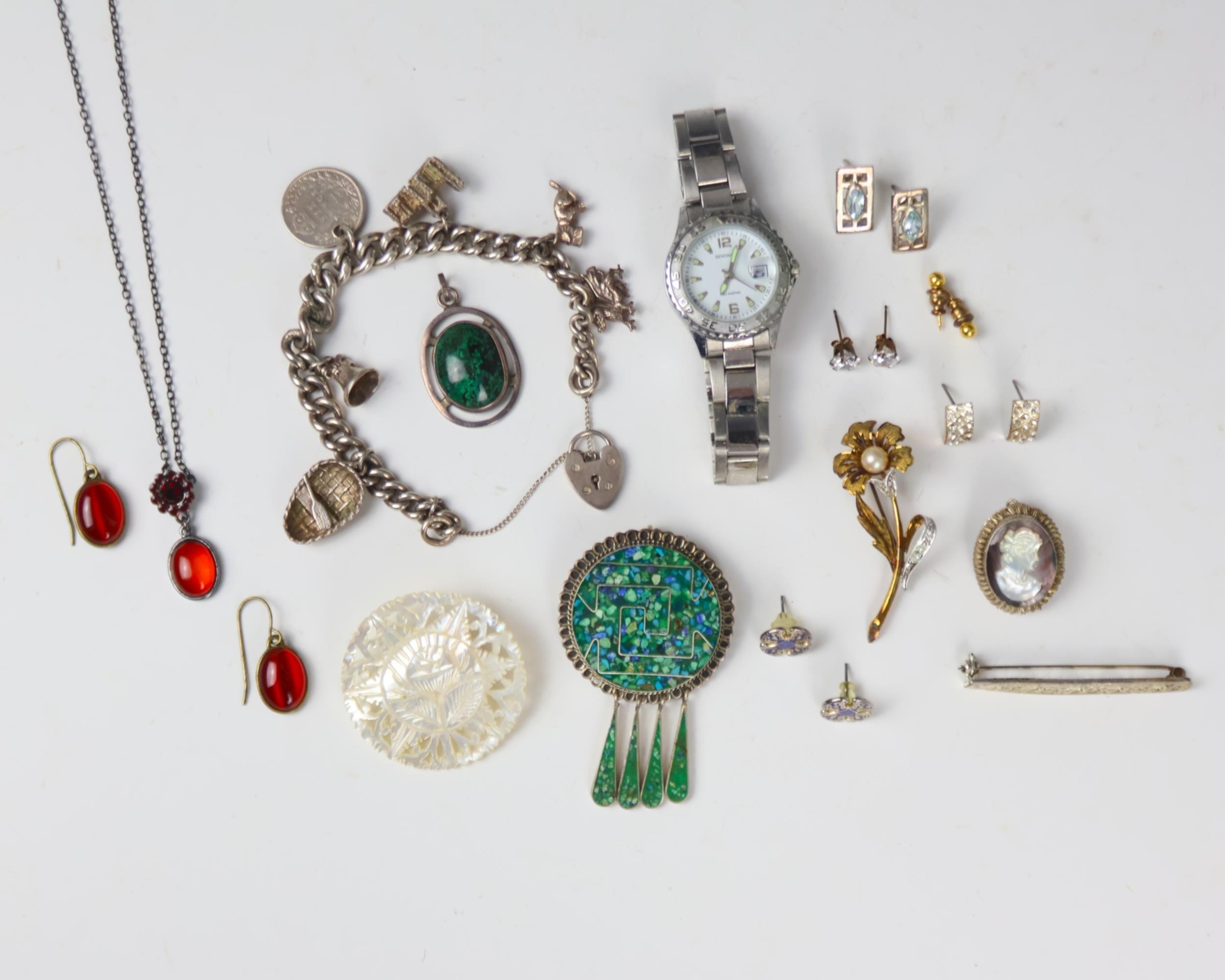 A selection of fine costume jewellery, including a Mexican mosaic style pendant, of circular form with conforming drops, a white metal charm bracelet, suspending various charms, a ladies wristwatch, brooches and further pieces of jewellery (qty) (at fault)