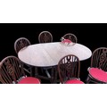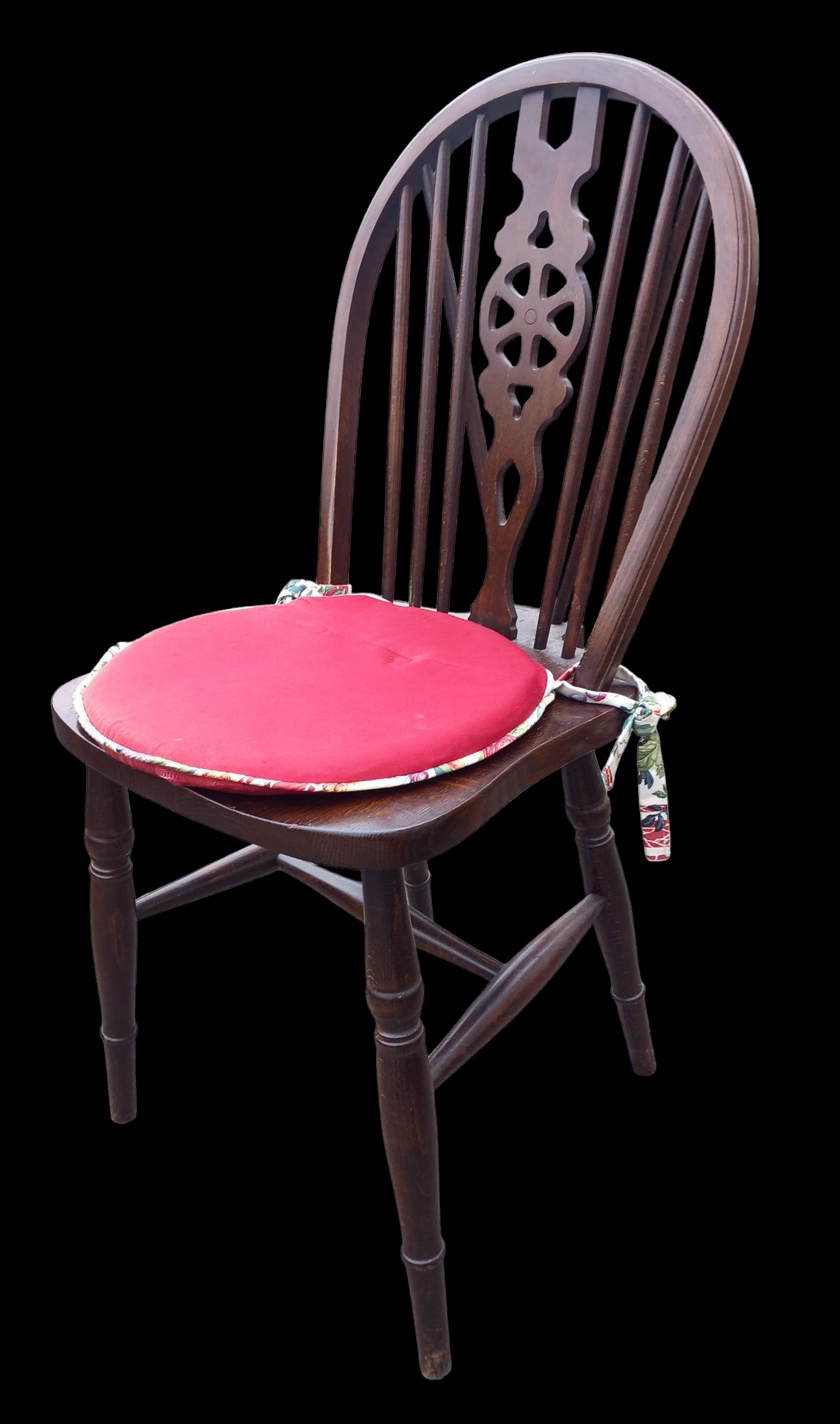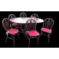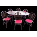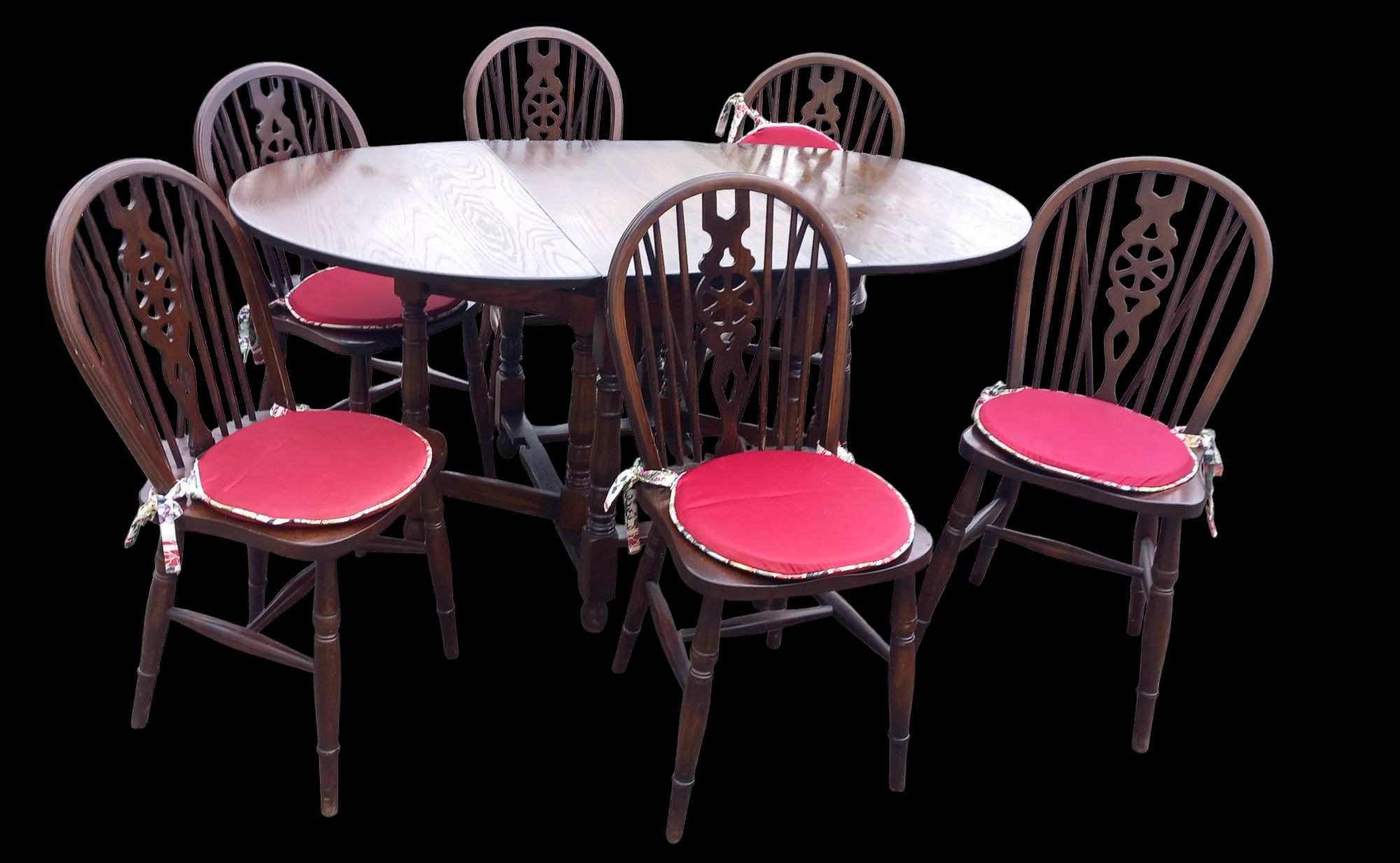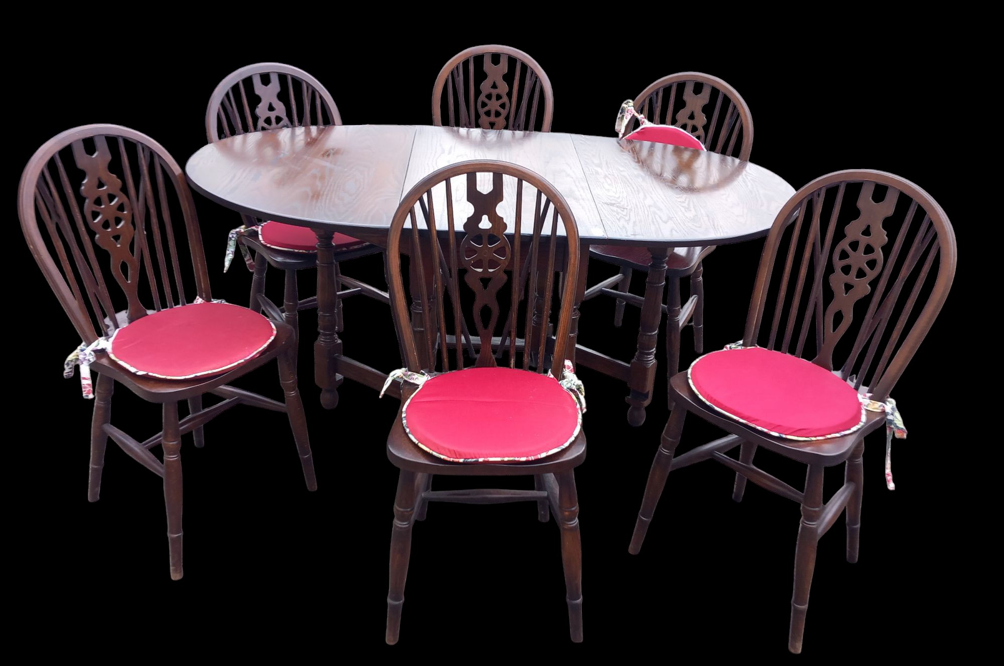 A HIGH QUALITY OAK DROPLEAF TABLE WITH 6 MATCHING WHEEL BACK SADDLE SEAT OAK CHAIRS BY JAYCEE FURNITURE