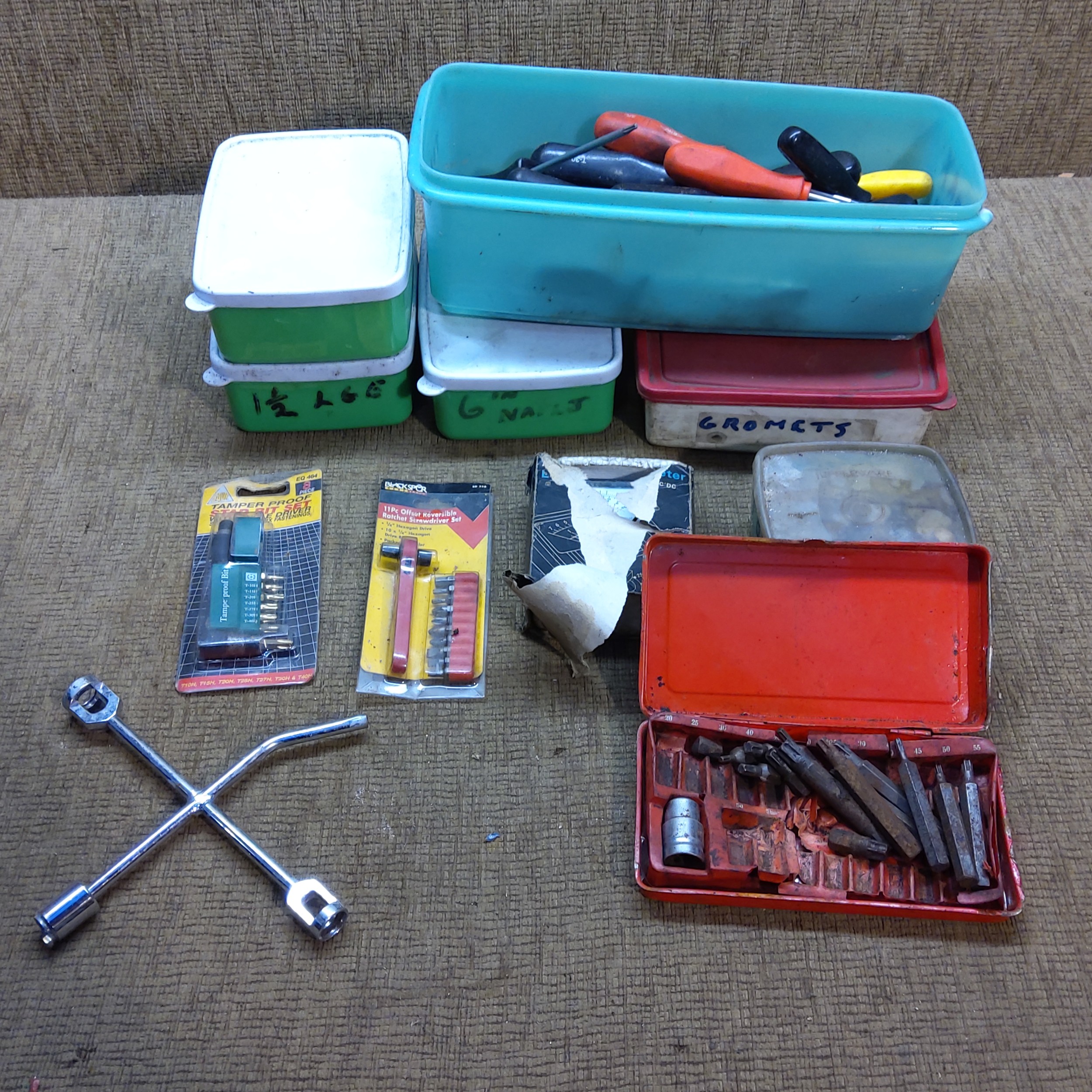 Tools including a box of vintage screwdrivers, a King Dick socket tool box and quantity of fixings.