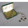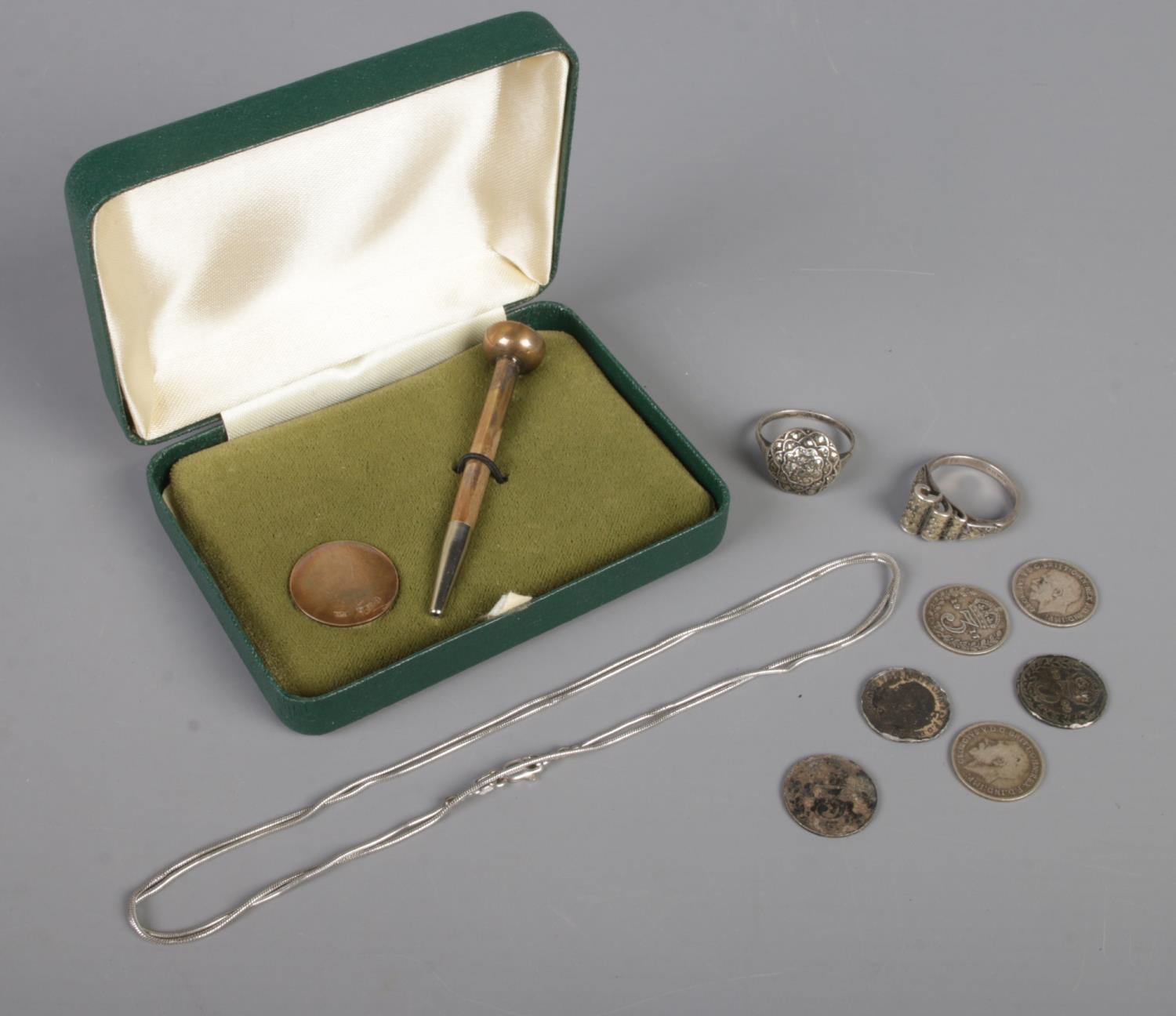 A small quantity of silver. Includes rings, propelling pencil, coins and chain.