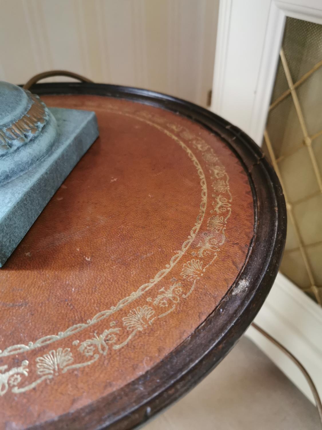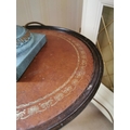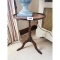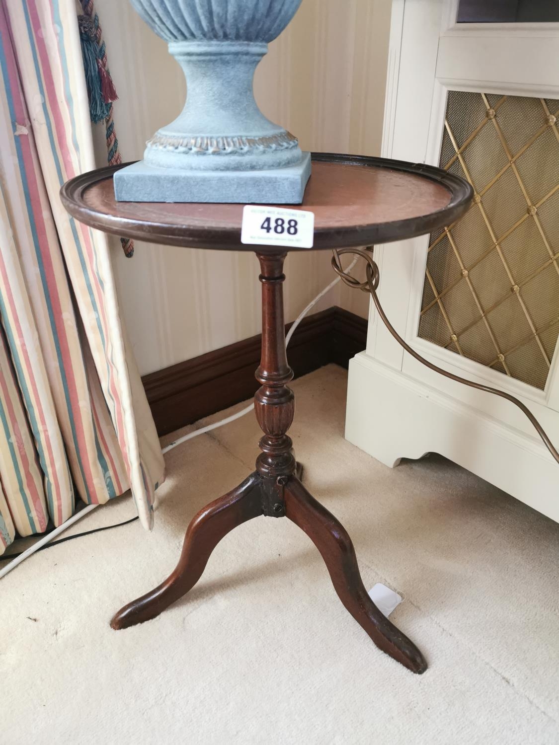 Mahogany wine table, with inset tooled leather top, above a turned column and three outswept legs, in the Georgian style. { 52cm H X 37cm Dia. }.