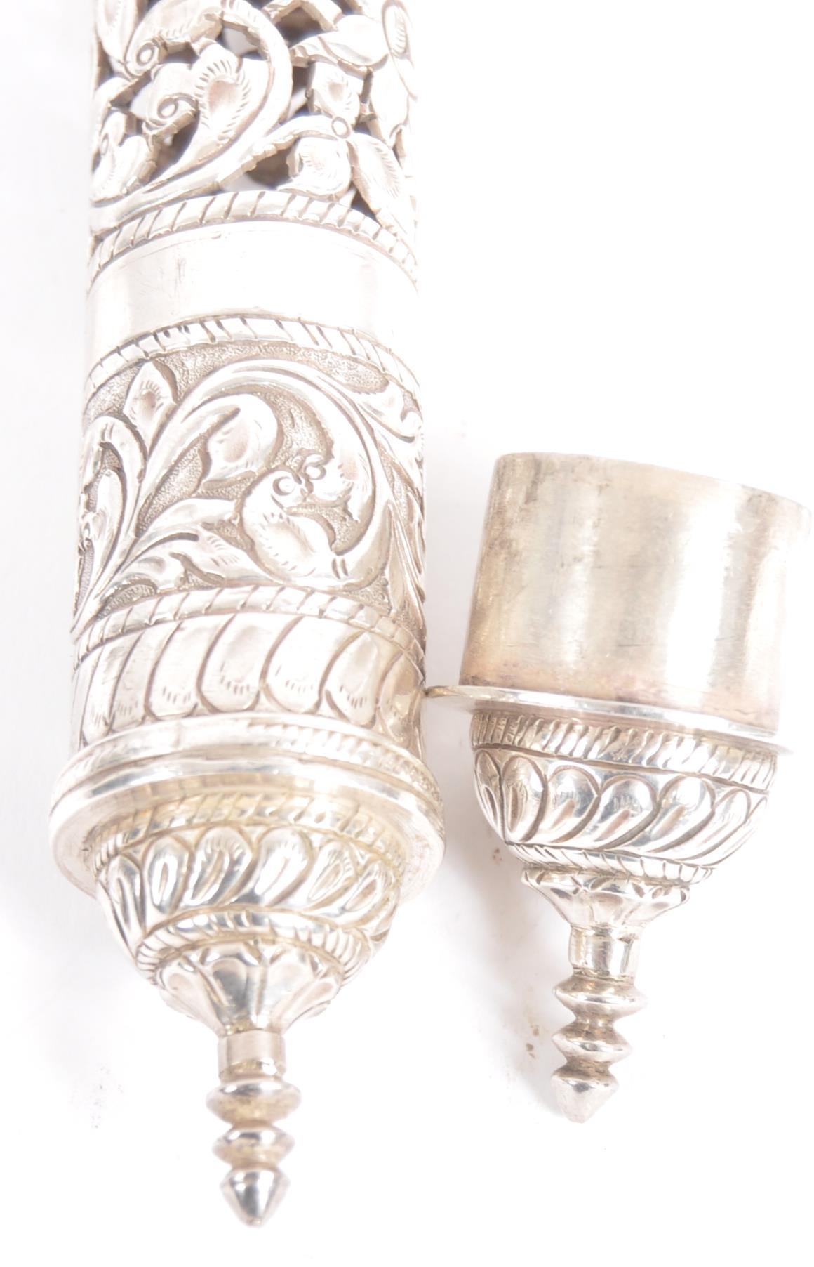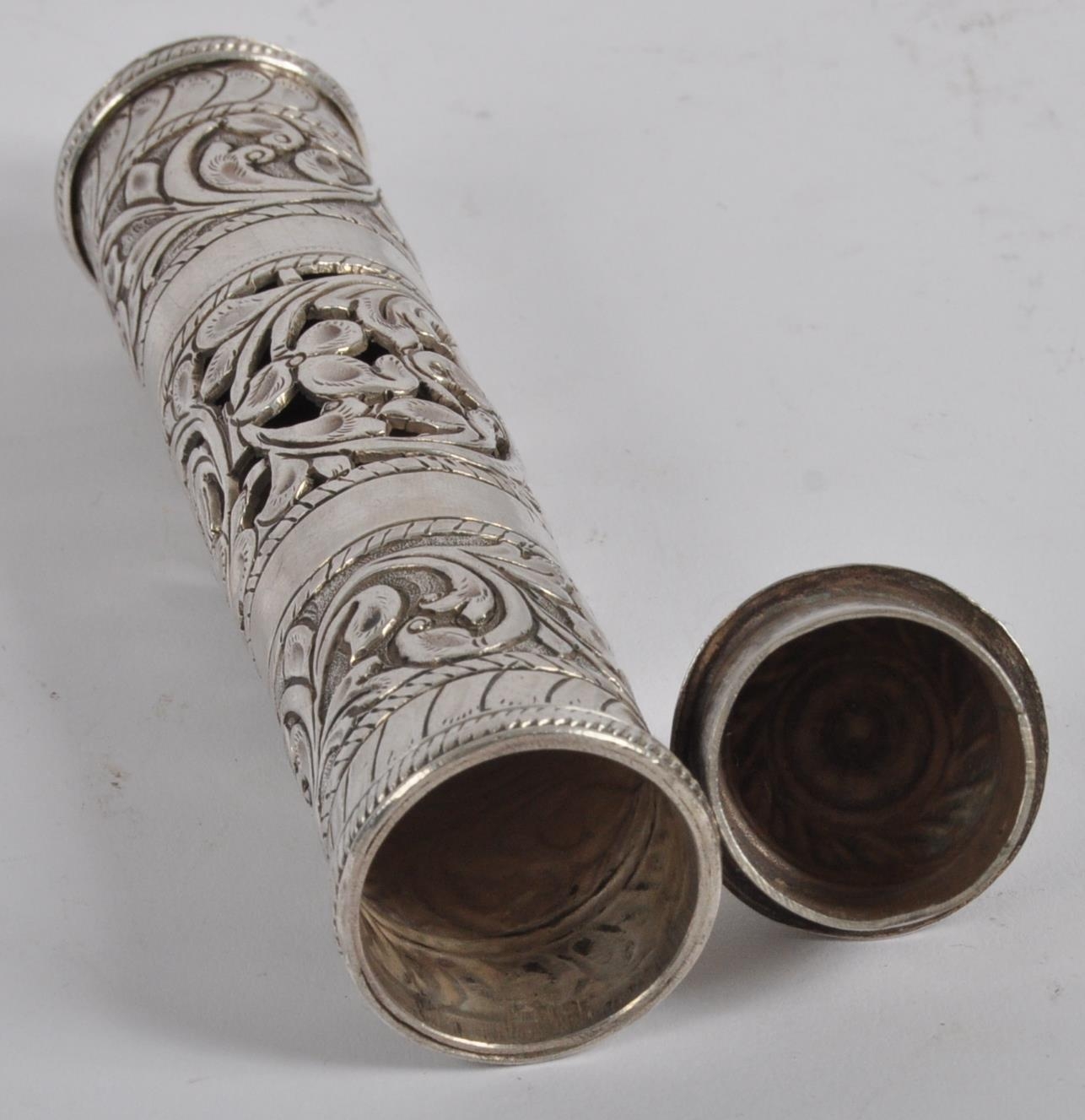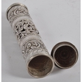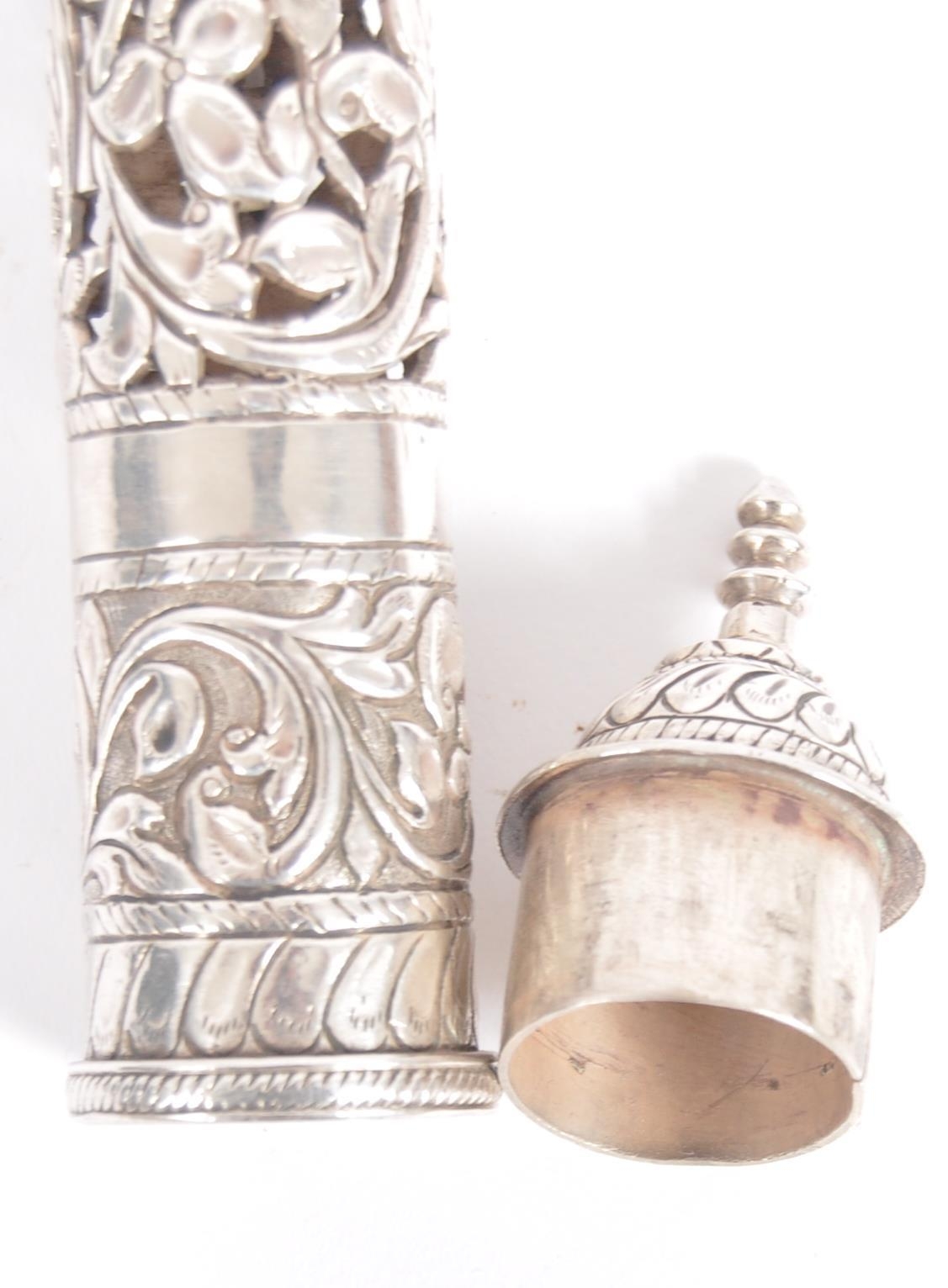 A Indian or Ceylon / Sri Lankan silver scroll / document holder. Of cylindrical form with one end a removable cap, circa late 19th century. The silver scroll holder pierced design featuring traditional silverwork with floral design. Approximately 28cm long.