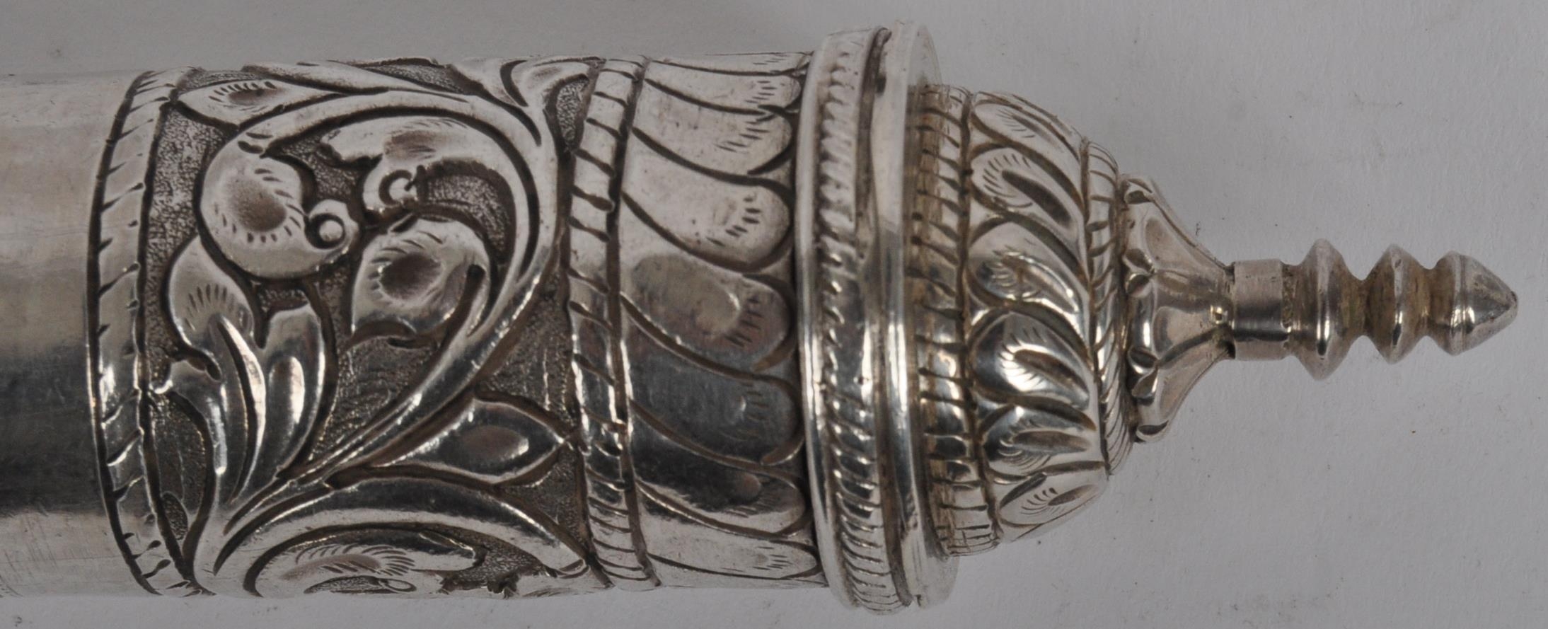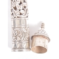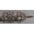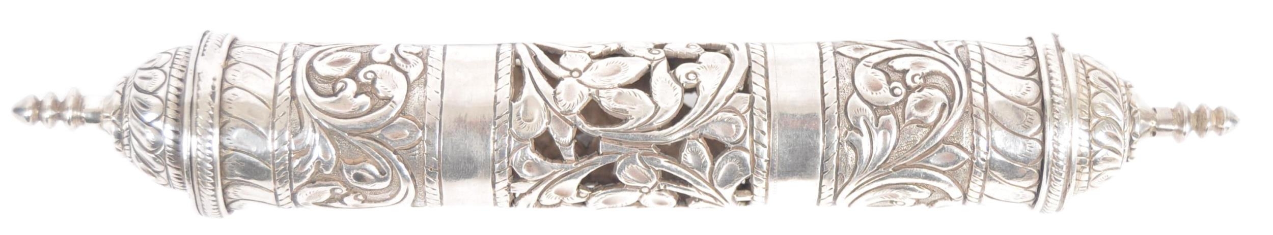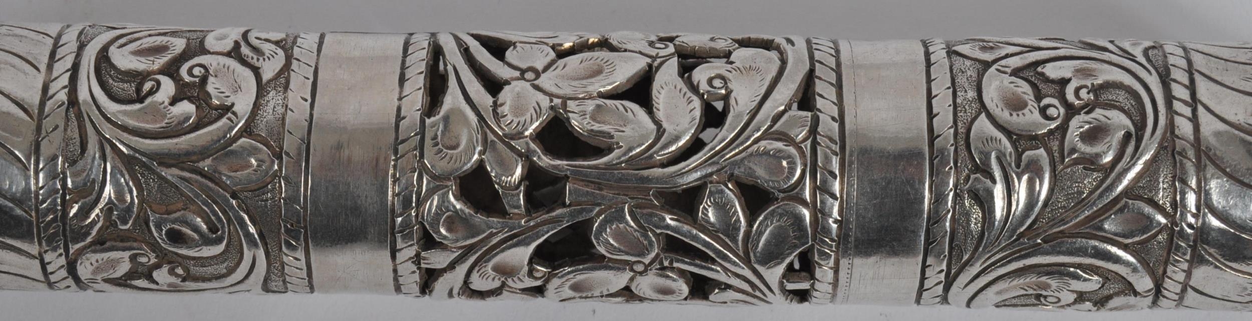 A Indian or Ceylon / Sri Lankan silver scroll / document holder. Of cylindrical form with one end a removable cap, circa late 19th century. The silver scroll holder pierced design featuring traditional silverwork with floral design. Approximately 28cm long.