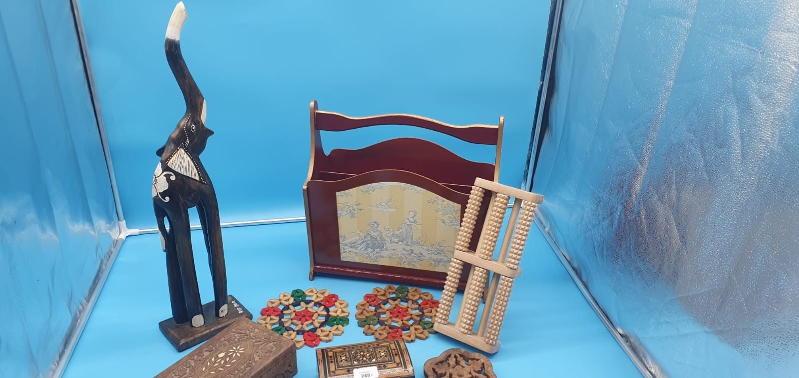 Wood Lot To Include Magazine Rack, Roller, 2 Boxes, Elephant Etc.