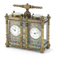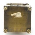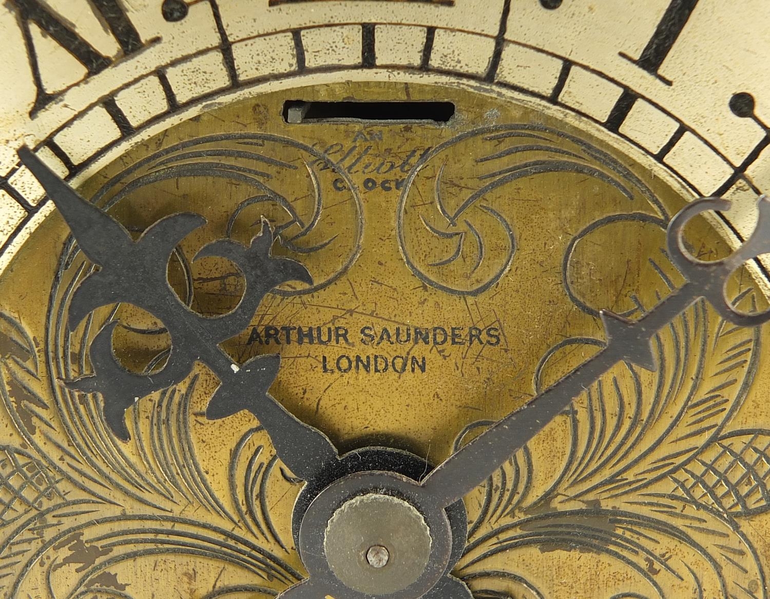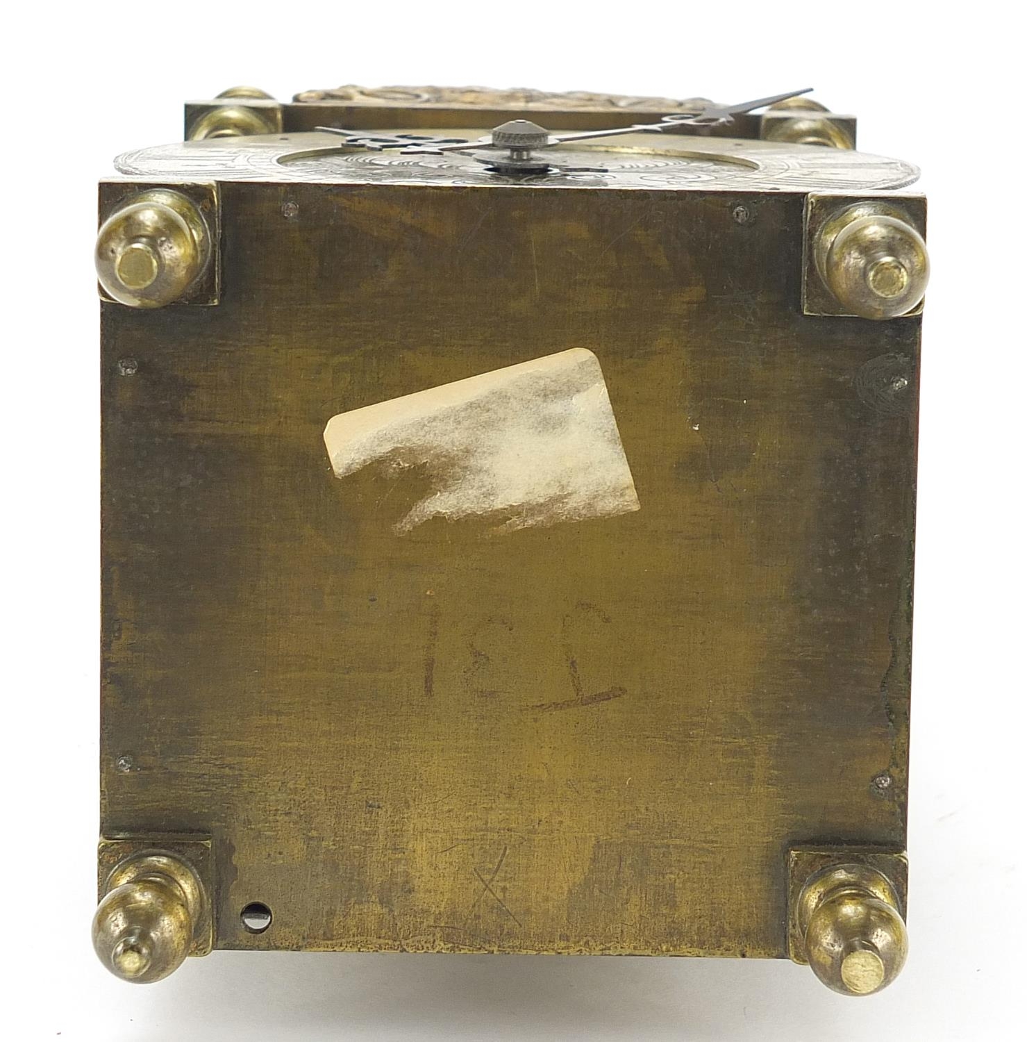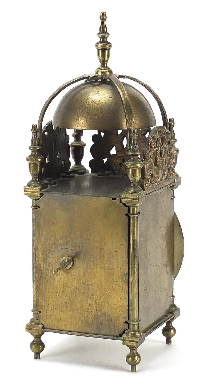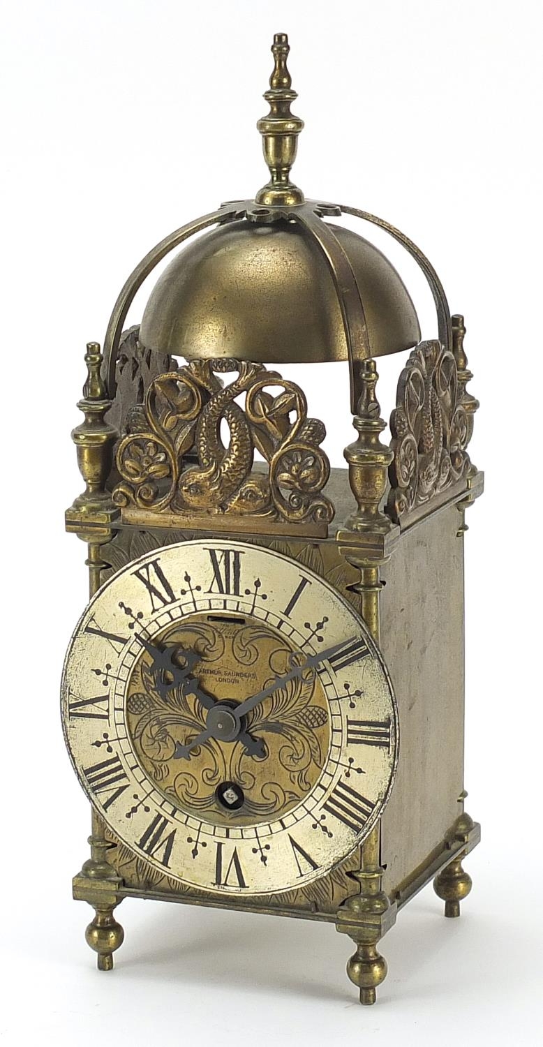 18th century style brass lantern clock with silvered chapter ring having Roman numerals retailed by Arthur Saunders, 30cm high