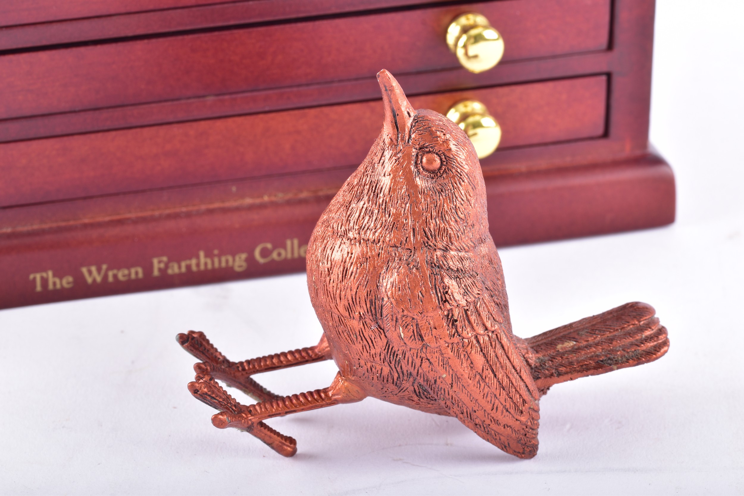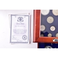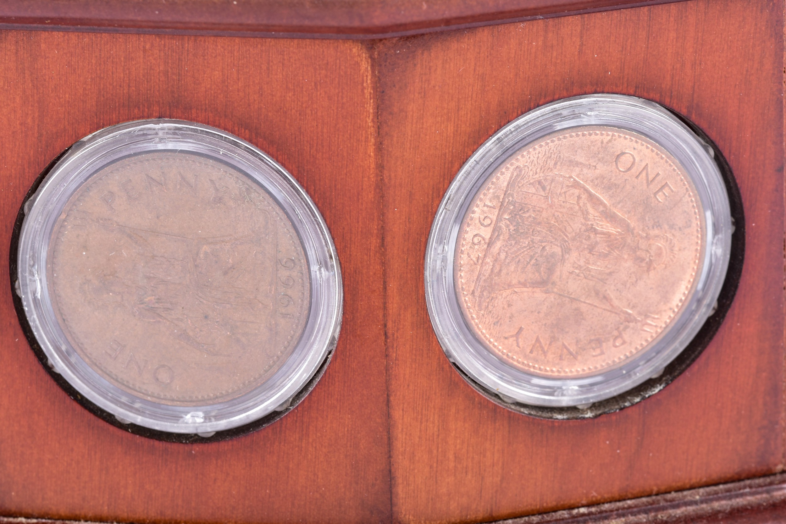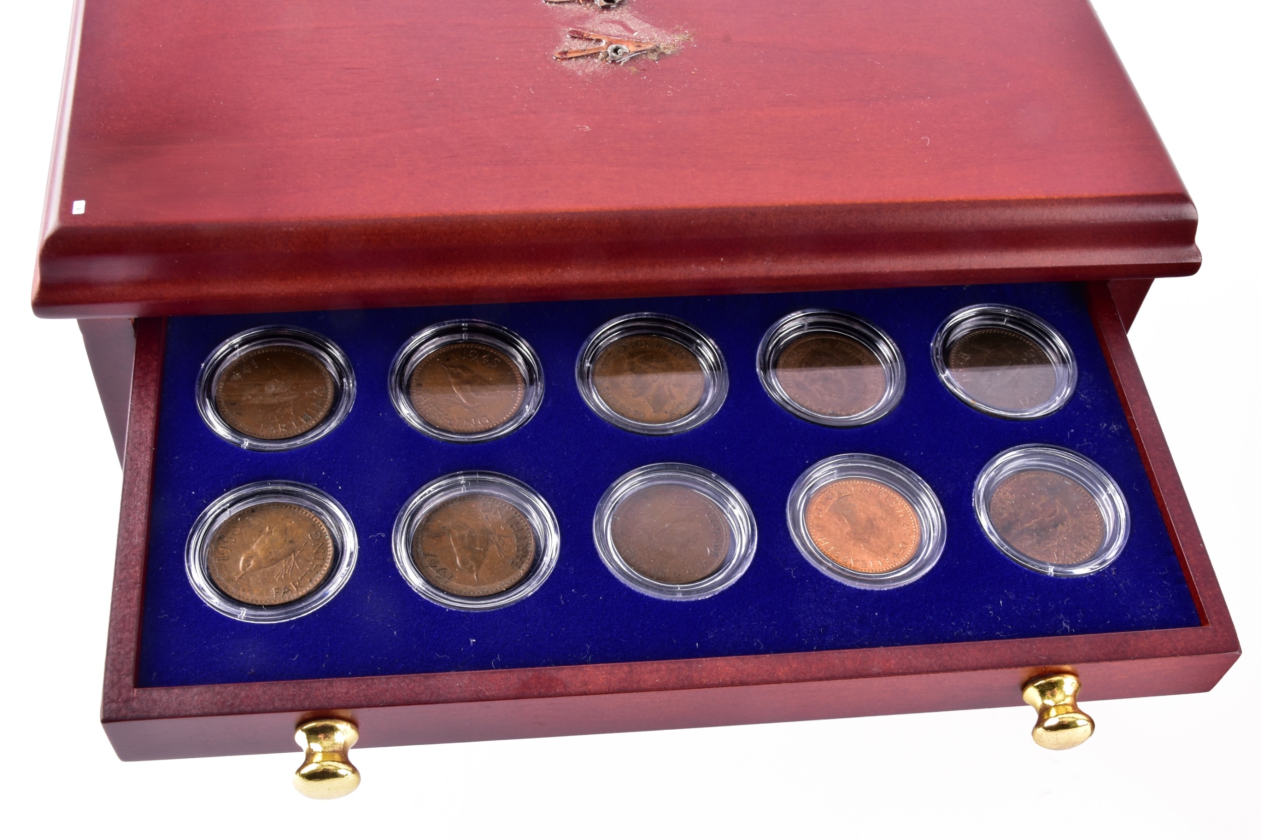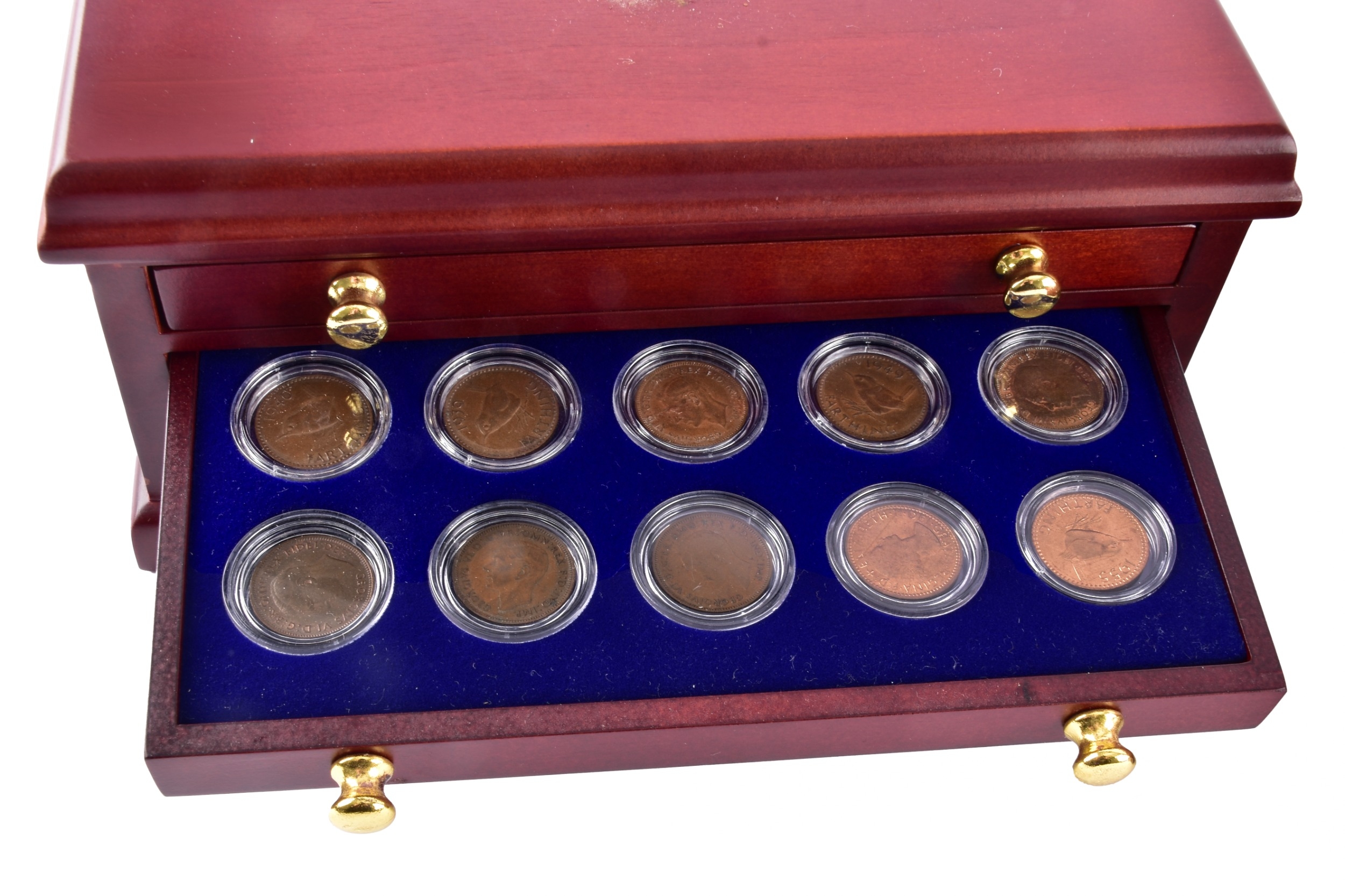 A small collection of silver coins and farthings, twenty in total, housed in a miniature set of collectors drawers, together with a Danbury Mint 'The House of Windsor Silver Coin Collection', a curated set of 18 coins featuring pre-decimal and later currency from the House of Windsor, presented in a wooden case with glazed lid and drawer below.