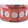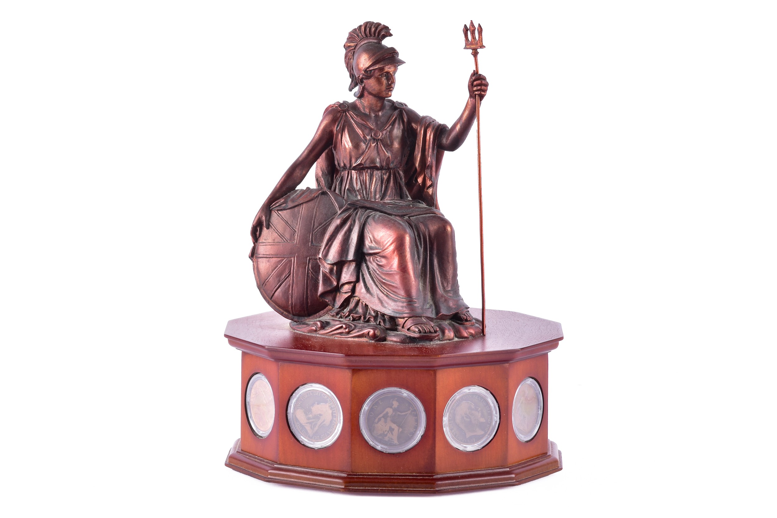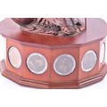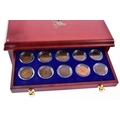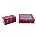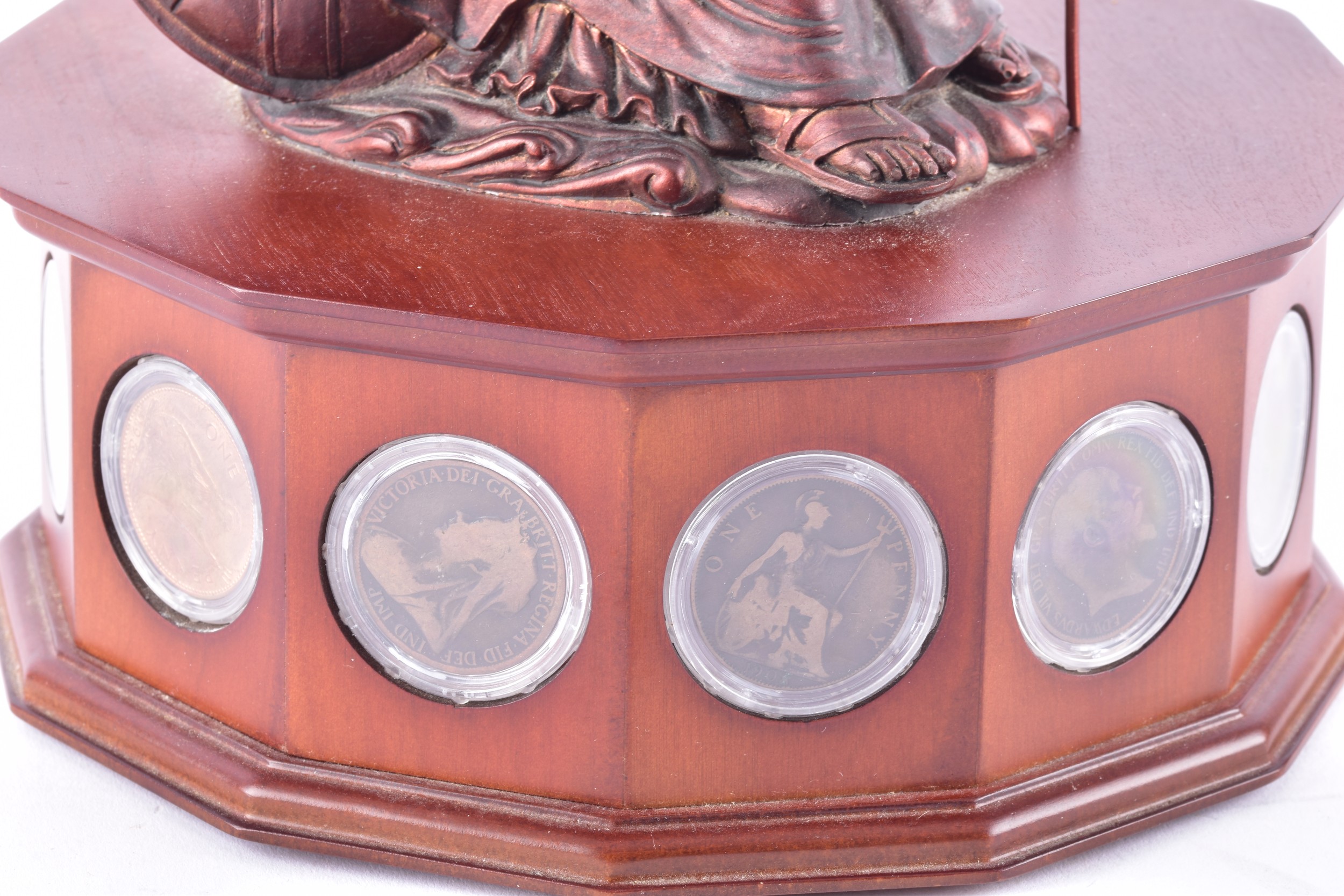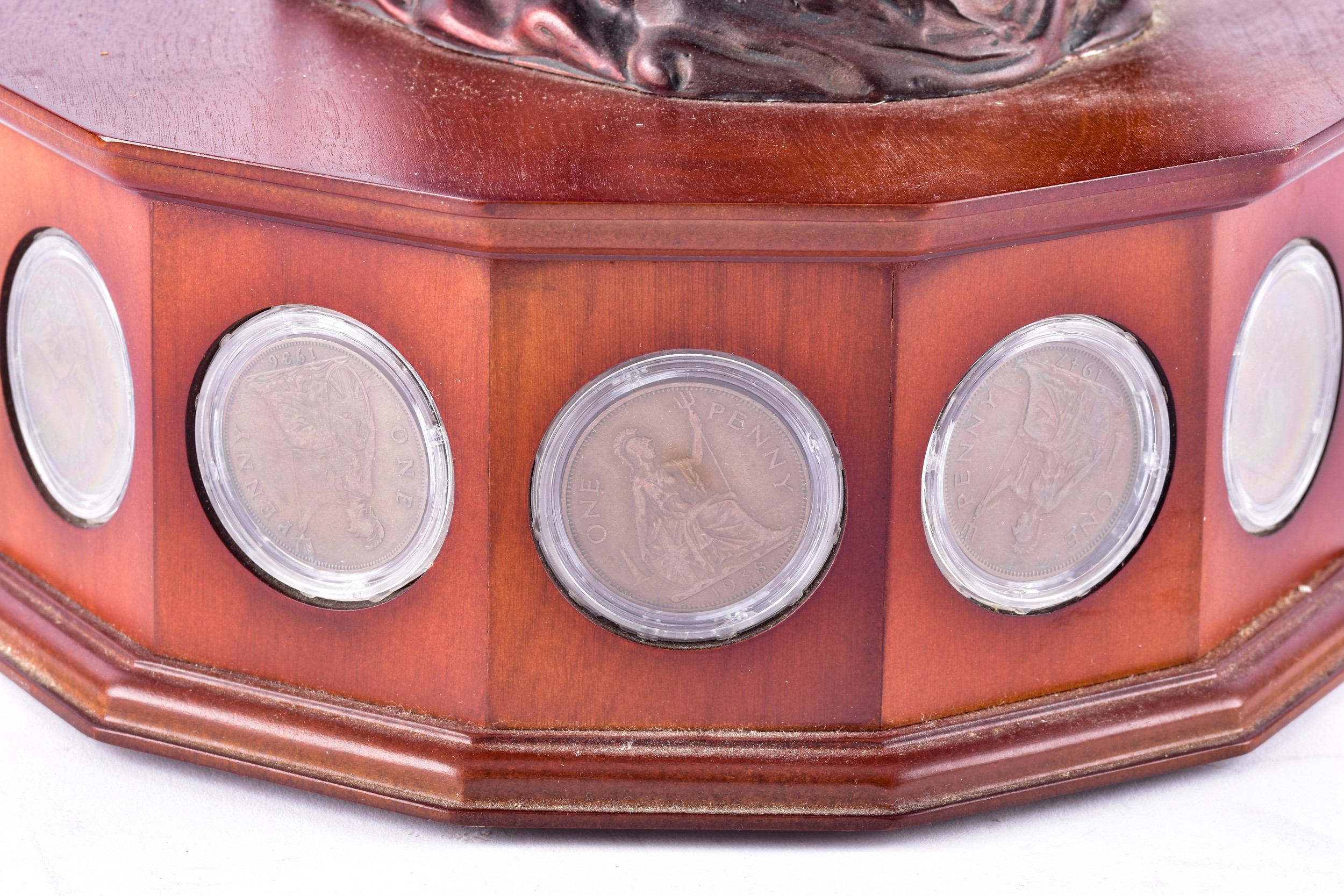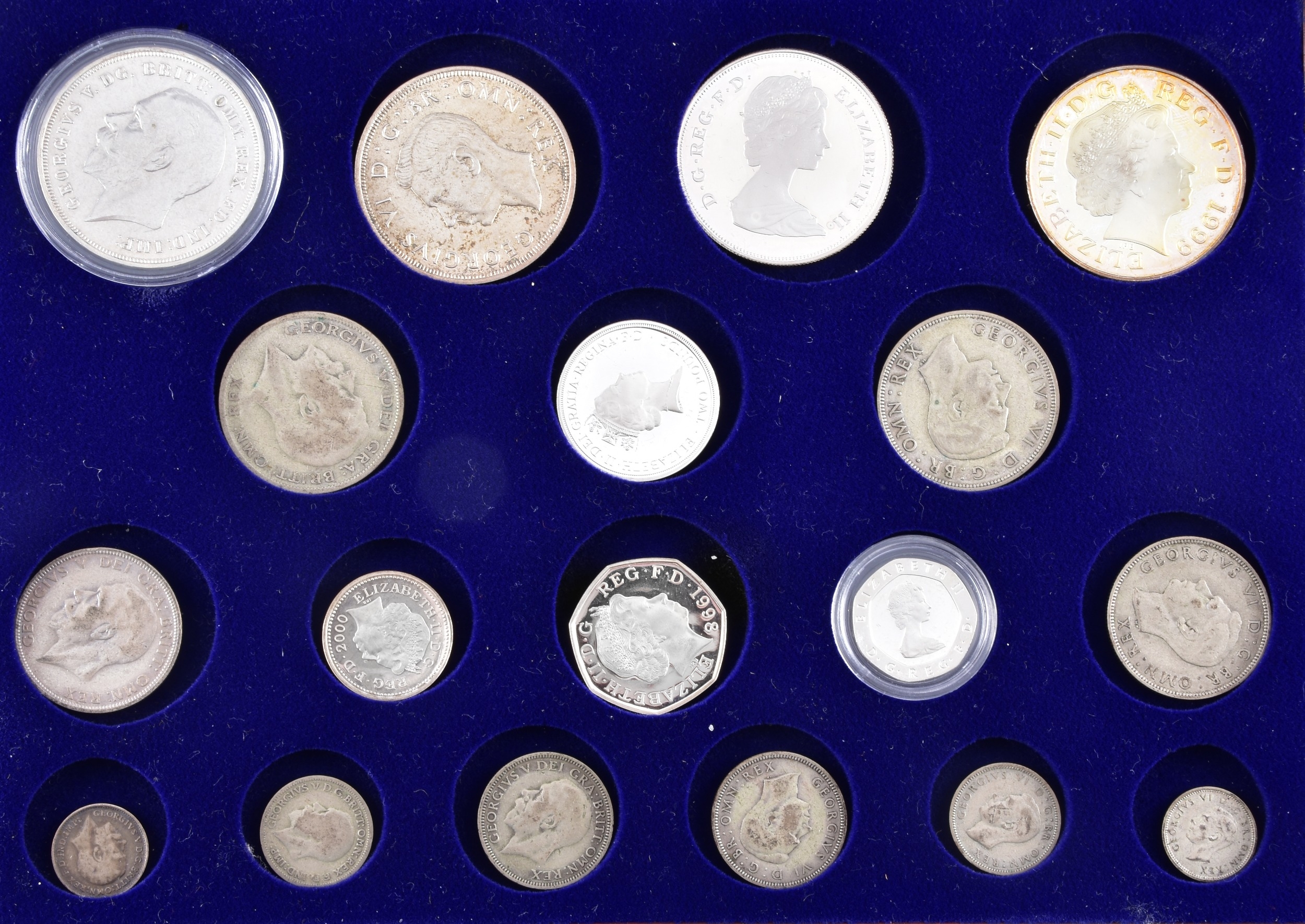 A small collection of silver coins and farthings, twenty in total, housed in a miniature set of collectors drawers, together with a Danbury Mint 'The House of Windsor Silver Coin Collection', a curated set of 18 coins featuring pre-decimal and later currency from the House of Windsor, presented in a wooden case with glazed lid and drawer below.