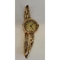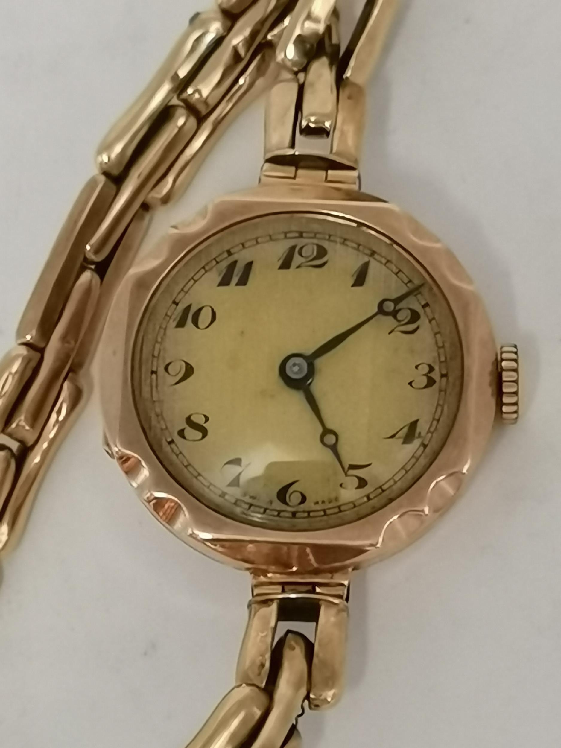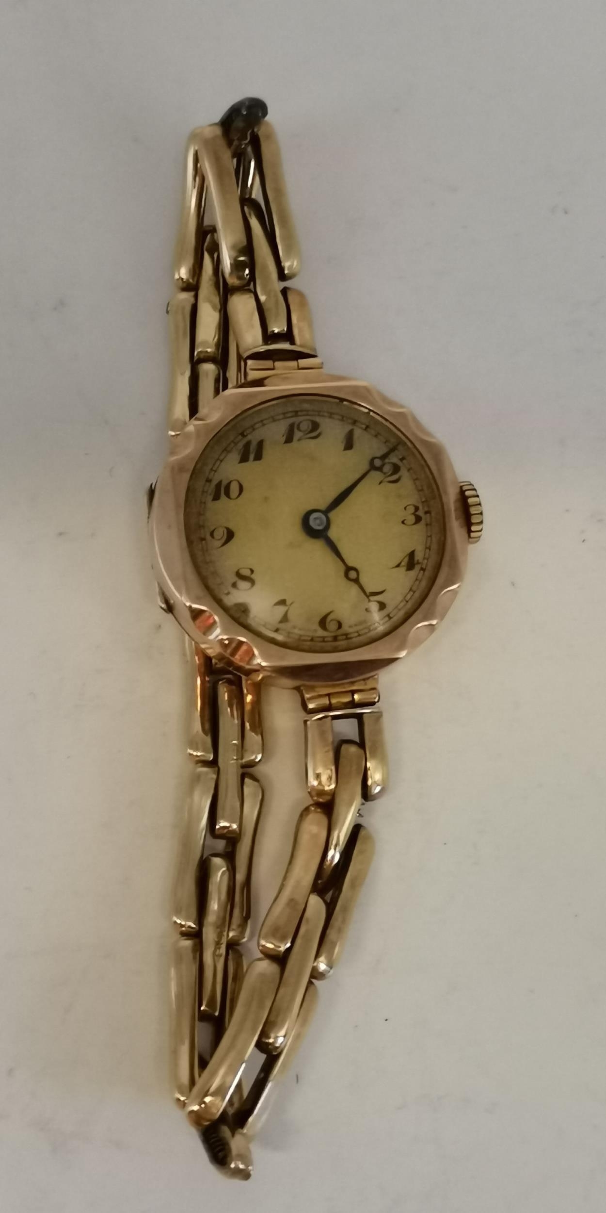 A lady's 9 carat gold expanding bracelet wristwatch, the banded champagne circular dial with black Arabic numerals and blued steel hands, the movement signed Buren 15 Jewels, hallmarked City Watch Case Co Ltd (Louis Arnould), London 1927, each middle brick-link bracelet link stamped 9CT. Case 25m diameter, 19.2g gross (incl. movement)
