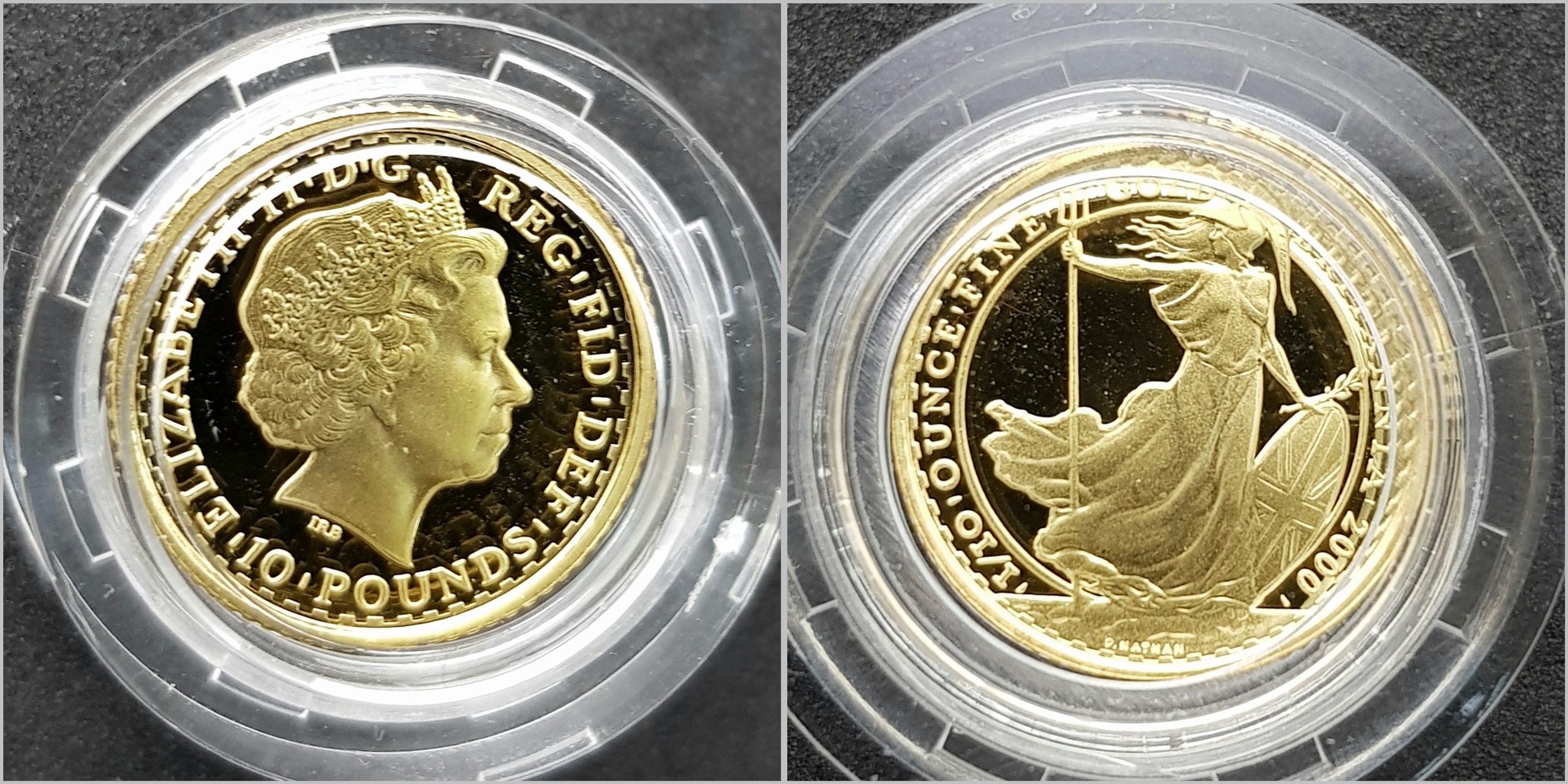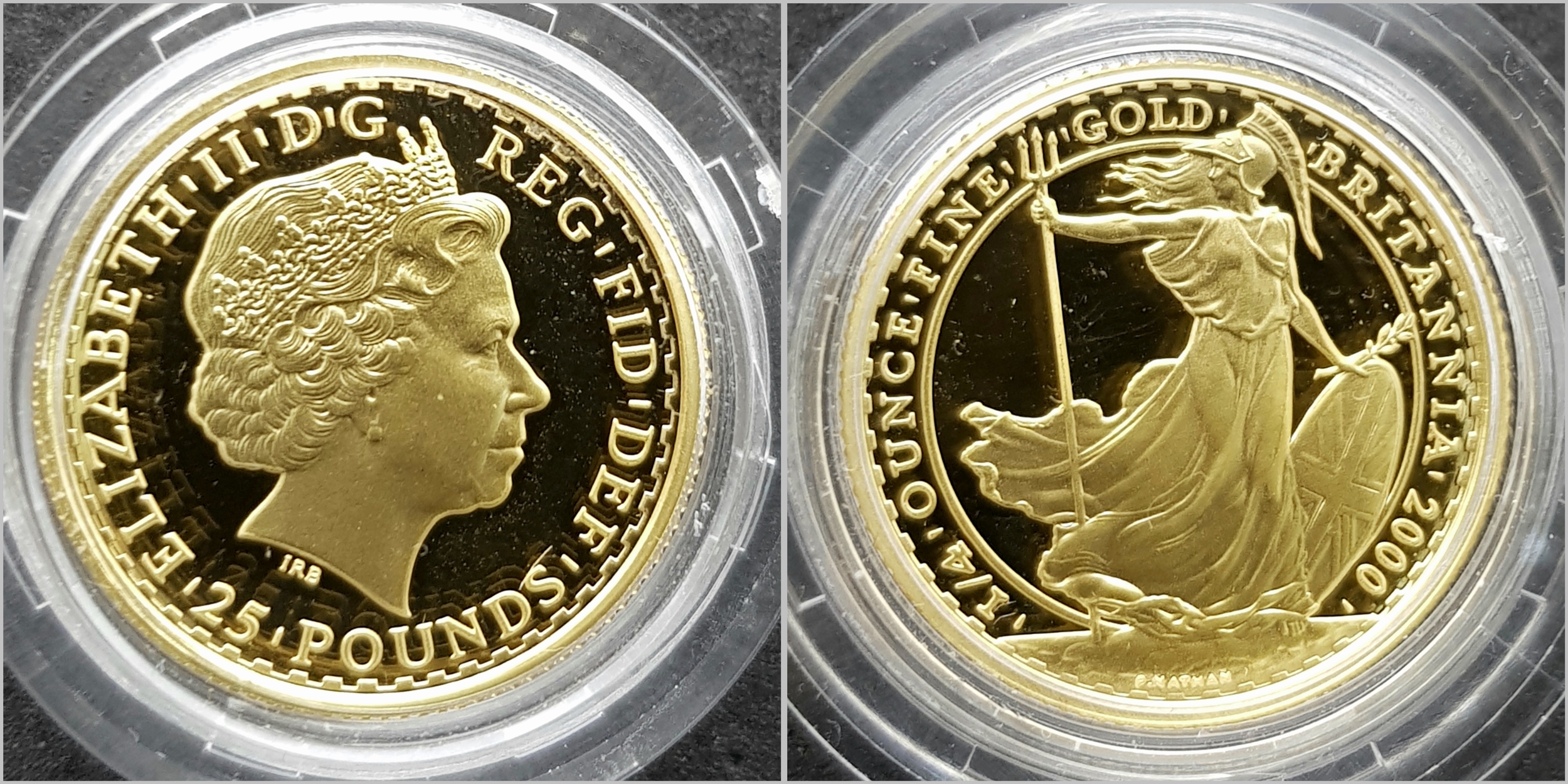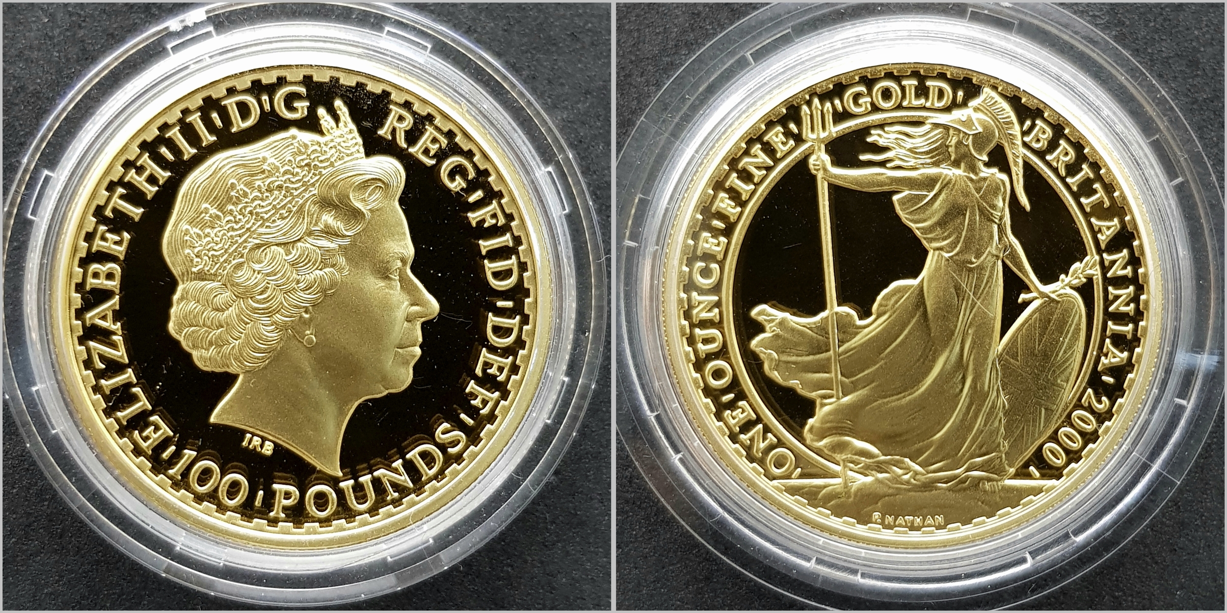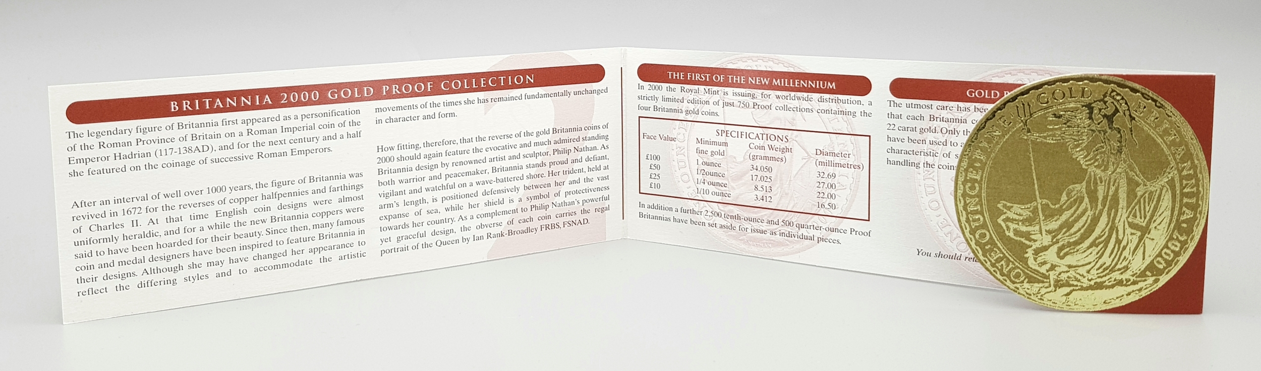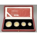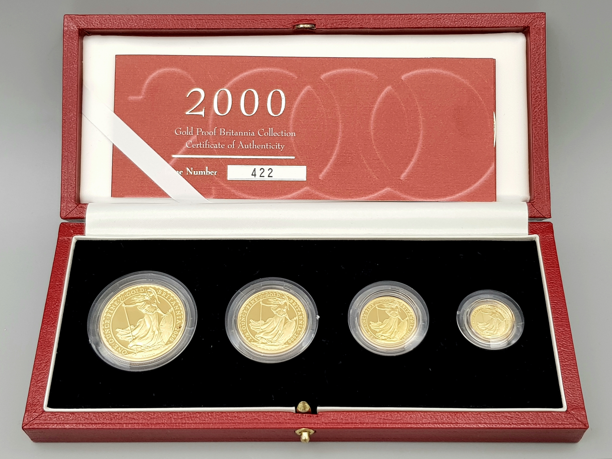 A Royal Mint 2000 Gold Proof Britannia Coin Collection. This coin set features 4 x 22k gold coins polished to a proof finish. This set comes with its own presentation case and certificate of authenticity. Coins Include: £100 - 34.050g. £50 - 17.025g, £25 - 8.513g and £10 - 3.412g. 63g total weight. Limited edition 422 of 750. In excellent condition. A wonderful coin collectible or gift to hand down to loved ones.