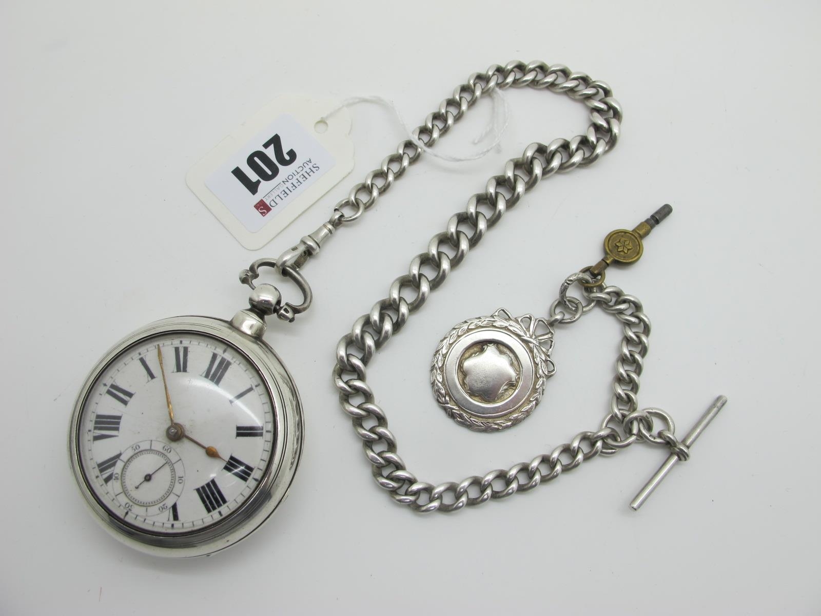 A Hallmarked Silver Cased Pair Case Pocket Watch, the white dial with black Roman numerals and seconds subsidiary dial, within plain case, Birmingham 1866, in matching plain pair case (Birmingham 1866); Together with A Graduated Curb Link Albert Chain, suspending T-bar and a hallmarked silver medallion pendant "League Championship Winners C. Strike 1946".