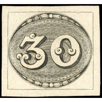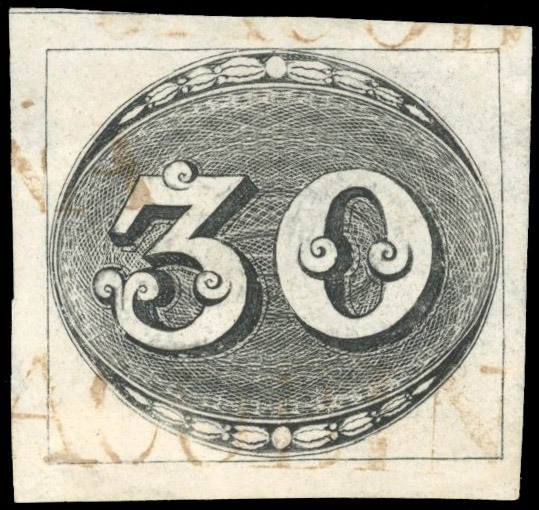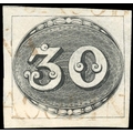 Bull's Eye: 1843 Intermediate Impression 30r, four good to large margins, fresh used with part three unframed brownish red straight-line cancels, slight paper thinning towards top left, a fine-looking example.