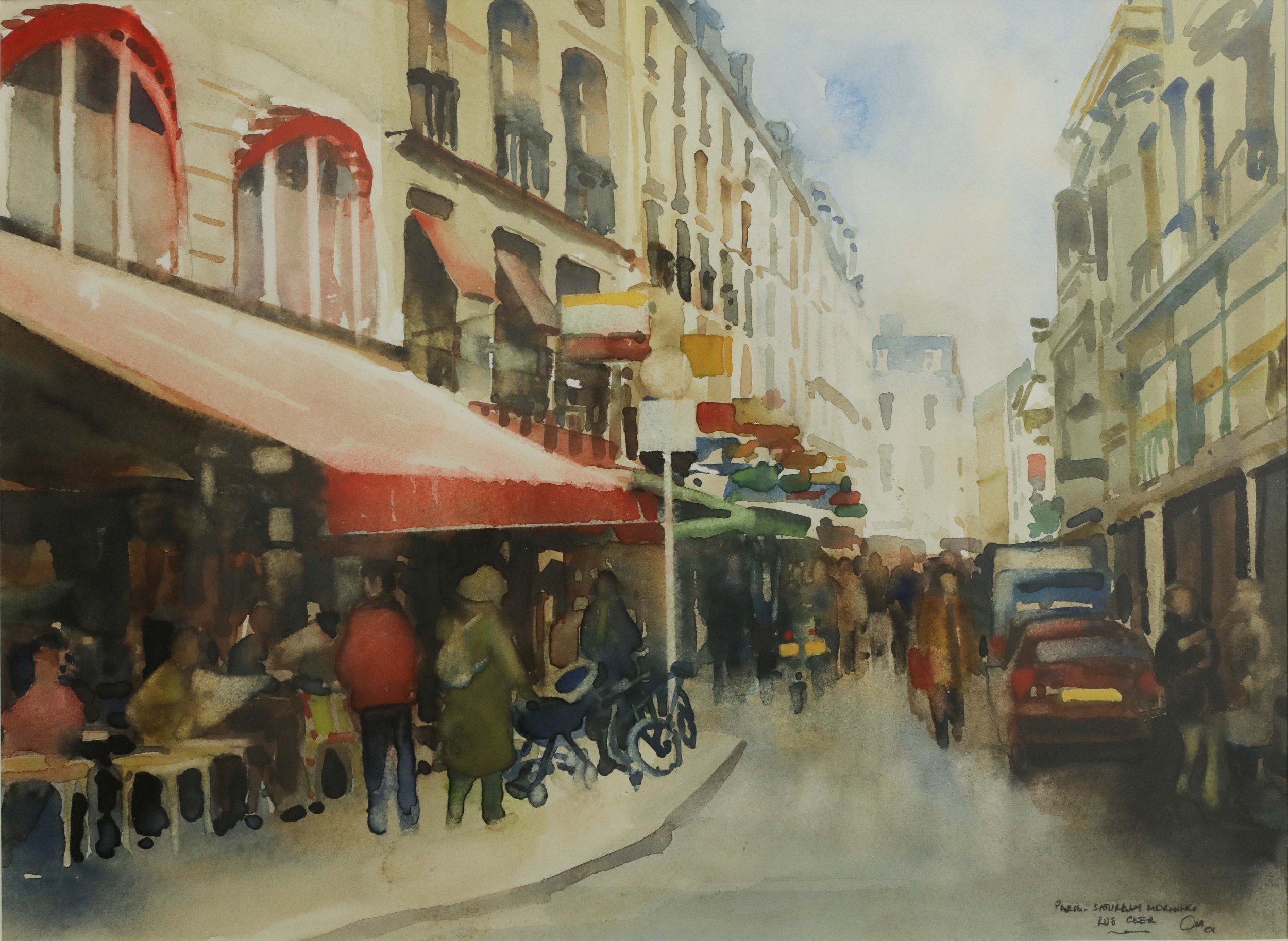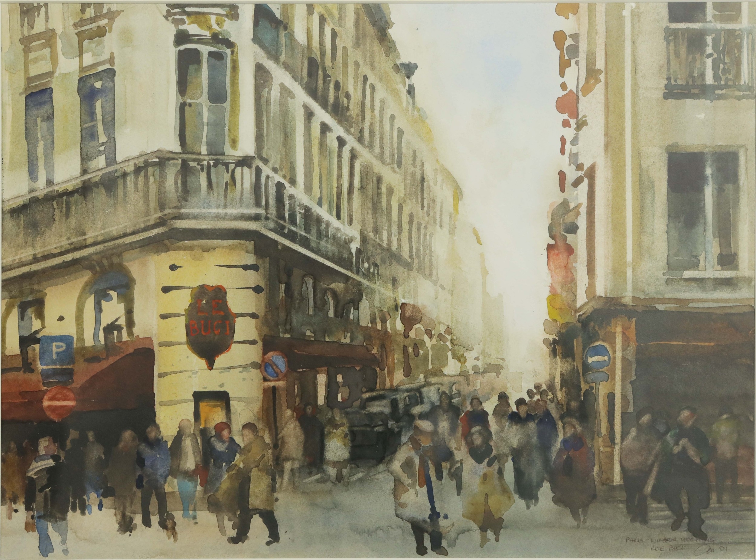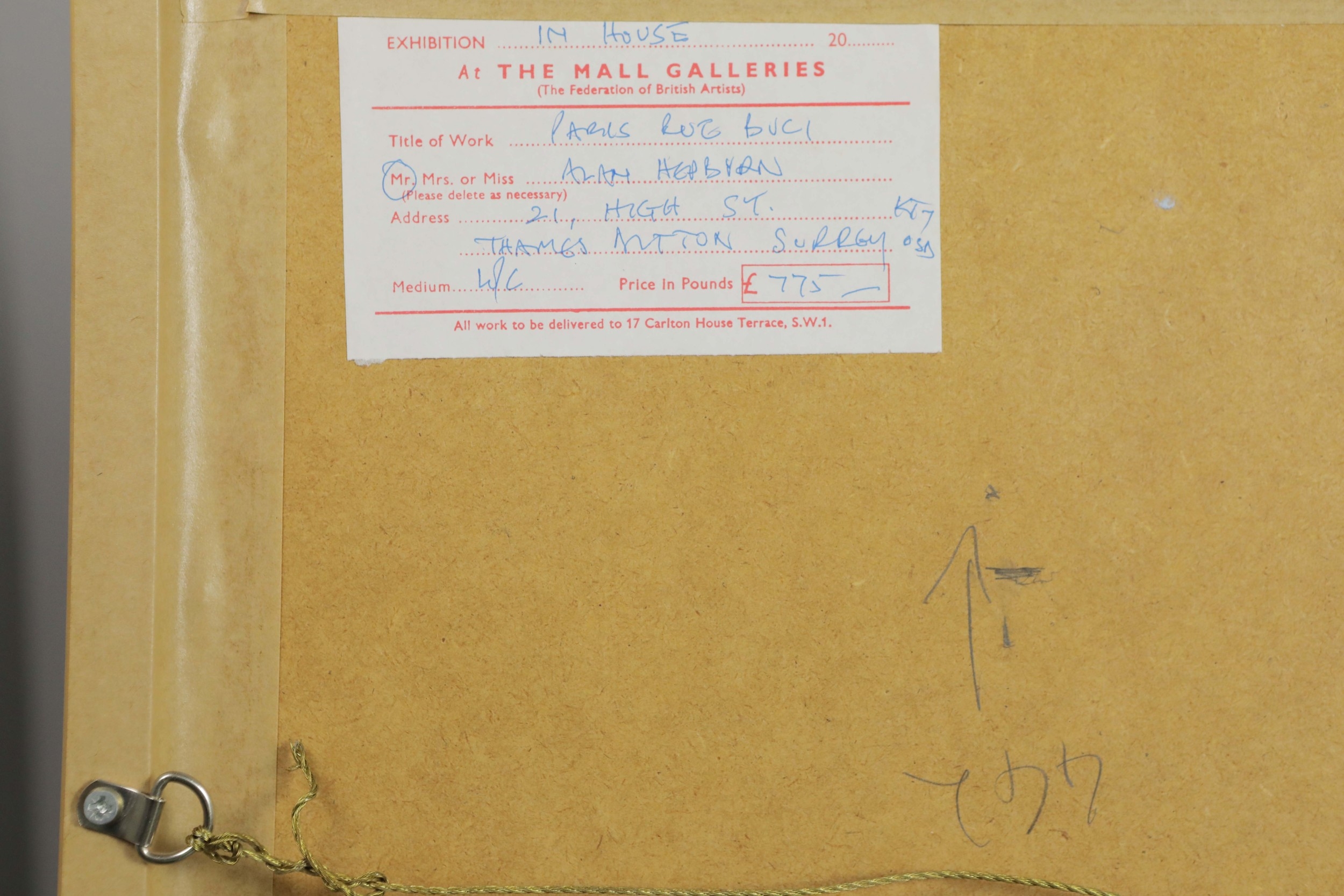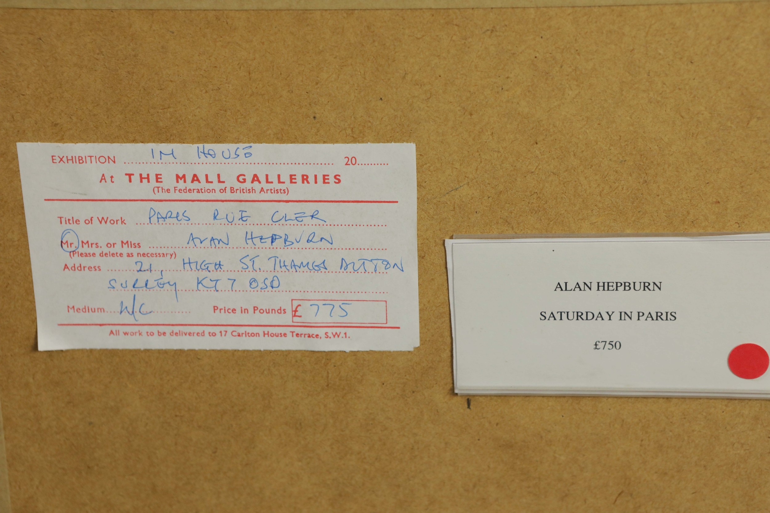 ALAN HEPBURN WATERCOLOURS, A PAIR. Parisian street scenes, bears Mall Galleries label to verso , each image 33cm t x 45 cm w, framed (2).