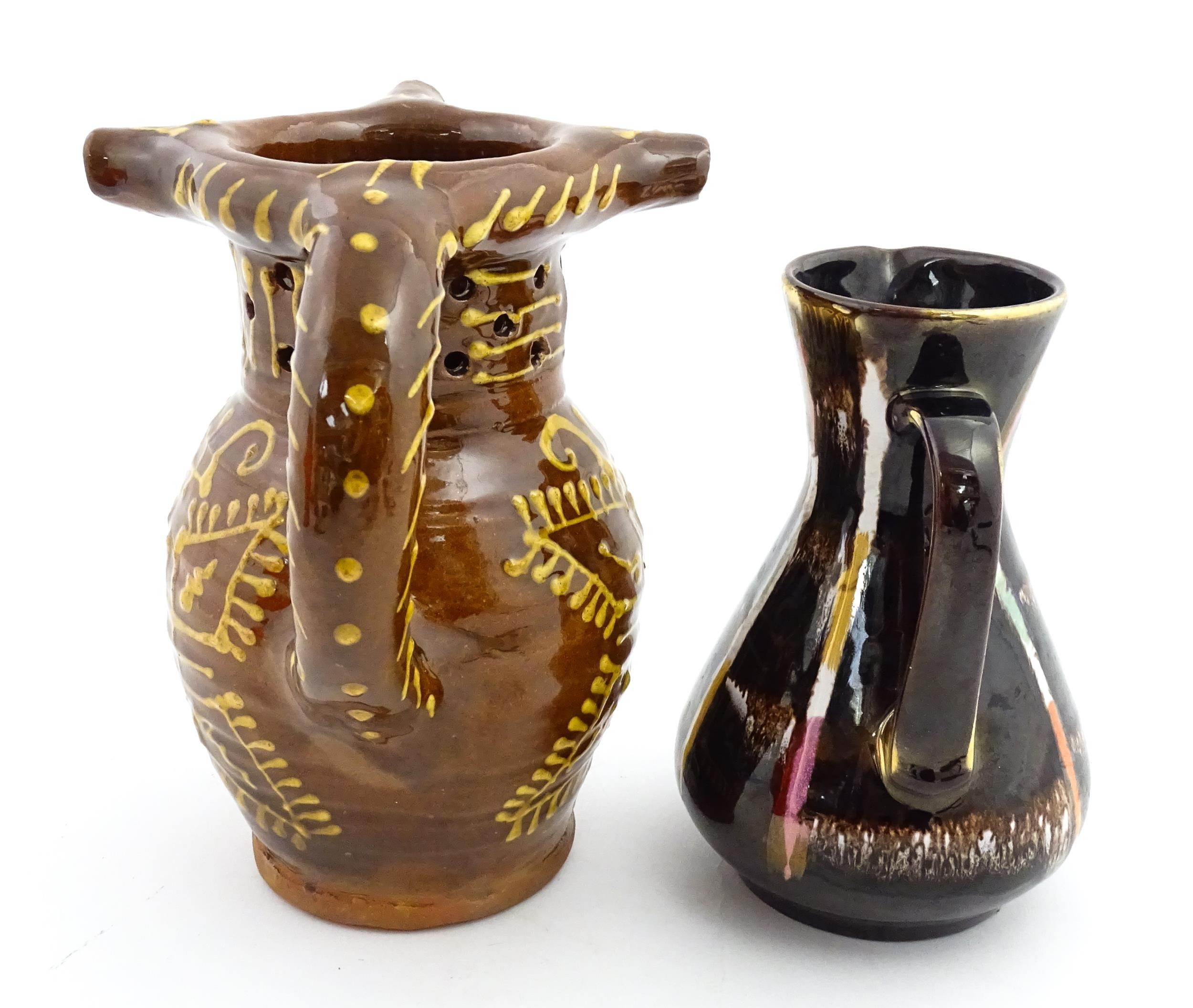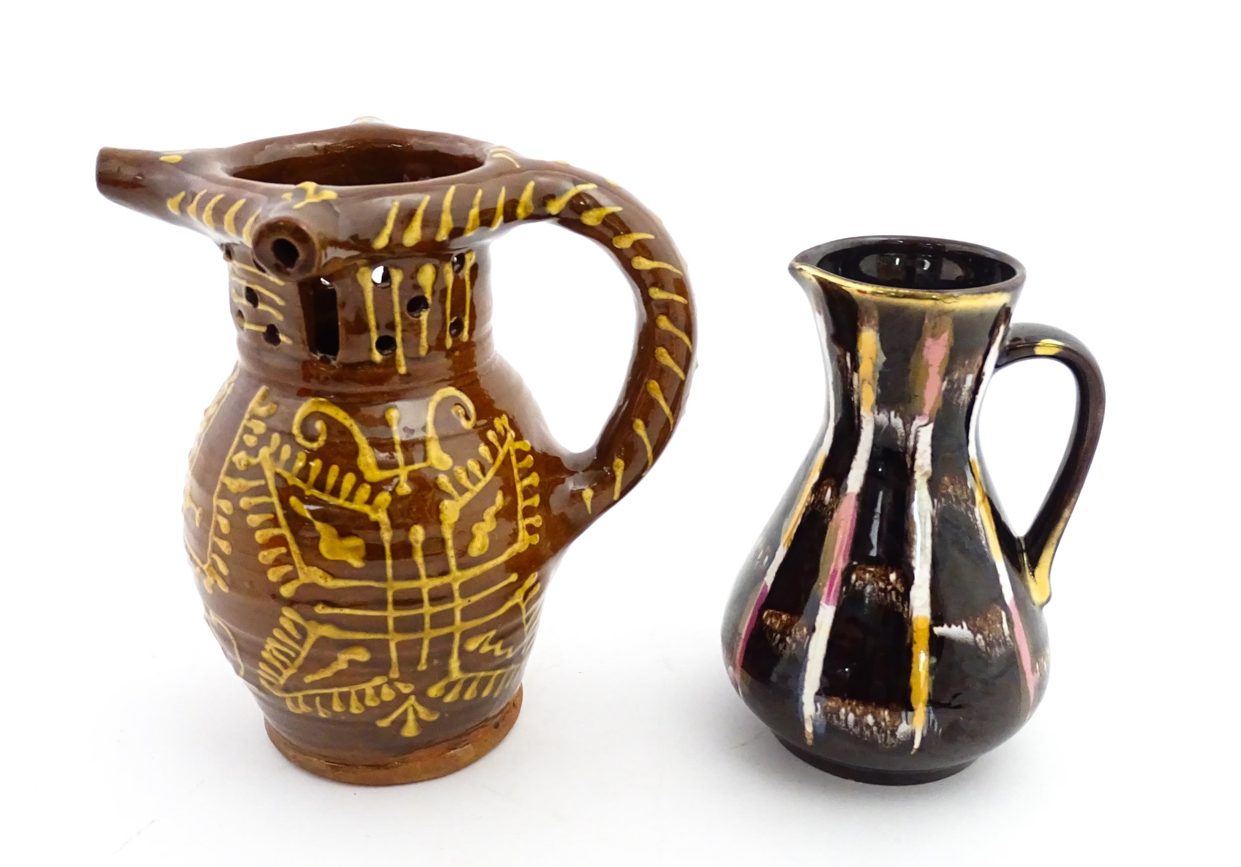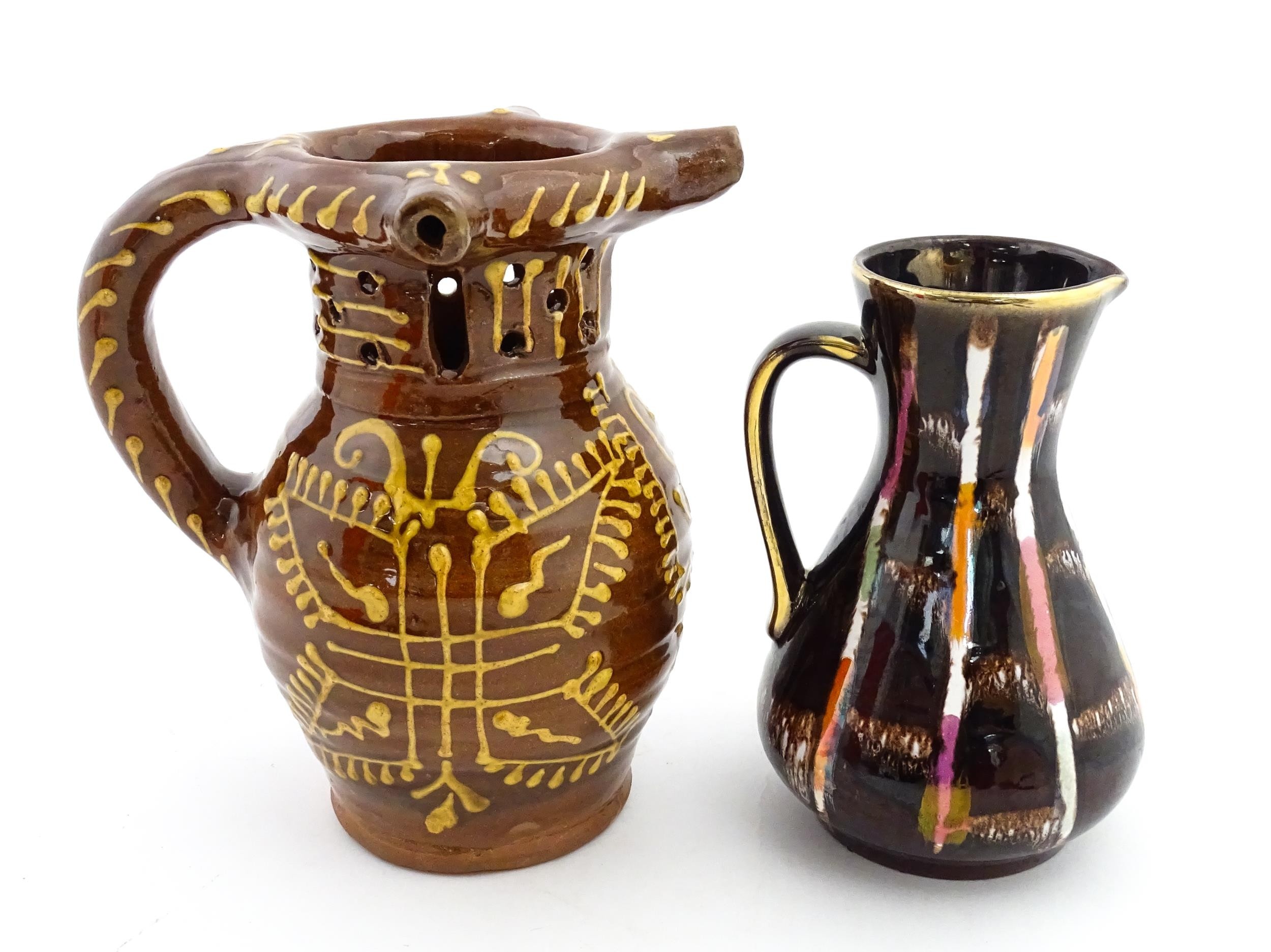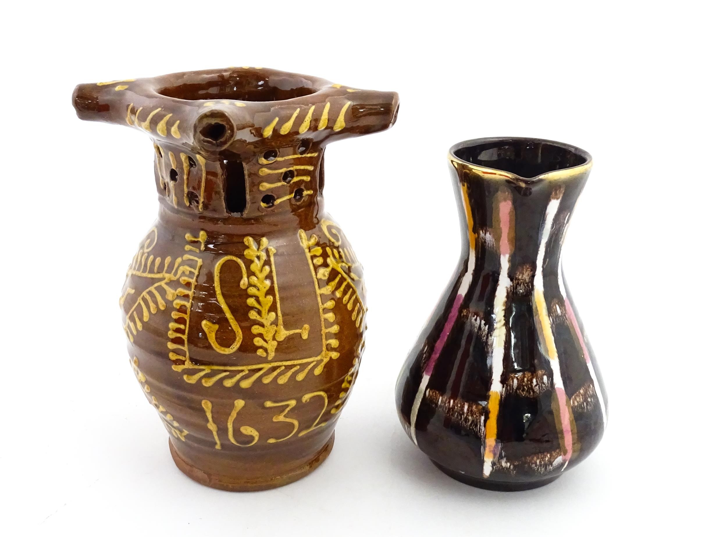 An earthenware puzzle jug with slipware decoration having a pierced neck, decorated with the initials 'SL' and number '1632'. Together with a West German jug. Largest approx. 8 1/4" high (2)