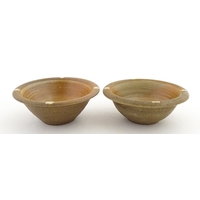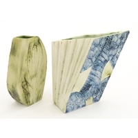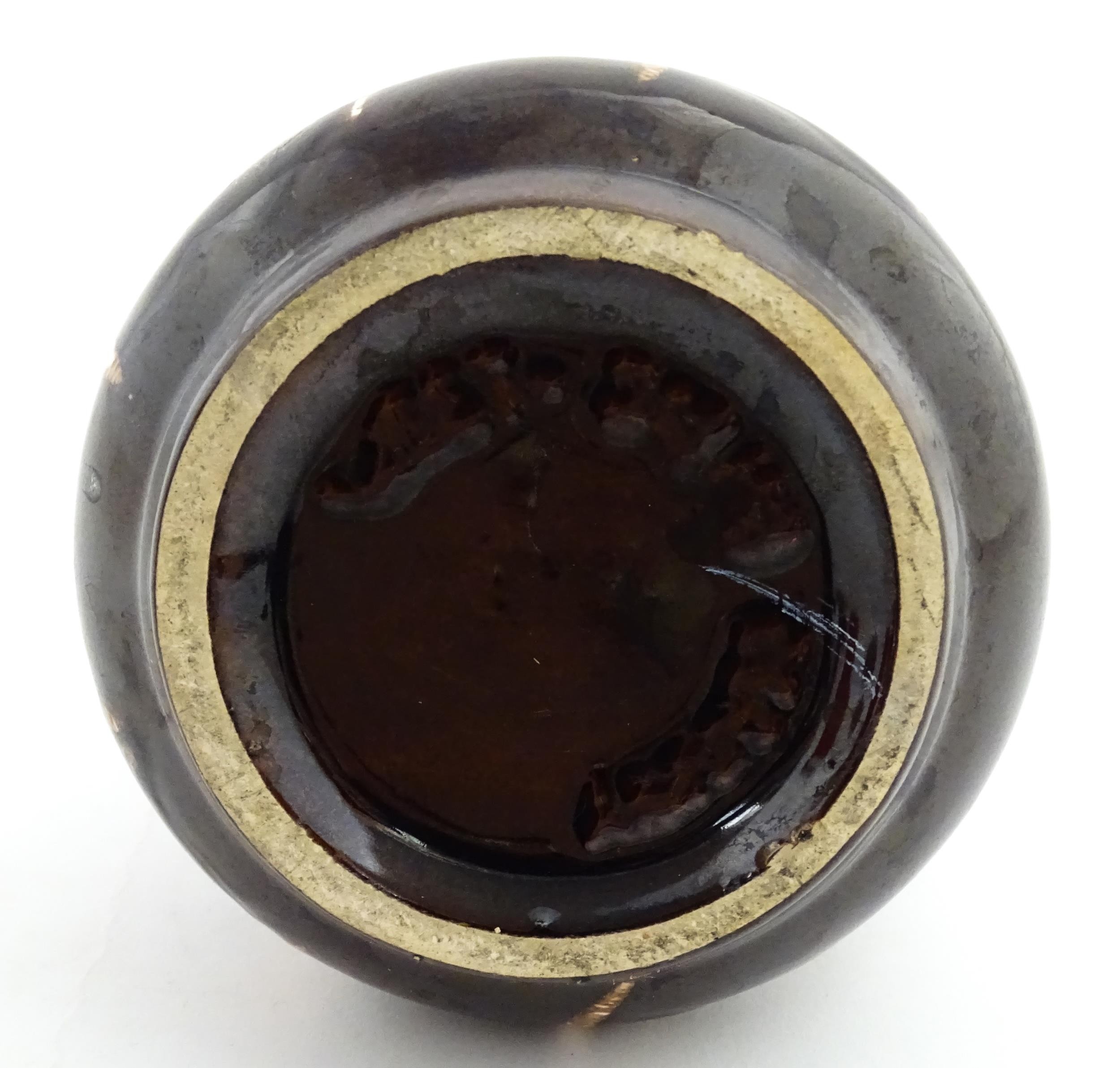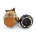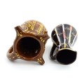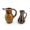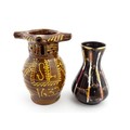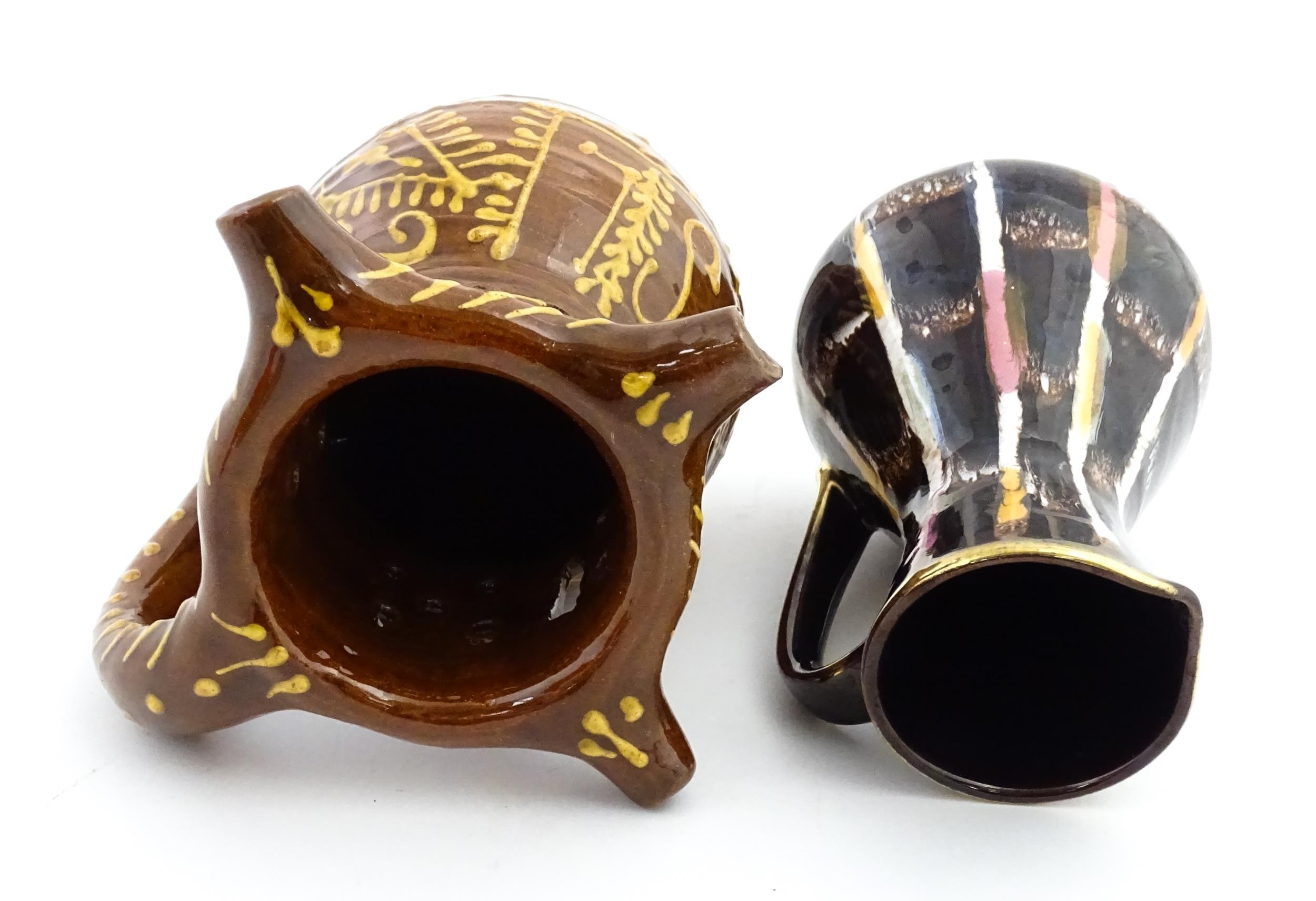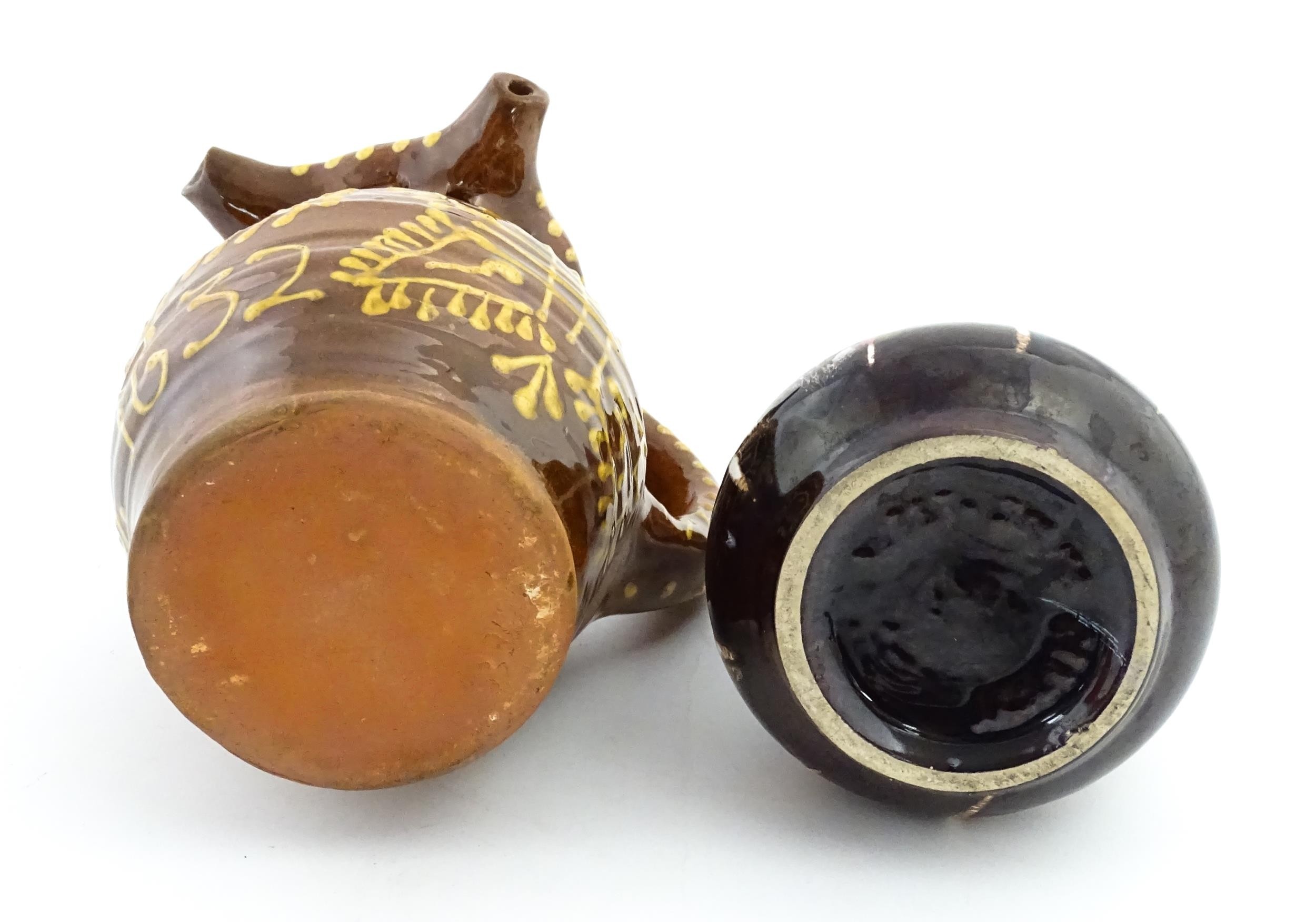 An earthenware puzzle jug with slipware decoration having a pierced neck, decorated with the initials 'SL' and number '1632'. Together with a West German jug. Largest approx. 8 1/4" high (2)