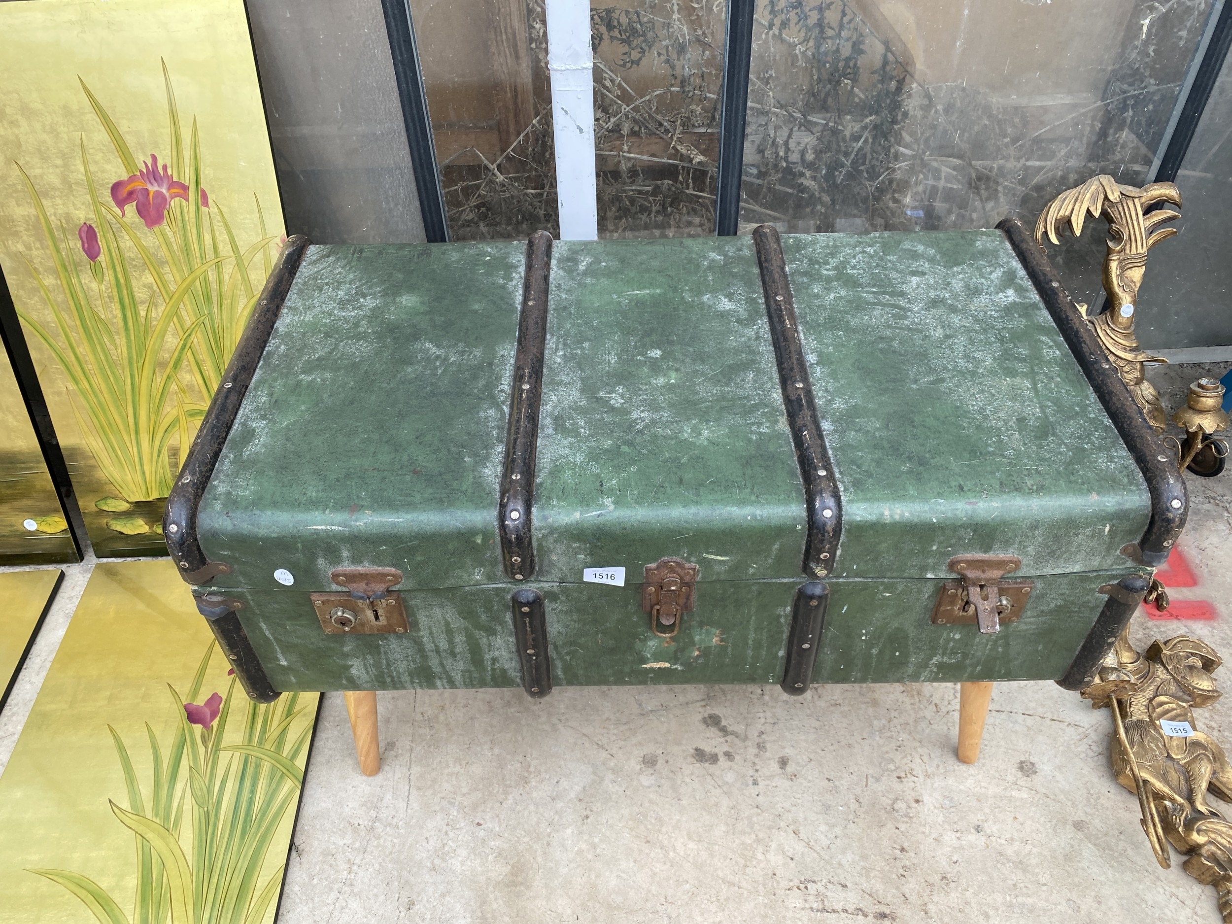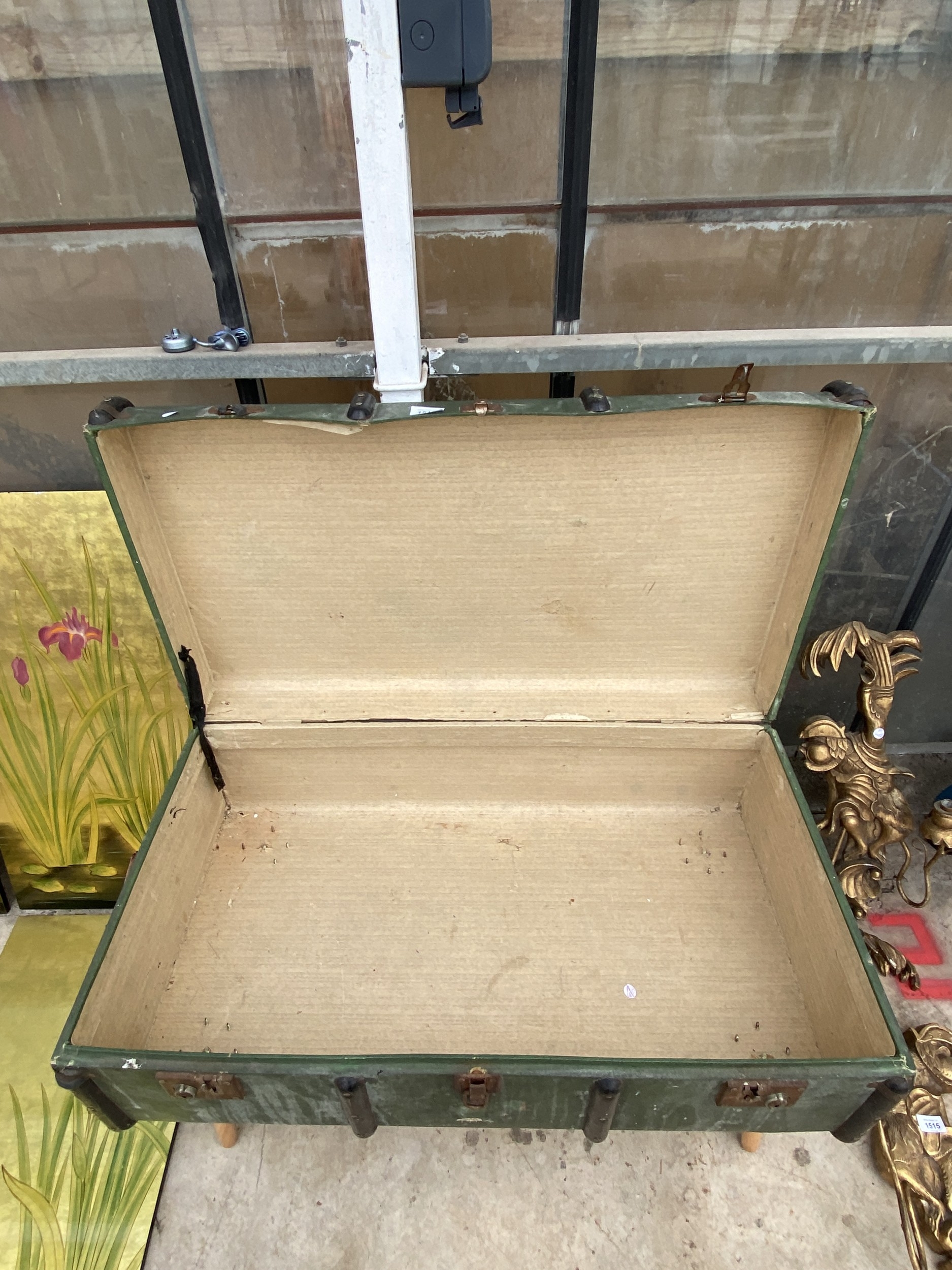 A VINTAGE COMPRESSED FIBRE TRAVEL TRUNK TABLE