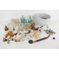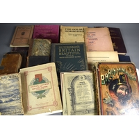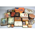 A group of vintage metal tins and wooden boxes of various sizes and designs, together with a comical dog print after Boris O Klein