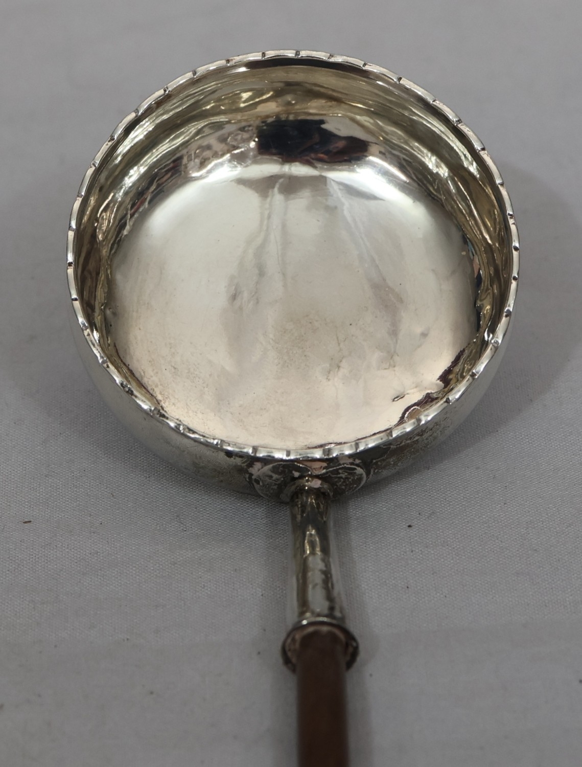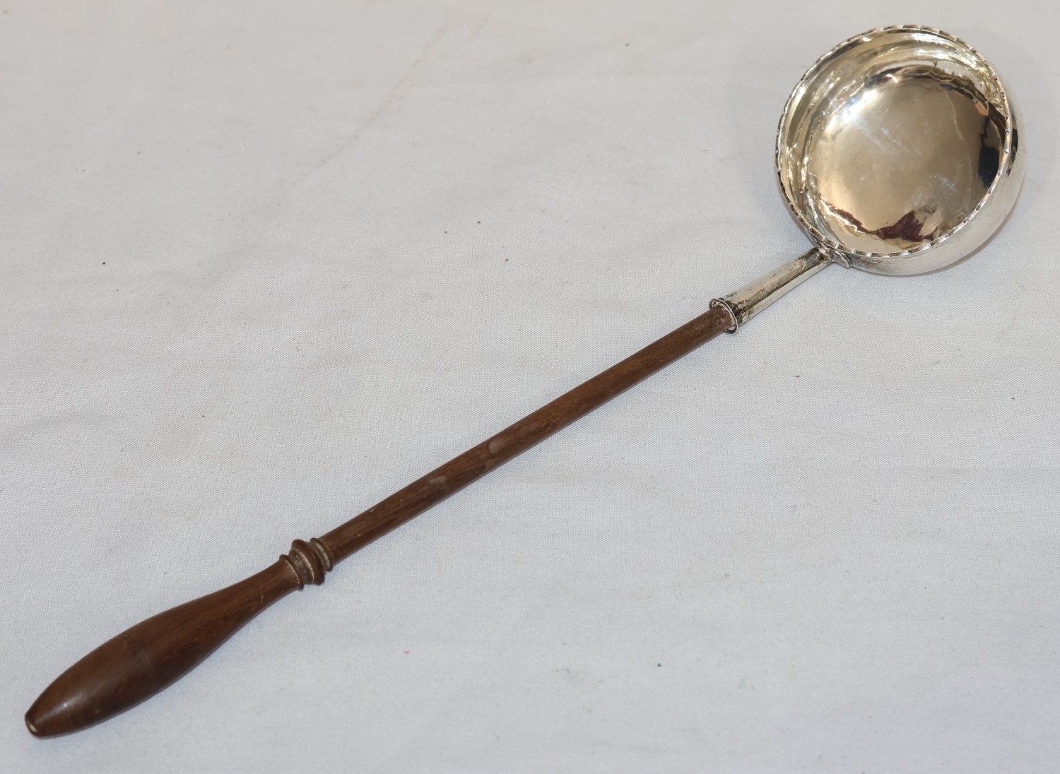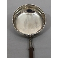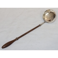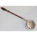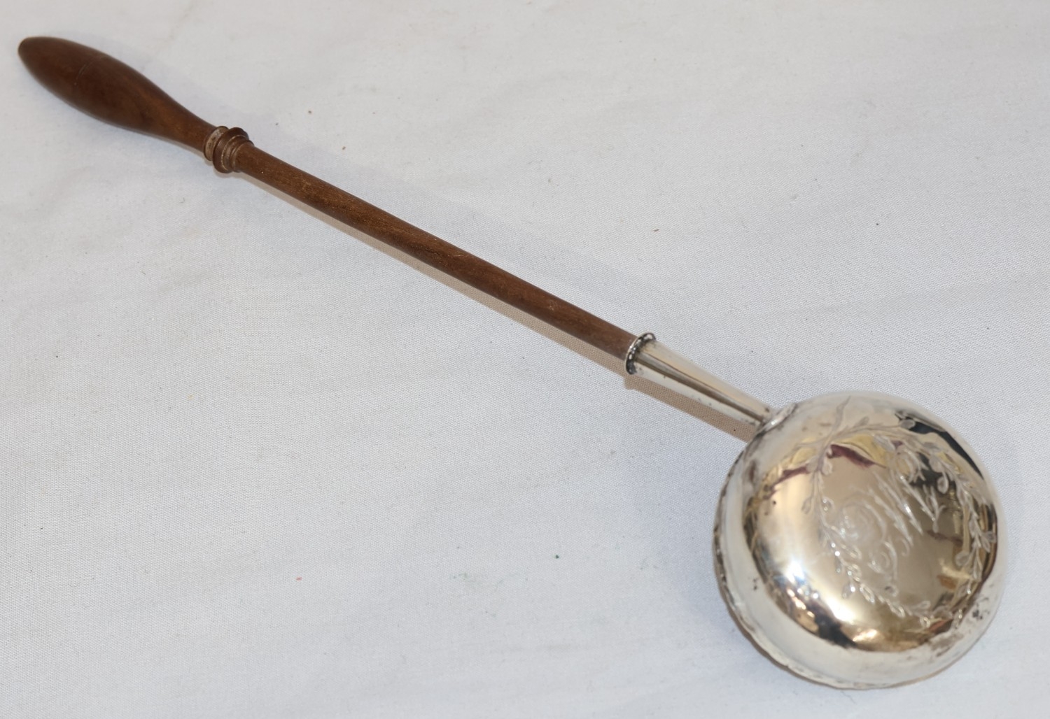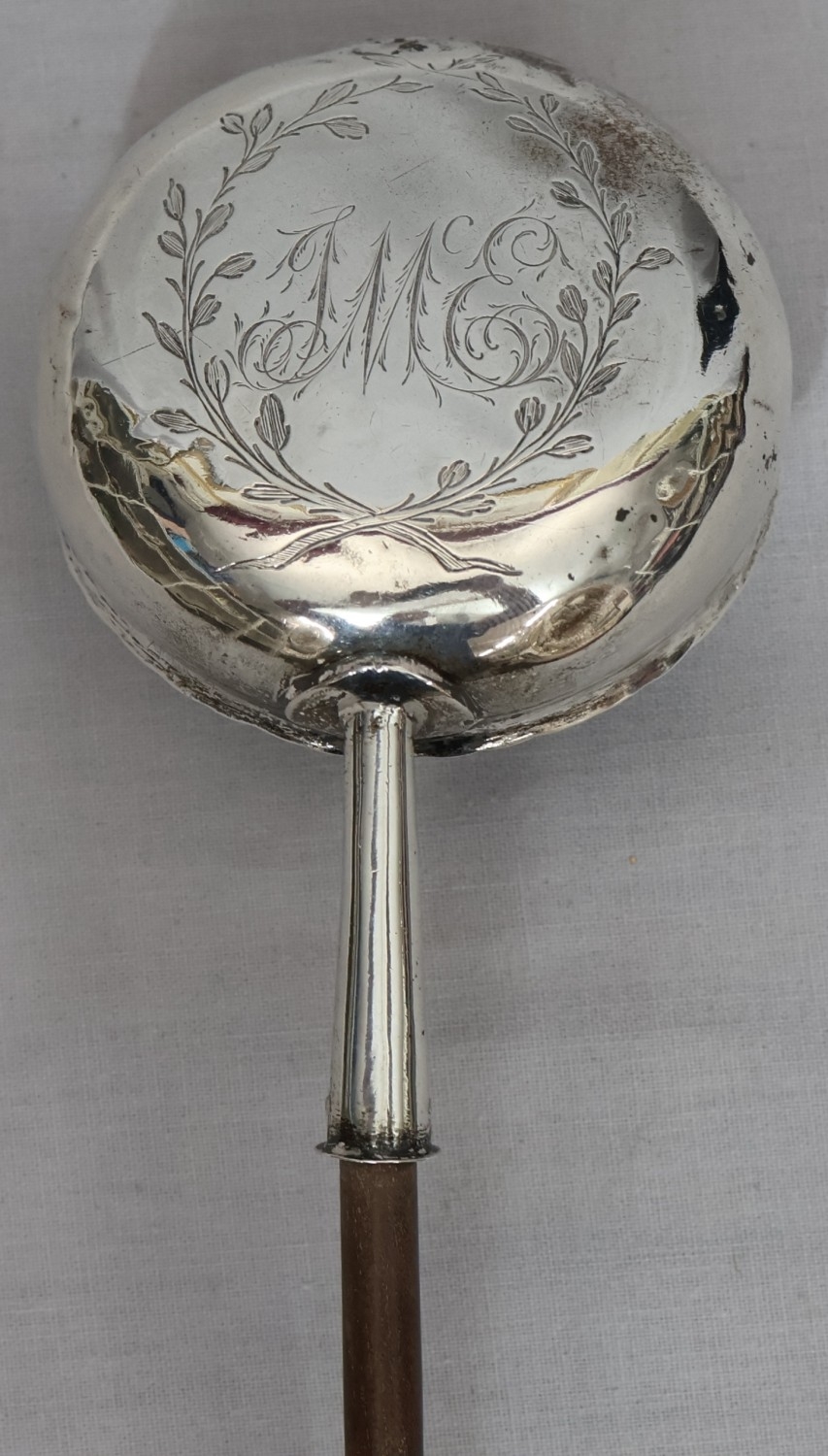 A Georgian silver coloured metal round bulbous shaped punch ladle with turned wooden handle, engraved to base of bowl with monogram, unmarked, overall weight 1.2oz gross