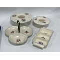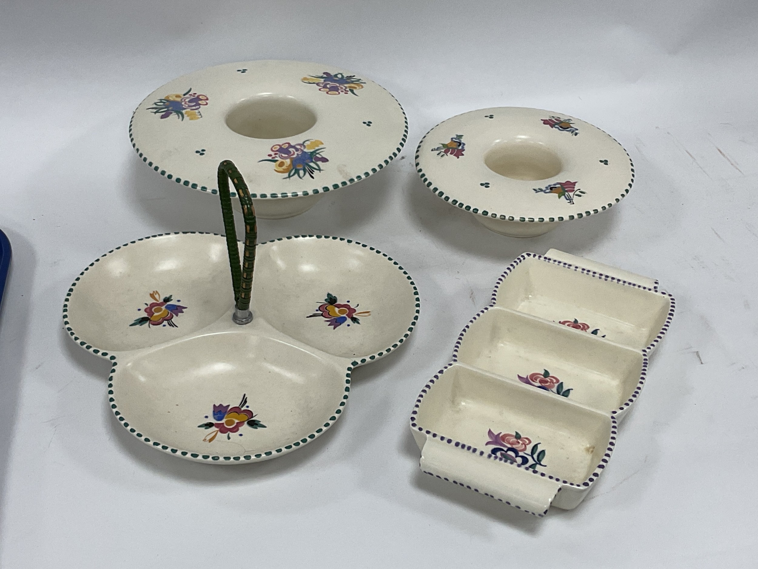 Poole Pottery Wide Brim Posy Holders 23.5 & 18.5cm diameter, two Hors d'oeuvres dishes:- One Tray.