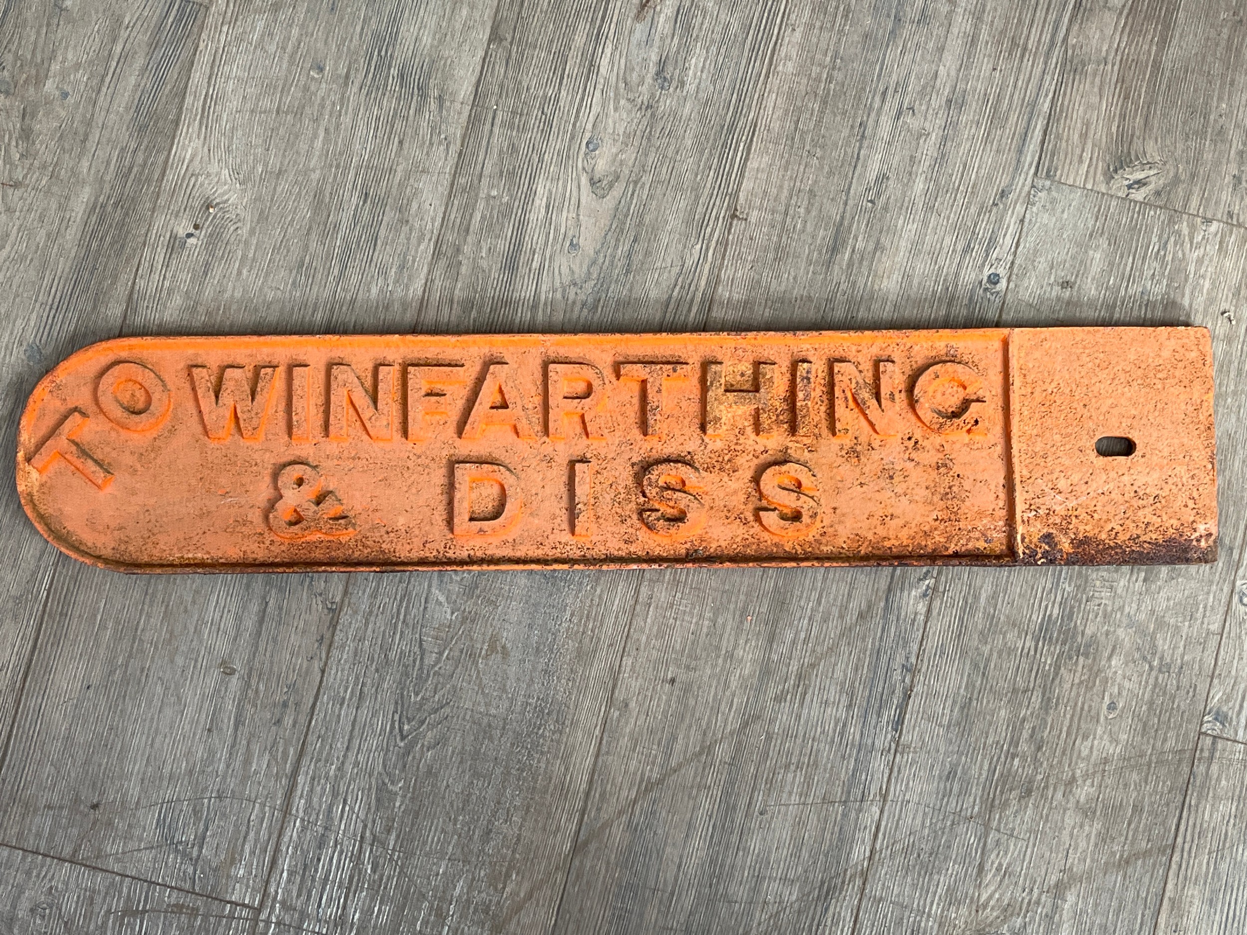 A vintage road sign TO WINFARTHING & DISS, double sided, cast iron painted in orange, possibly wartime