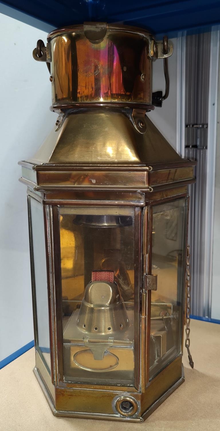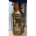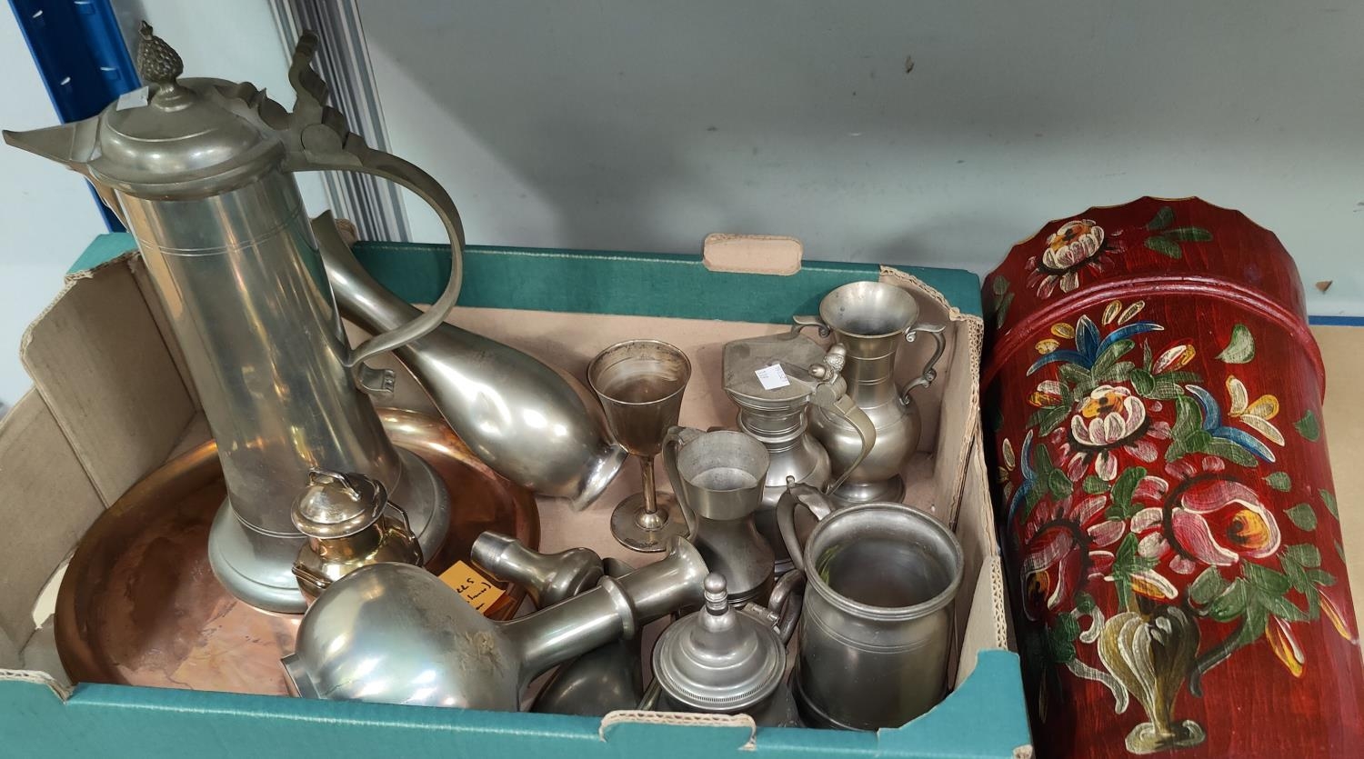 A brass ship's lamp; a painted stick stand and stick and a selection of pewter