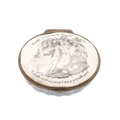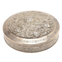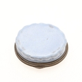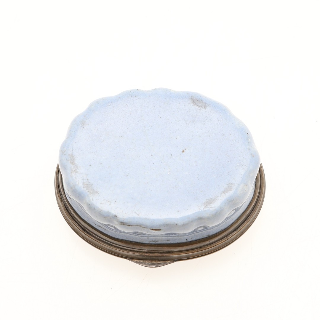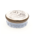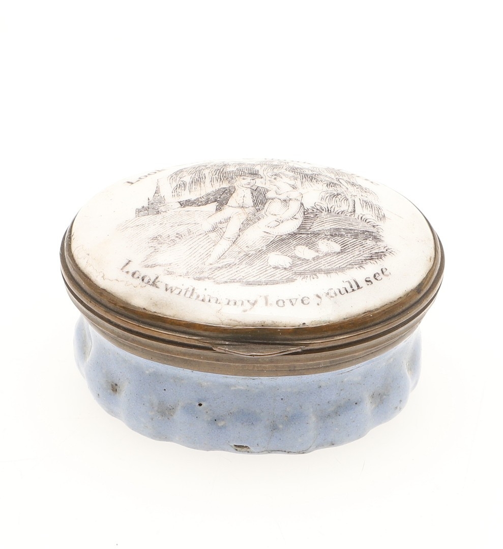 A STAFFORDSHIRE ENAMEL PILL BOX. the cover inscribed' Look without & think of me Look within my Love you'll see', pale blue base 4cm wide.