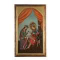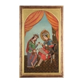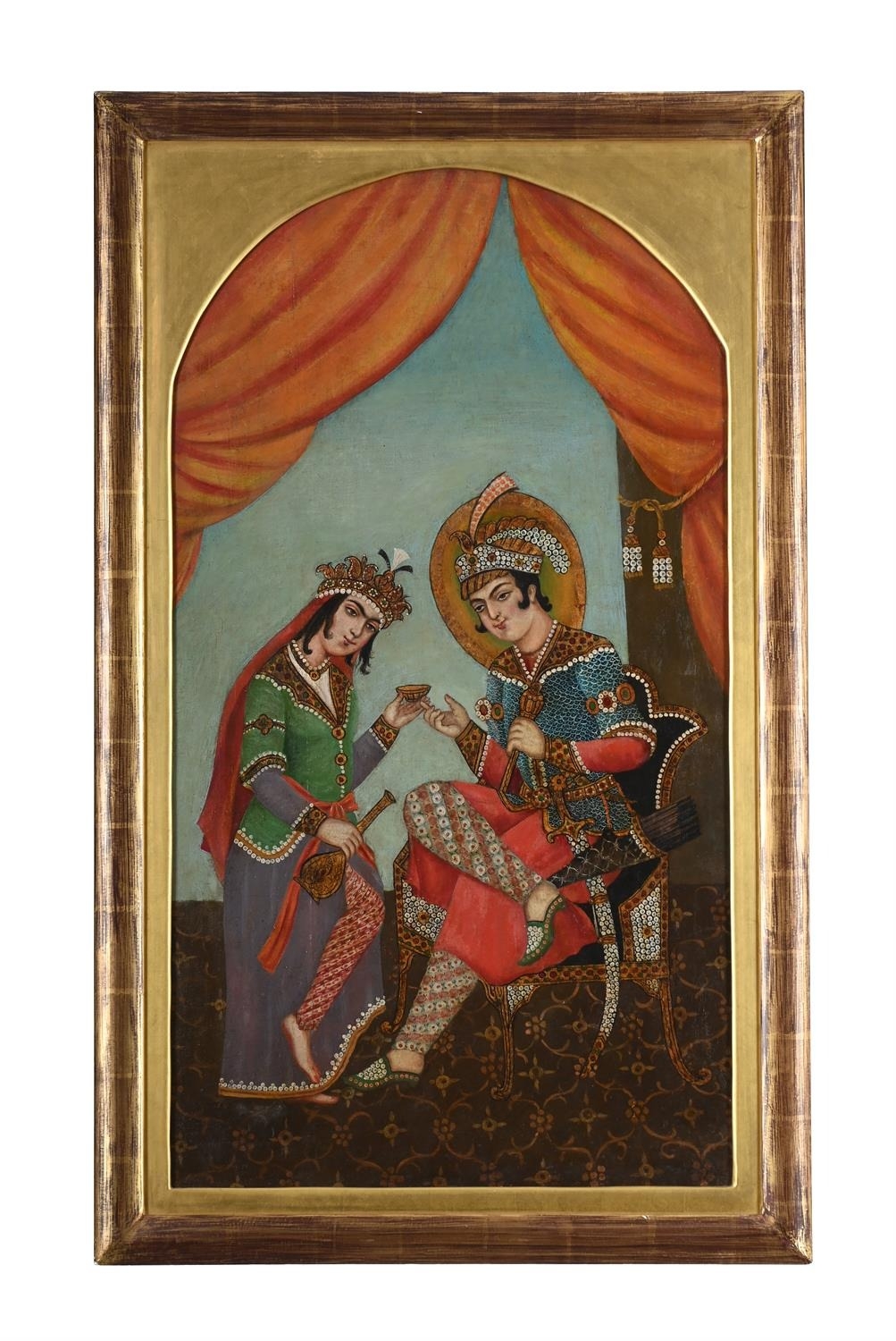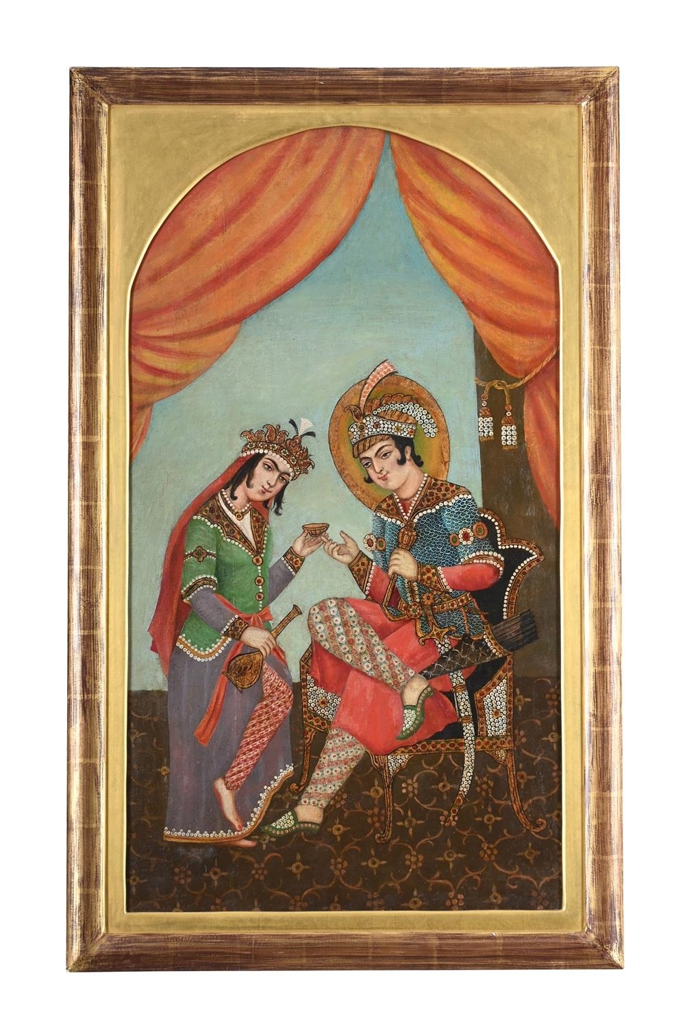 TWO LOVERSQAJAR REVIVAL IRAN, FIRST QUATER 20TH CENTURYOil on canvas89 x 49cm (35 x 19¼ in.)Measurements do not include the frame unless specified. Please note Dreweatts are not liable for damage to frames or mounts.