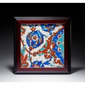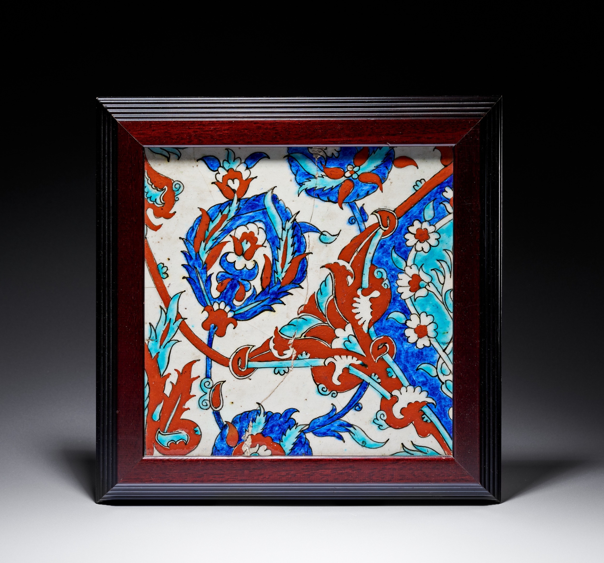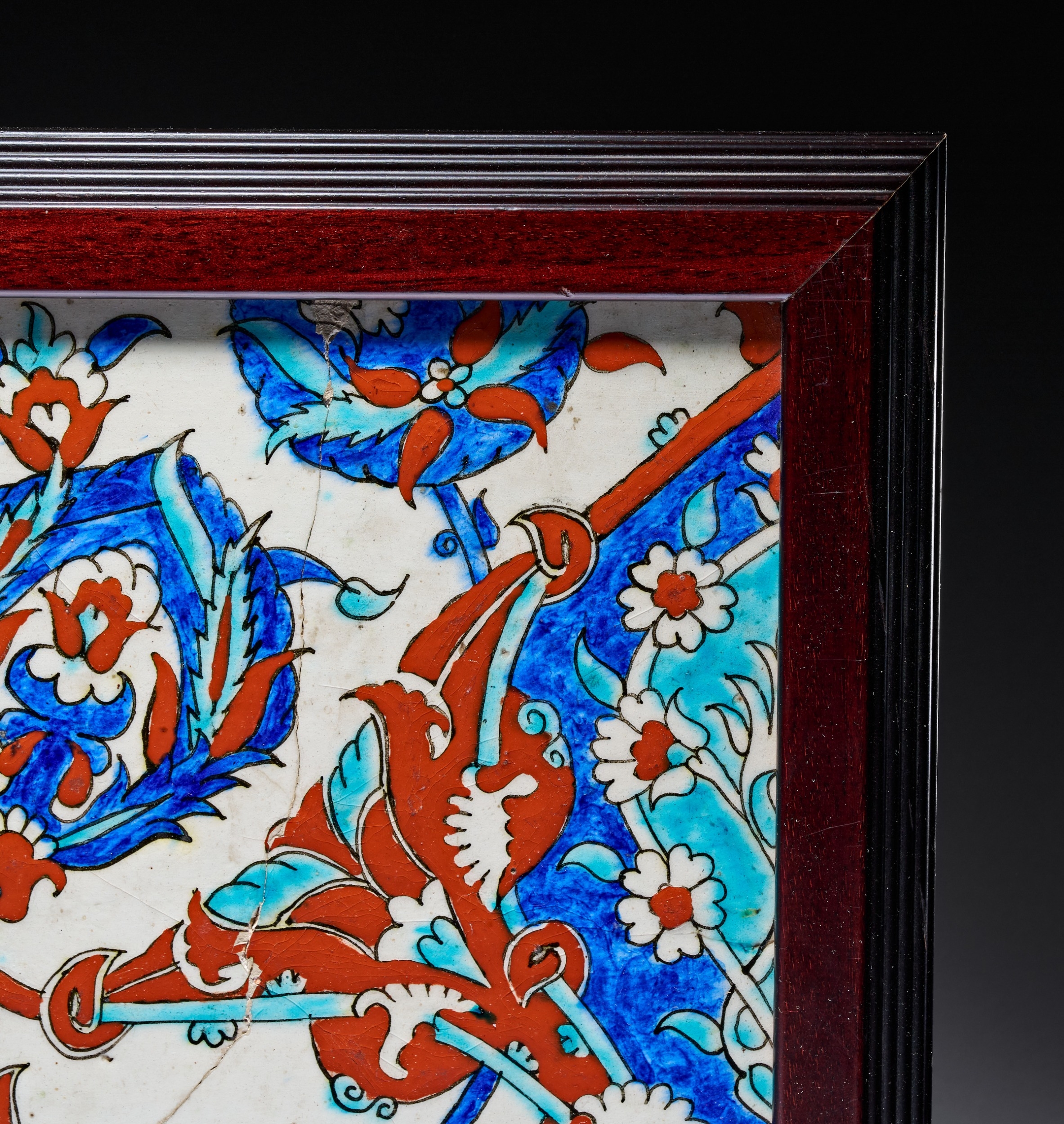AN IZNIK-STYLE POLYCHROME FRITWARE POTTERY TILE WITH FLORAL AND SAZ LEAF DECORATION, TURKEY, 19TH CENTURY