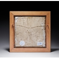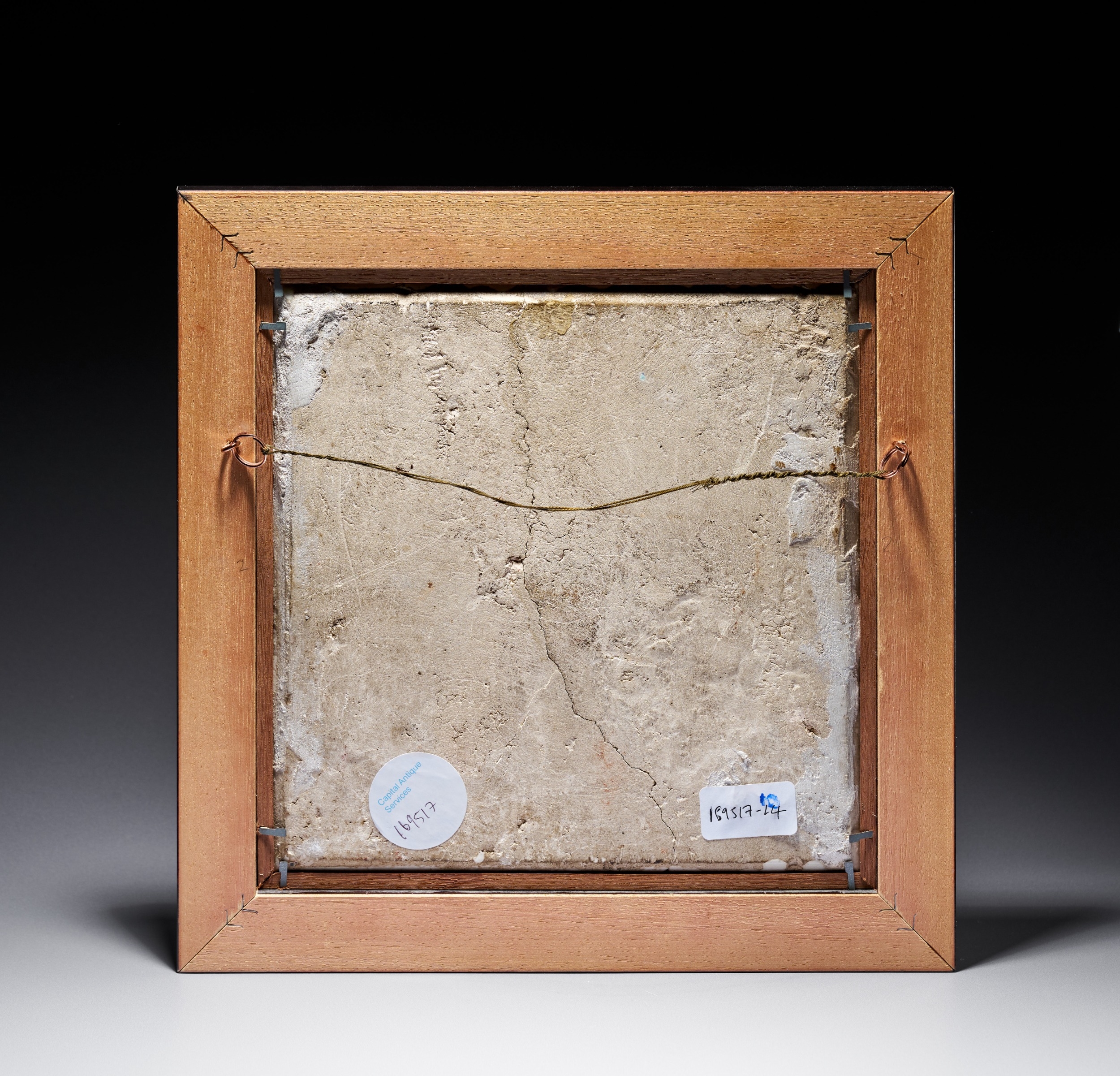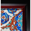 An Iznik-style ceramic tile featuring underglaze polychrome decoration on a white fritware body. The composition is dominated by a large, serrated saz leaf in red and turquoise with black outlines. The decoration includes composite floral motifs, stylized blossoms in cobalt blue and red, and sprays of small white flowers against a turquoise field. The palette utilizes cobalt blue, turquoise, and a thick, slightly raised Armenian bole red. The tile is housed in a modern, dark-stained stepped wooden frame. The reverse of the tile shows a rough, unglazed surface with remnants of old mortar. No historical maker marks, signatures, or inscriptions are visible on the ceramic body. The reverse of the frame features two modern adhesive inventory labels. One circular white sticker reads Capital Antique Services with the handwritten digits 169517. A second rectangular white sticker features the handwritten code 169517 - L 27.