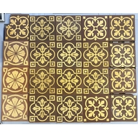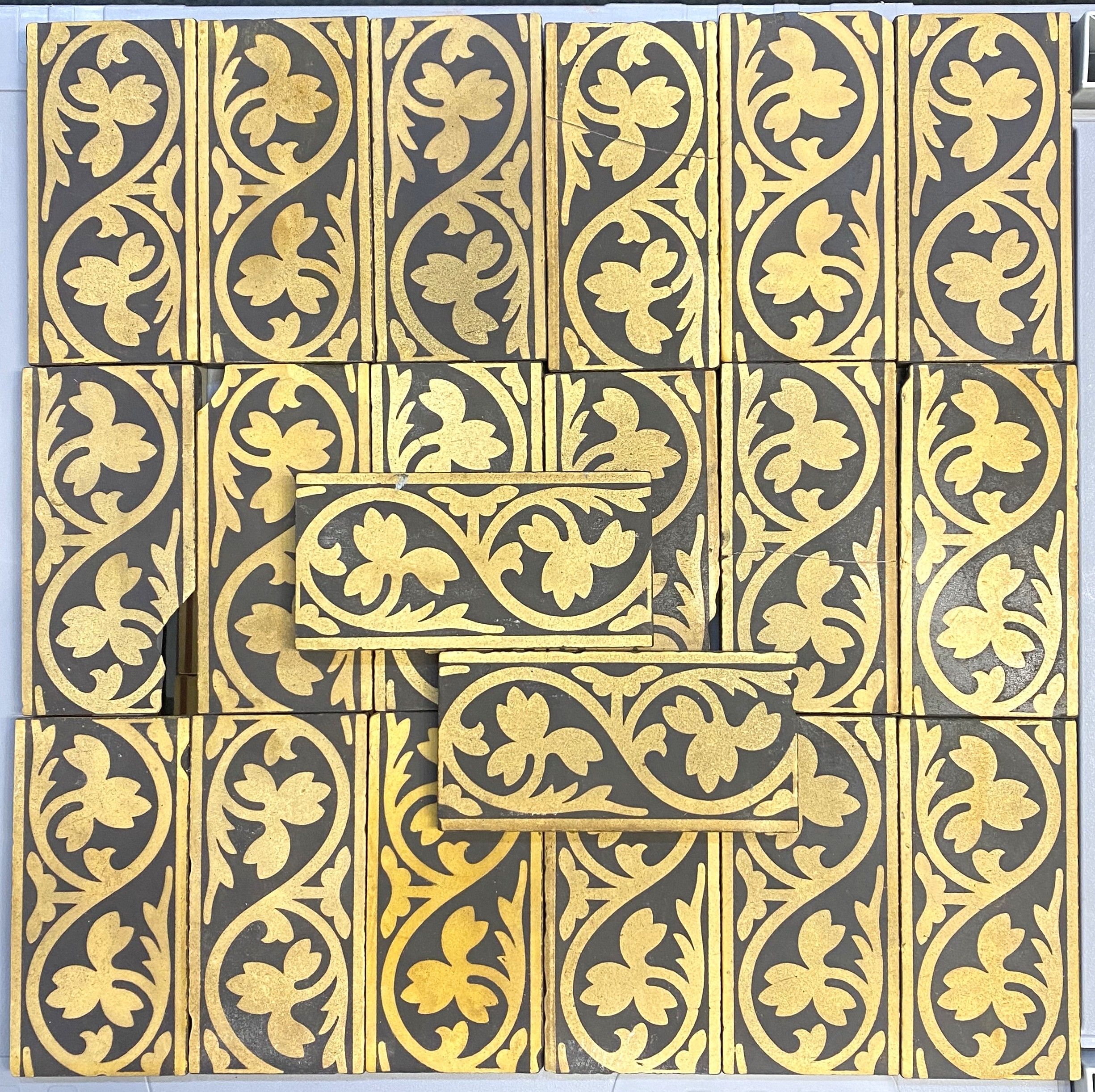 Twenty W Godwin encaustic border tiles with repeating foliate design in buff and black 15.2cm by 7.5cm (a/f)